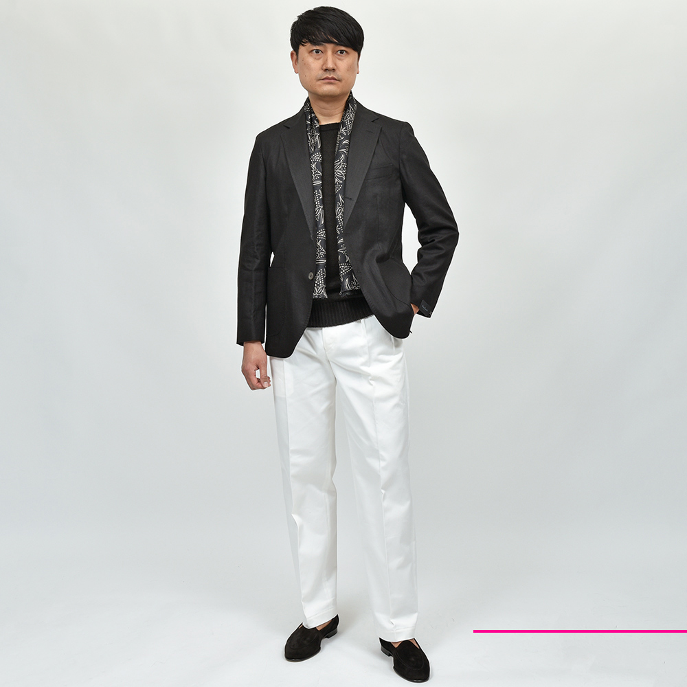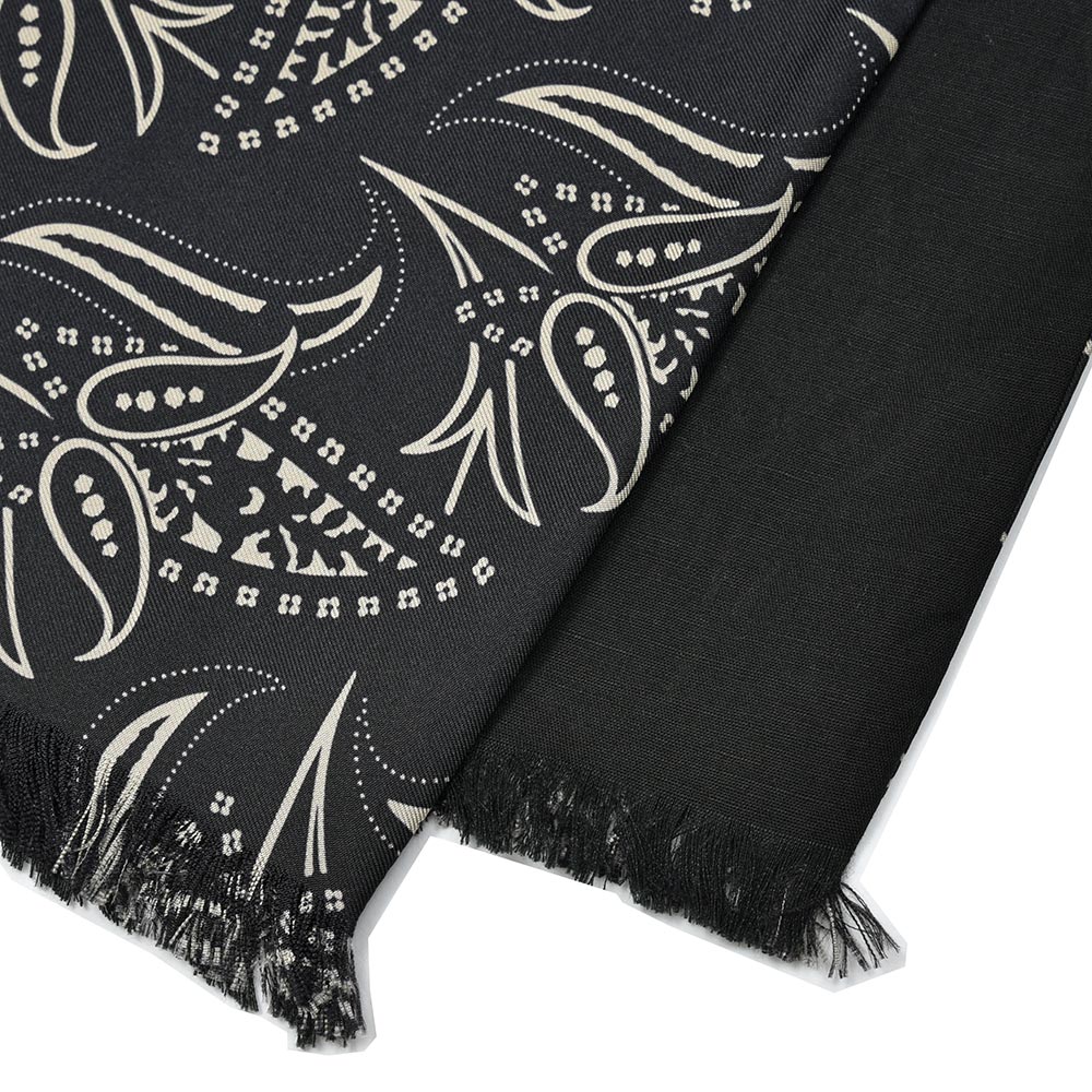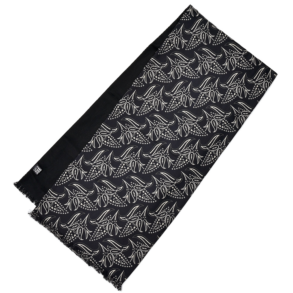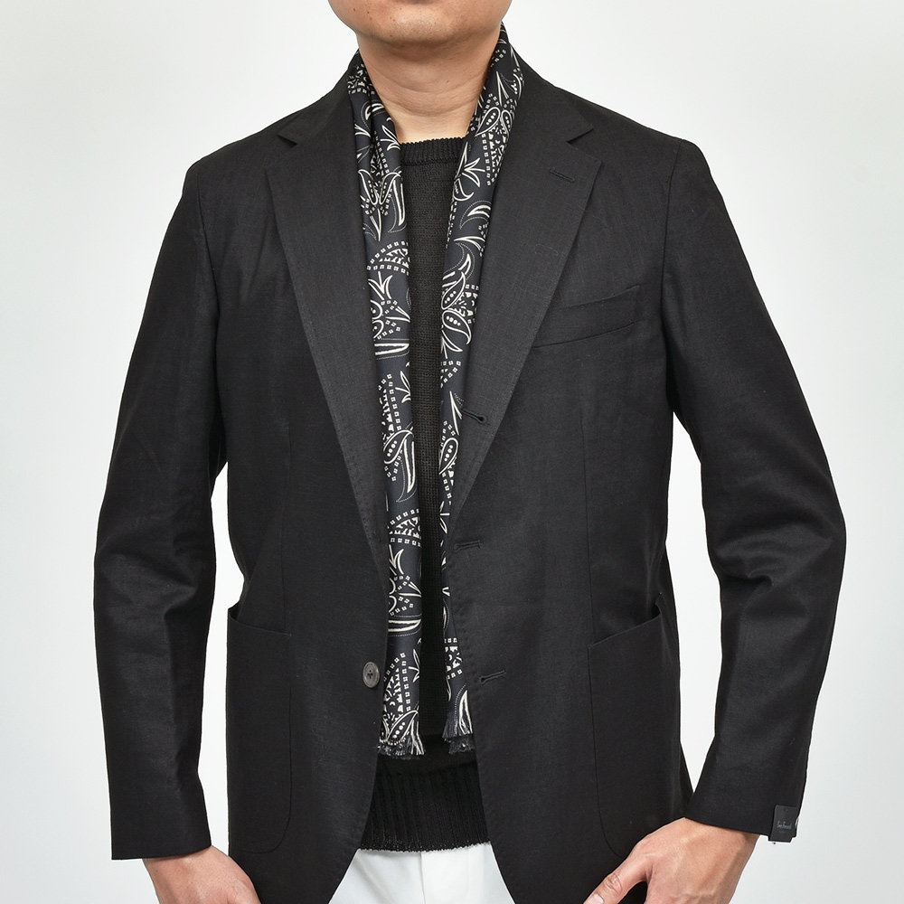 柄面はイタリア製のシルク生地を使用し、無地面にはコットン×リネンのサラリとしたドライなタッチの両A面のスカーフは、30×140の首から垂らすサイズ感。カットソーやニット一枚にアクセントとして巻くというよりも、ジャケットやコートといったアウターに華を添えてくれる一品です。