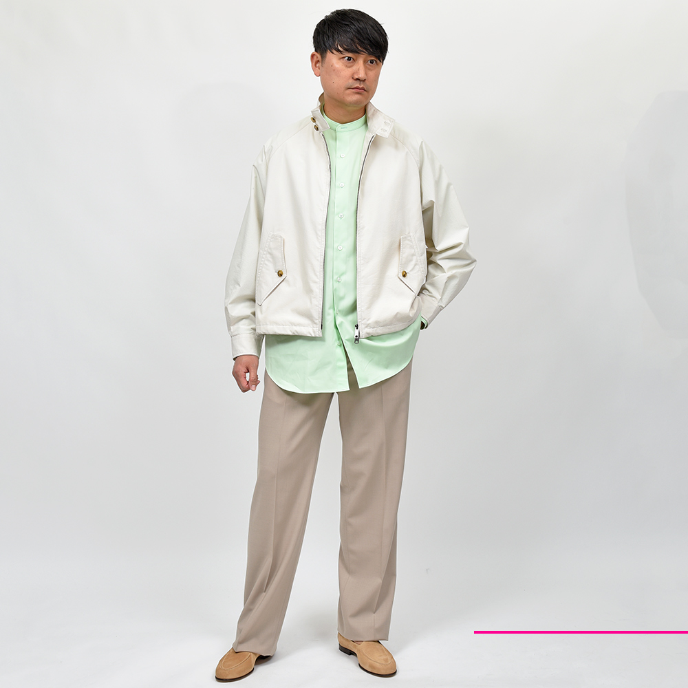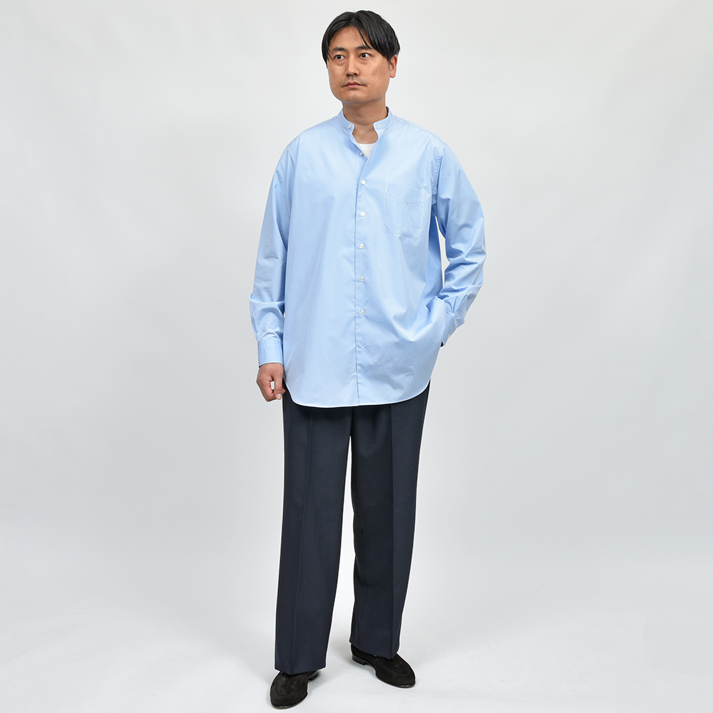 サイズMがジャストサイズです。ドロップショルダーで身頃もゆとりがあり、ゆるい雰囲気で着用しています。モダンなサイジングにバンドカラーがマッチした一枚です!