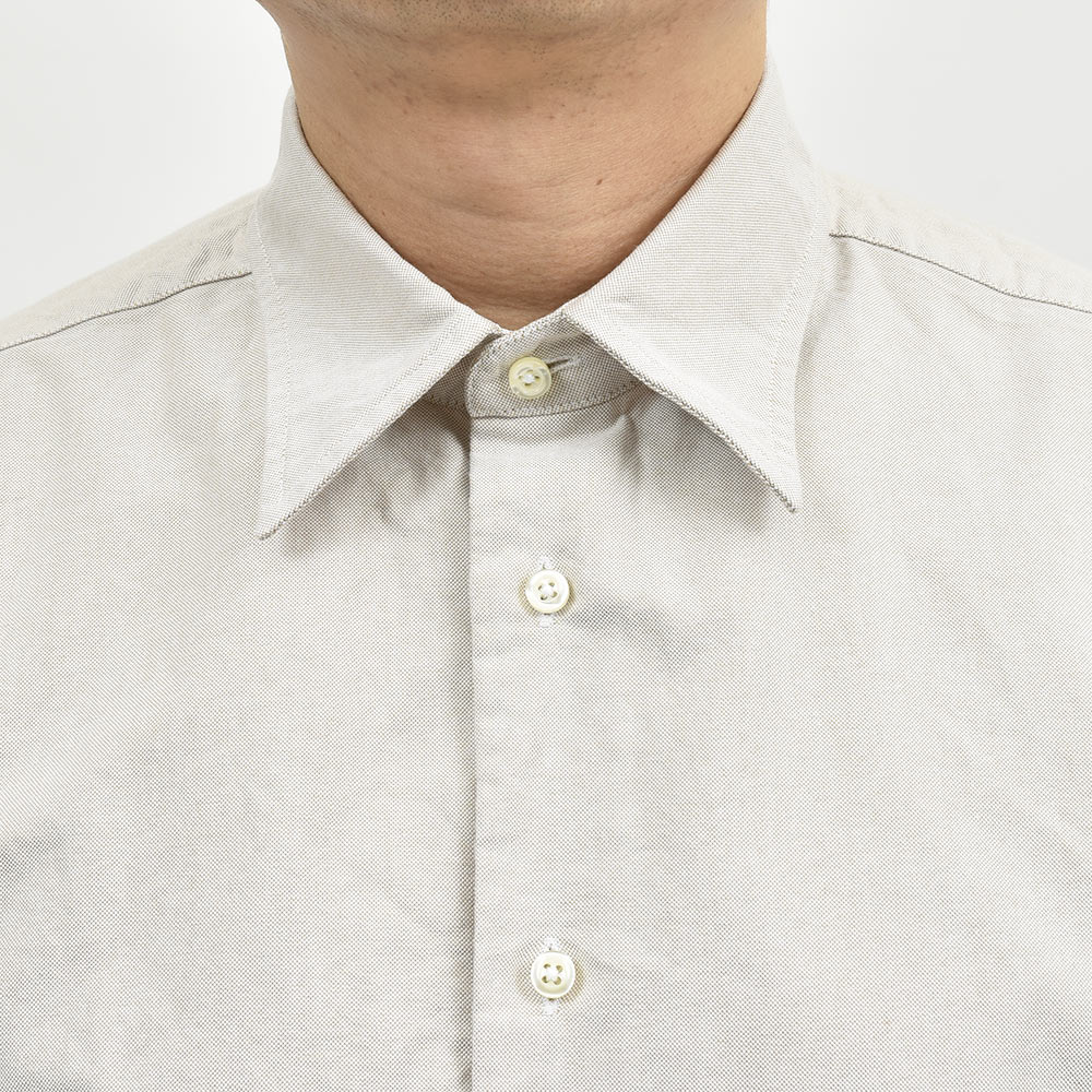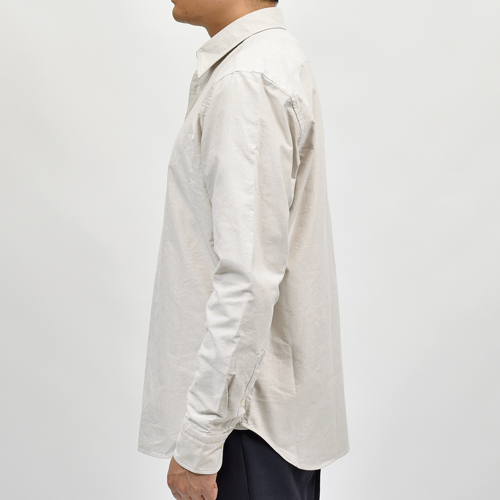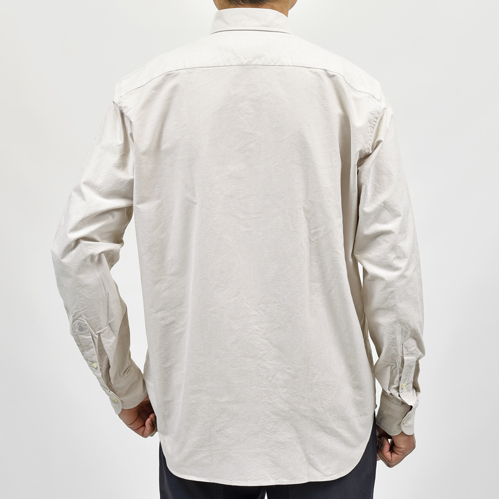 程良くガシッとした質感を残したオックスフォード生地を使用したこちらは、ゆとりのあるFITを採用したレギュラーカラーモデルになります。一見すると端正なカジュアルシャツですが、サイズ感で現代的な味付けを施したインでもアウトでもサマになる一品です。
