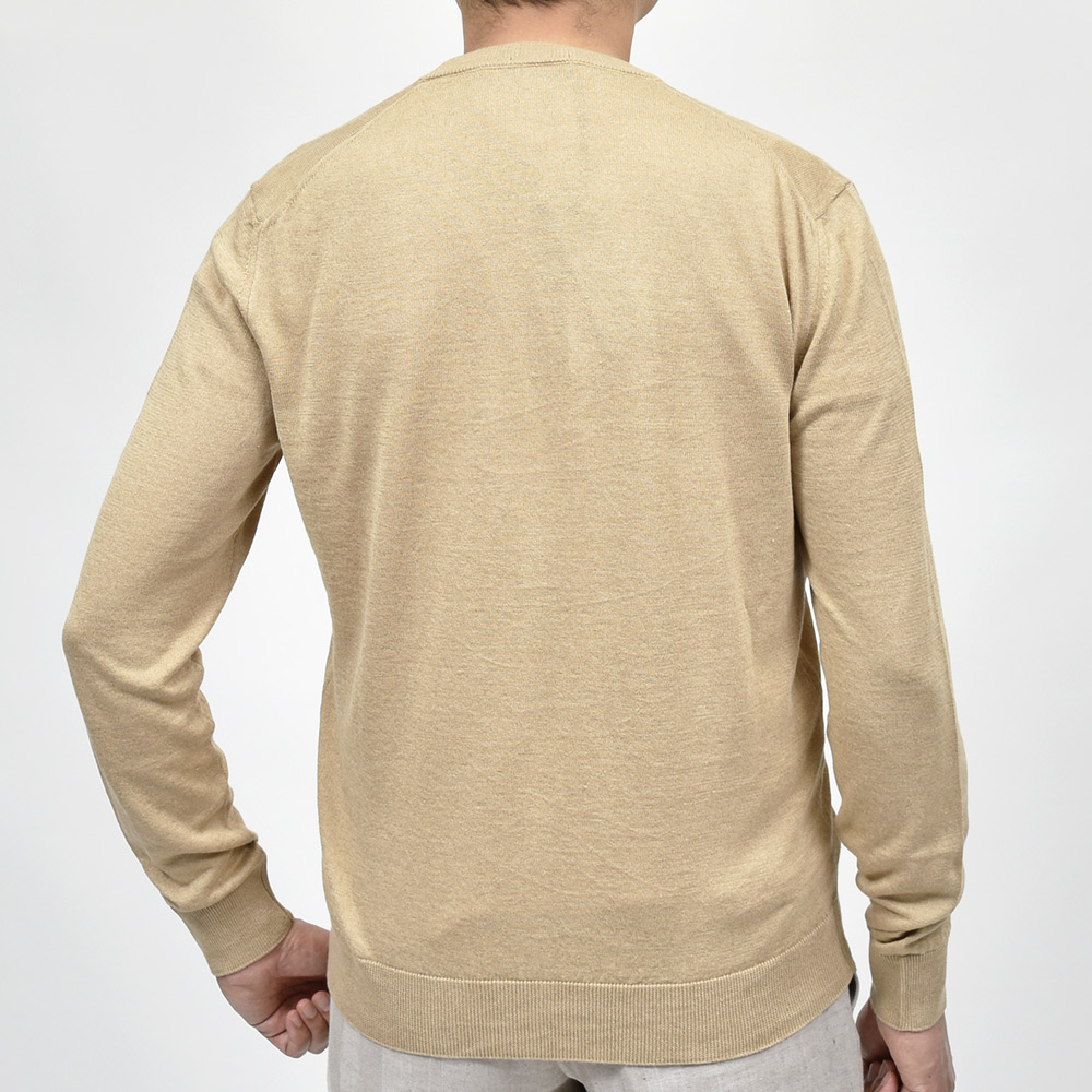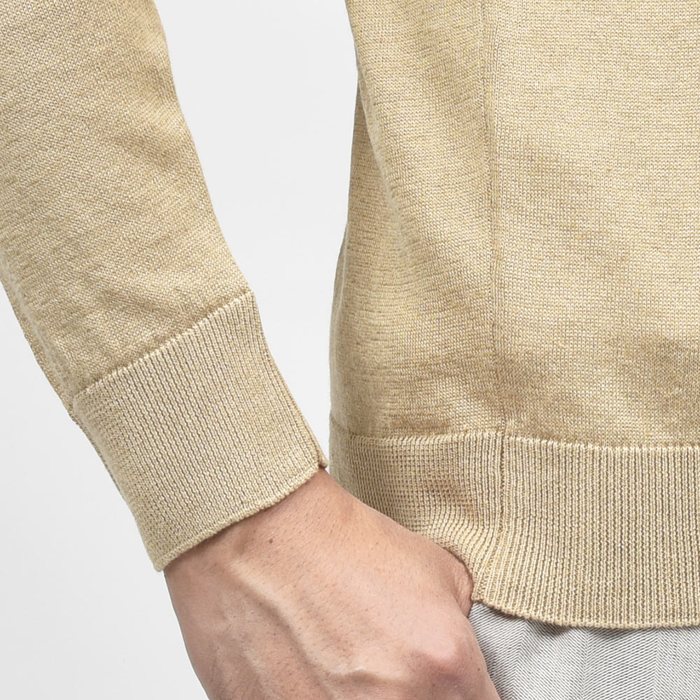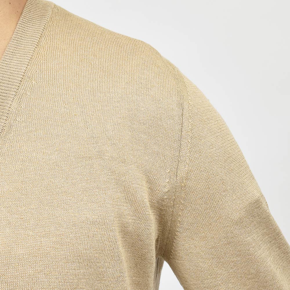 リネンのドライなタッチと少しトロミのある質感に、コットンのしなやかさが合わさった実用的なニット素材は、ハイゲージの薄手な生地感が清涼感のある一品。真夏の羽織物としてはもちろんですが、リネン特有の素材感がライトアウターのインナーに差し込んでも、良い雰囲気のスタイルを作り上げてくれます。