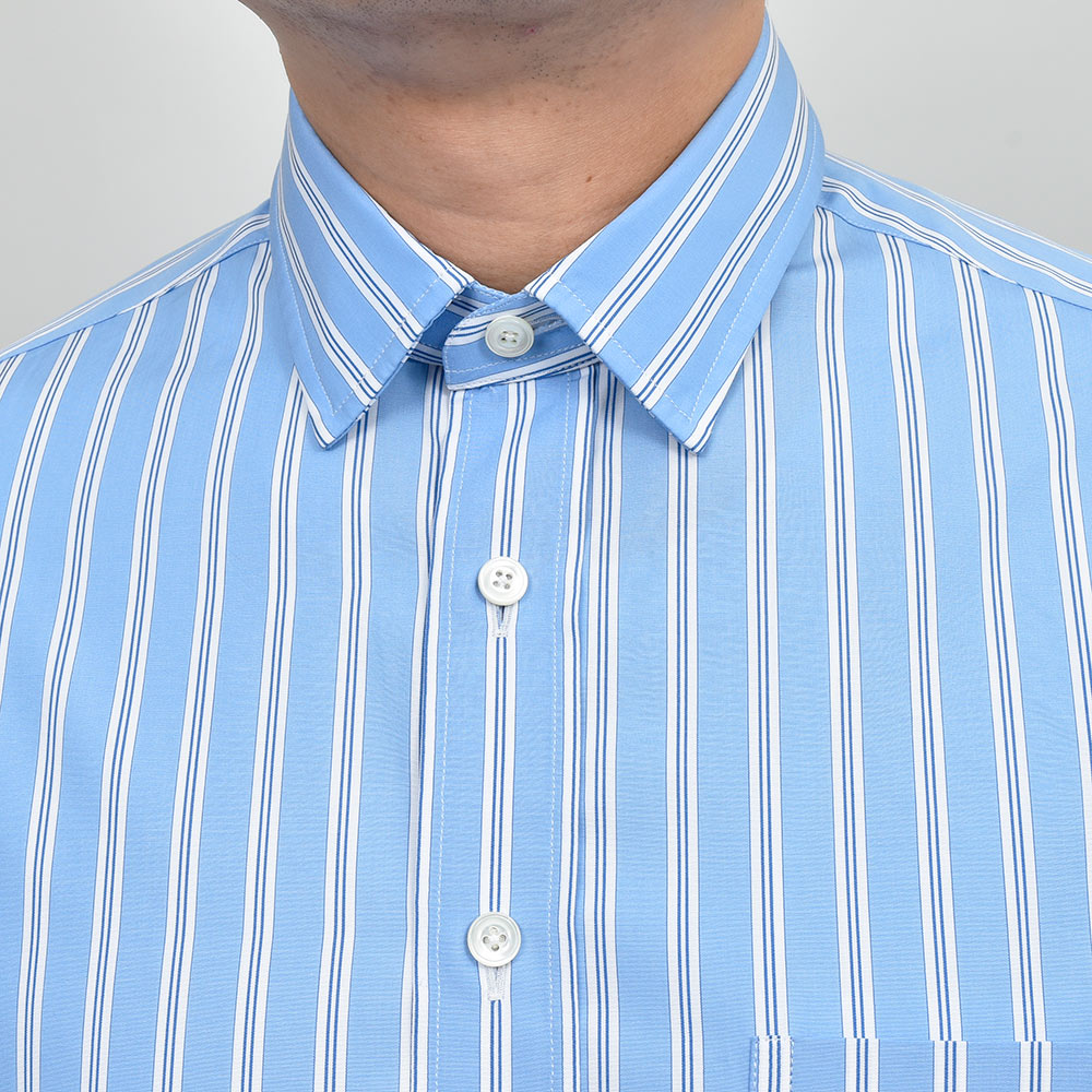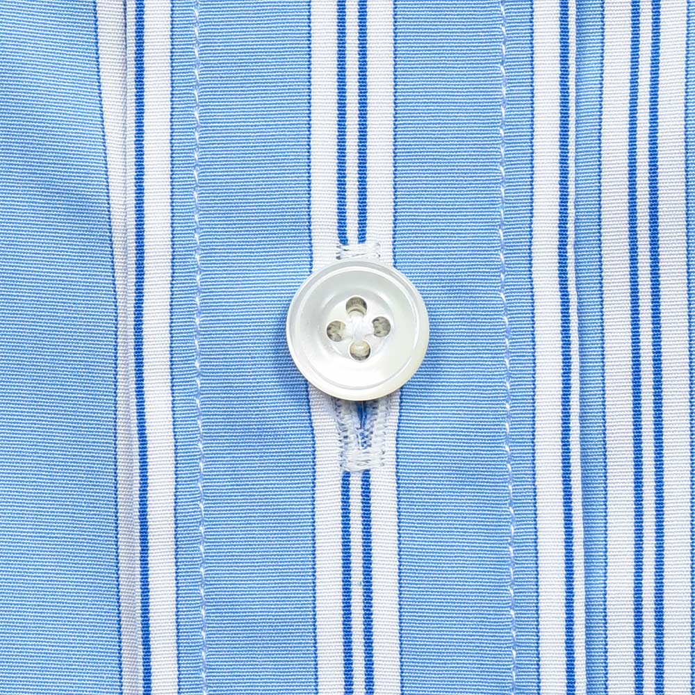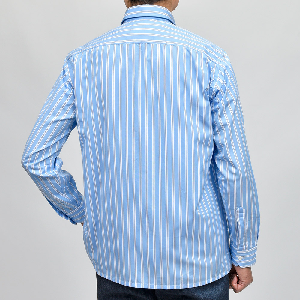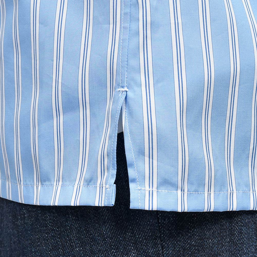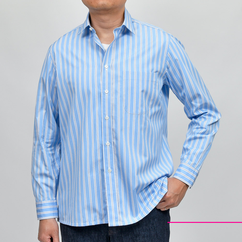 ドロップがなくスクエアにカットしたリラックス感のあるシルエットが魅力のモデル“TAHITI(タヒチ)”。ややゆったりめなサイズバランスですが、肩幅は広くしすぎないようにバランス調整されています。こちらは衿先が5cmのショートポイントカラーが採用されており、襟の主張が控えめなため程よくカジュアルな印象をもたらせてくれます。パリッとしたハリのあるコットン素材に、色数を抑えたマルチストライプが程よい存在感。また、ボタン・アーム・サイドスリット閂止めの3箇所ハンドで仕立てられています。