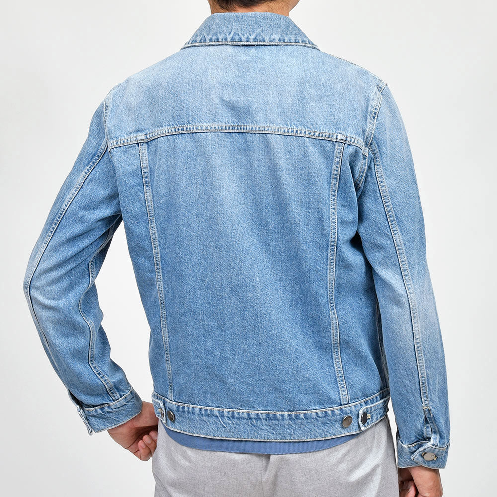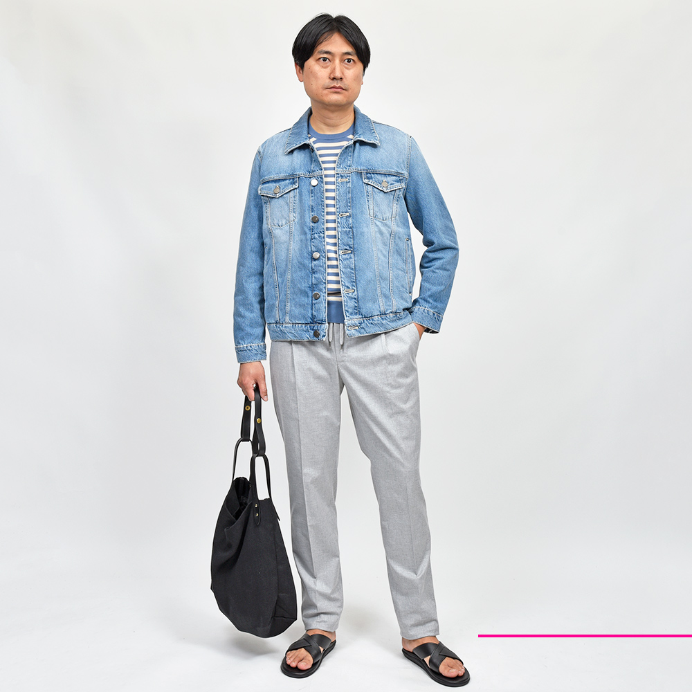 サイズ48サイズがジャストサイズです。身頃はスッキリとしたシルエット。フィッティングは気持ちゆとりがある程度です。ブリーチな色落ちが春夏爽やかなジージャンです!