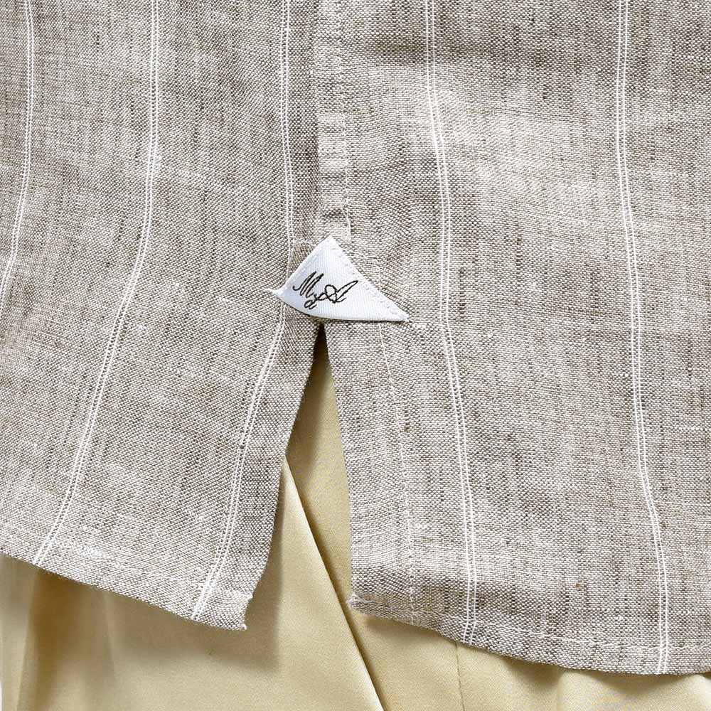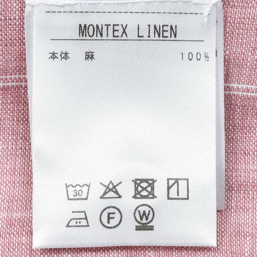 Mサイズでジャストサイズです。全体的に適度にゆとりがありダボっとして見えない、リラックスした雰囲気になります。サラッとした上質な質感のリネン素材です。
