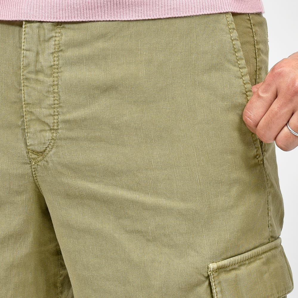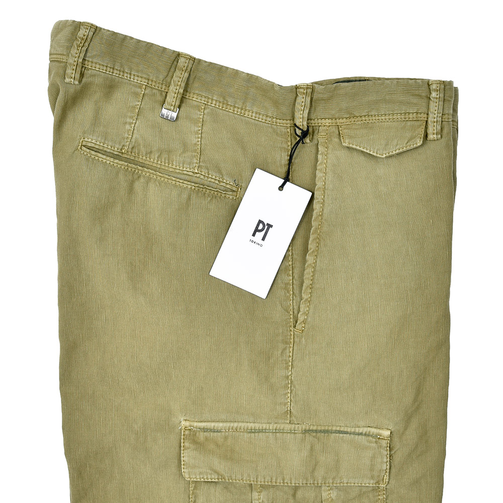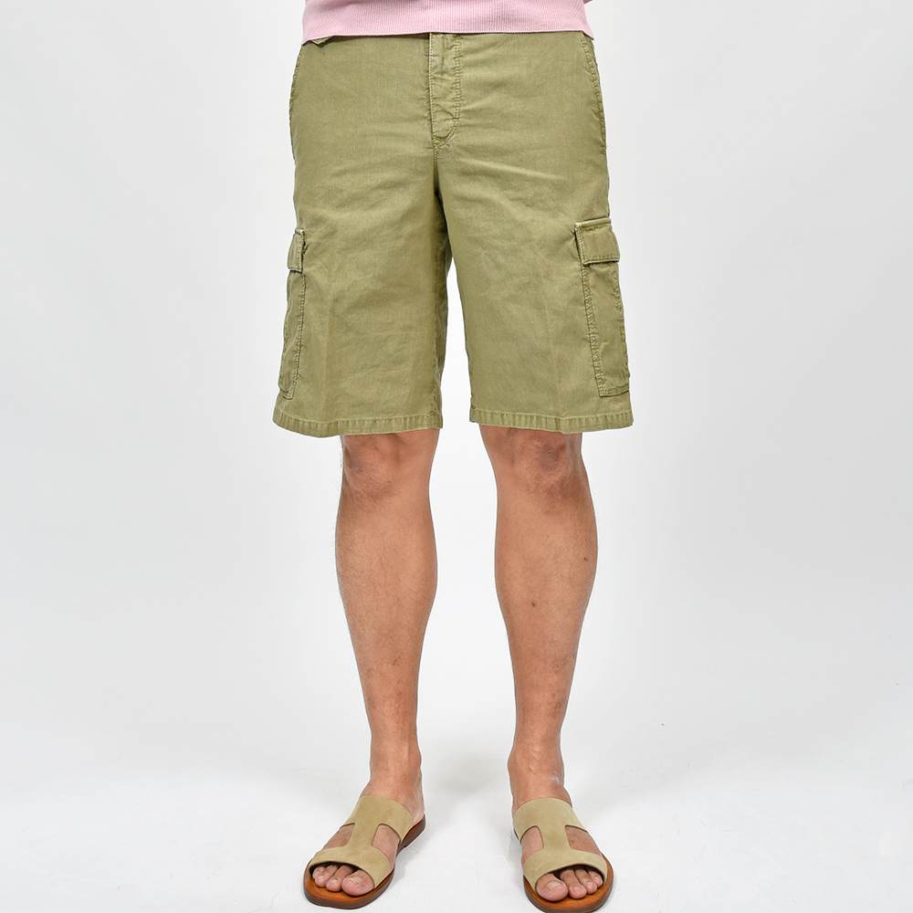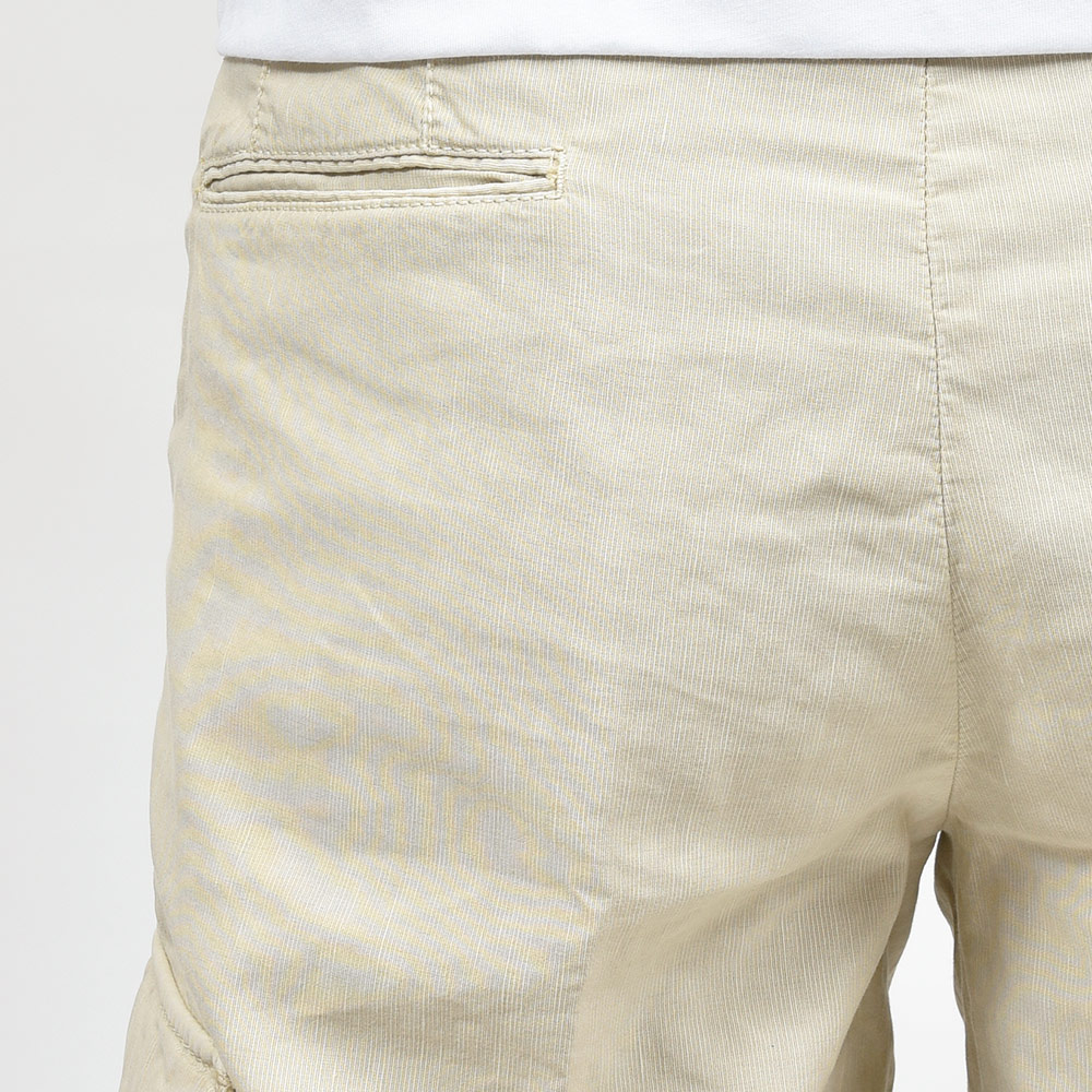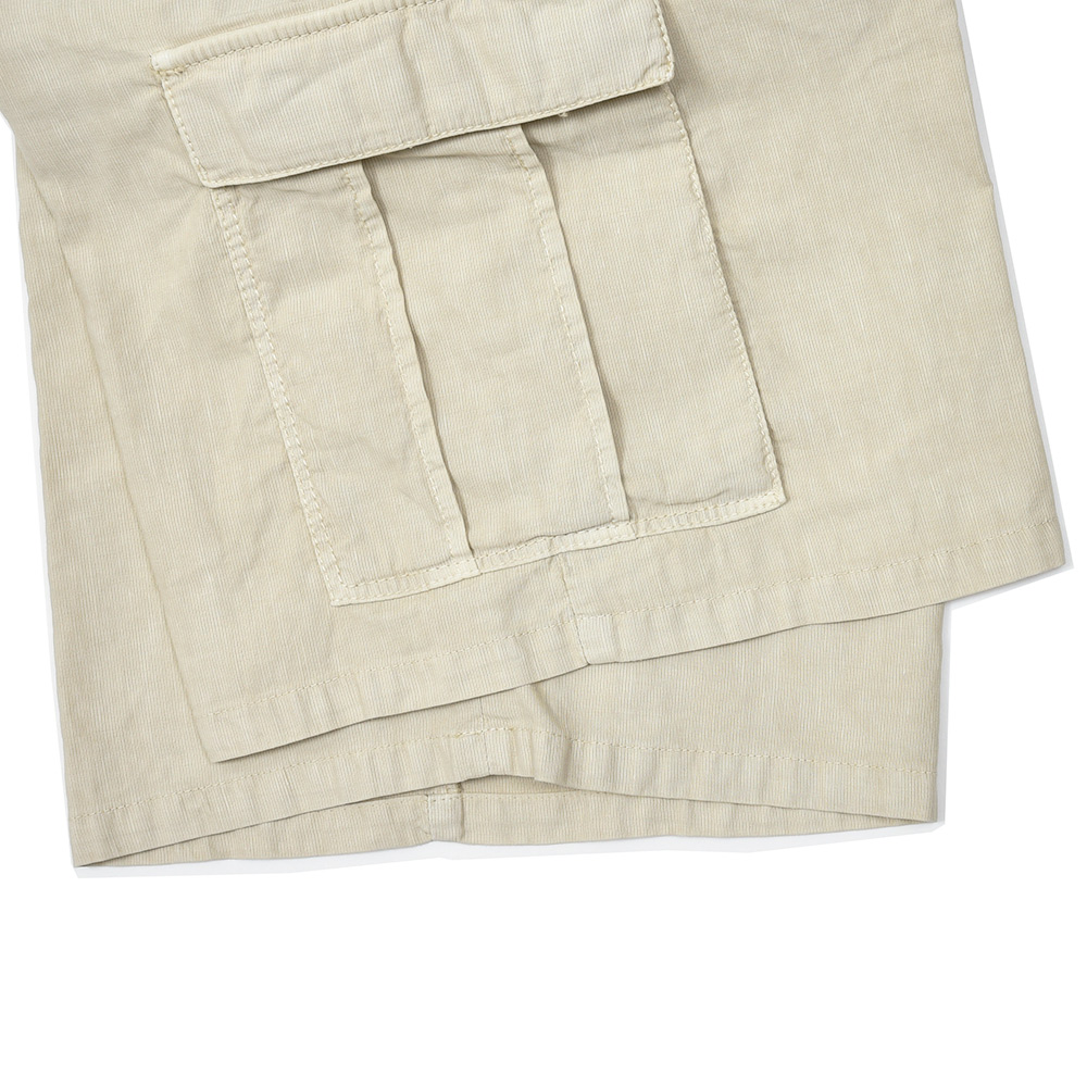 目付け340gのガーメントダイを施した生地は、コードレーンによく似た畝が入ることでドライな質感を生んでいます。PT TORINOの夏を代表する少しコンパクトなFITの“BERMUDA”ですが、こちらはカーゴポケットの付いた足回りにゆとりのあるシルエット。丈も通常のBERMUDAよりも長くなっているため、カーゴポケットとバランスの取れたシルエットを作り上げています。