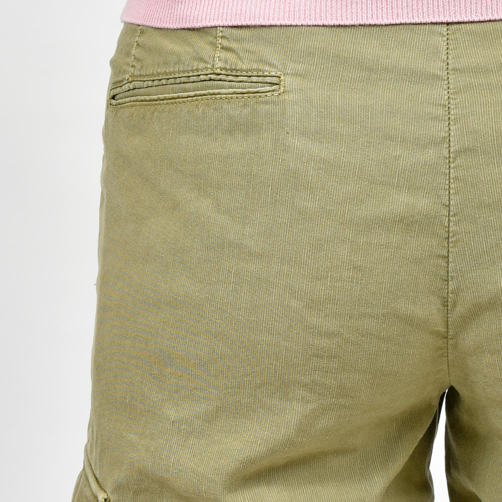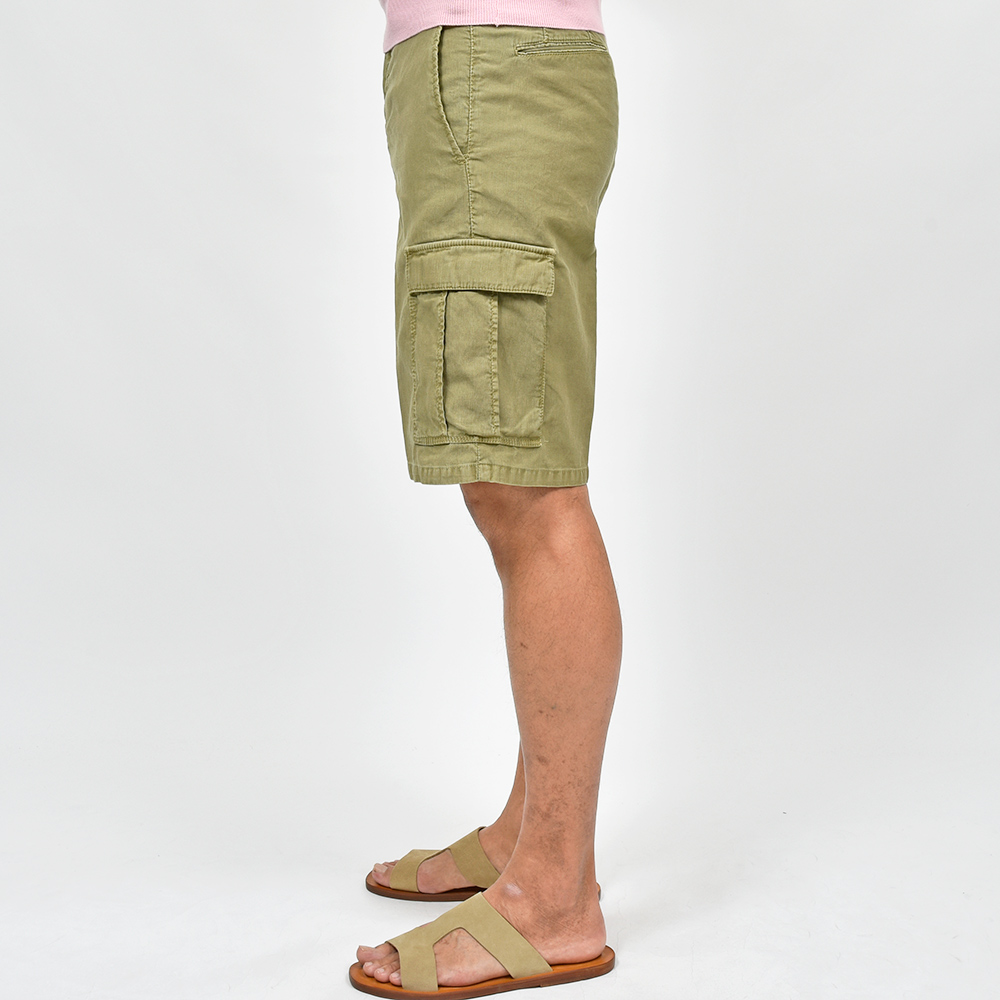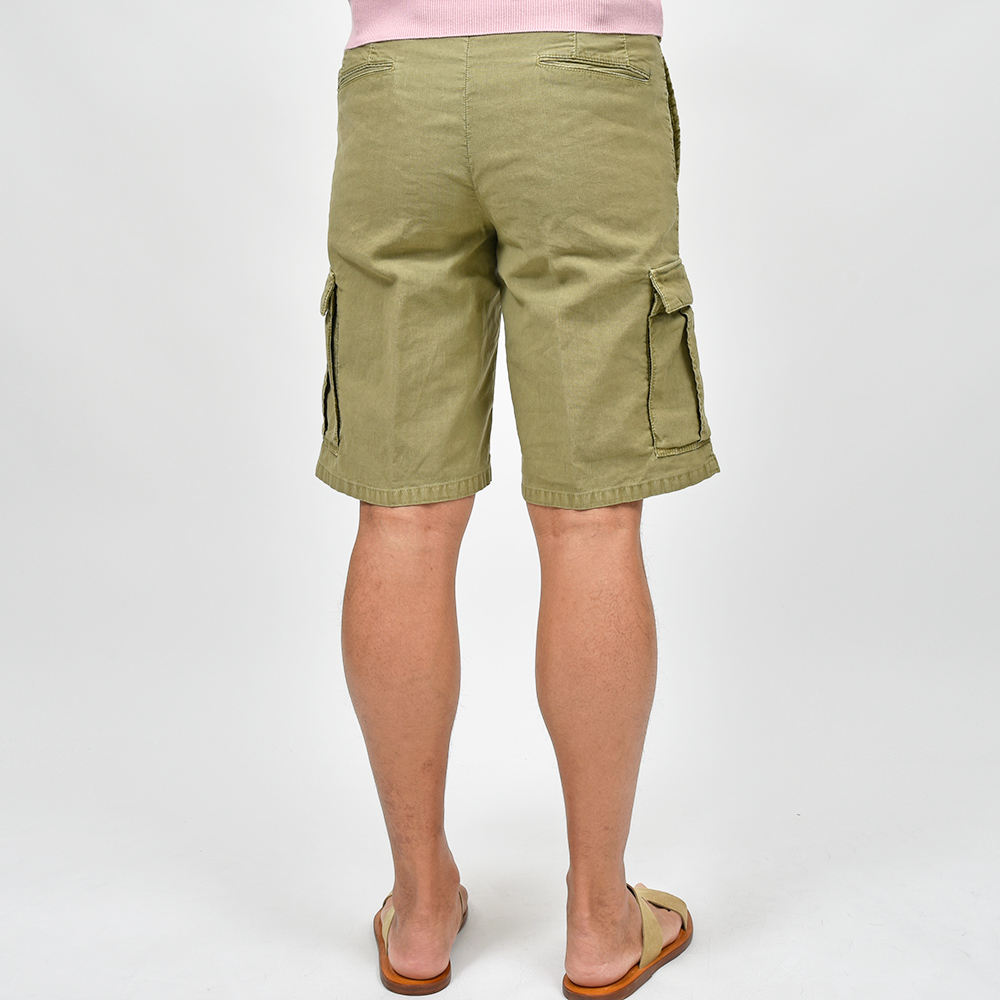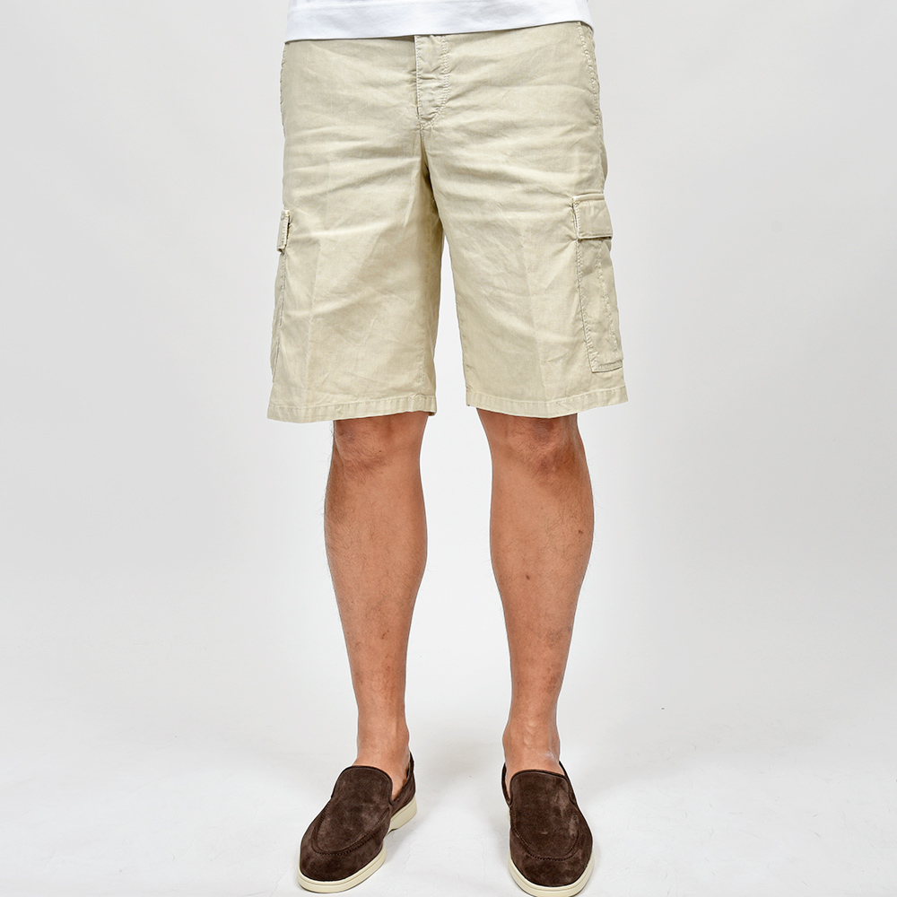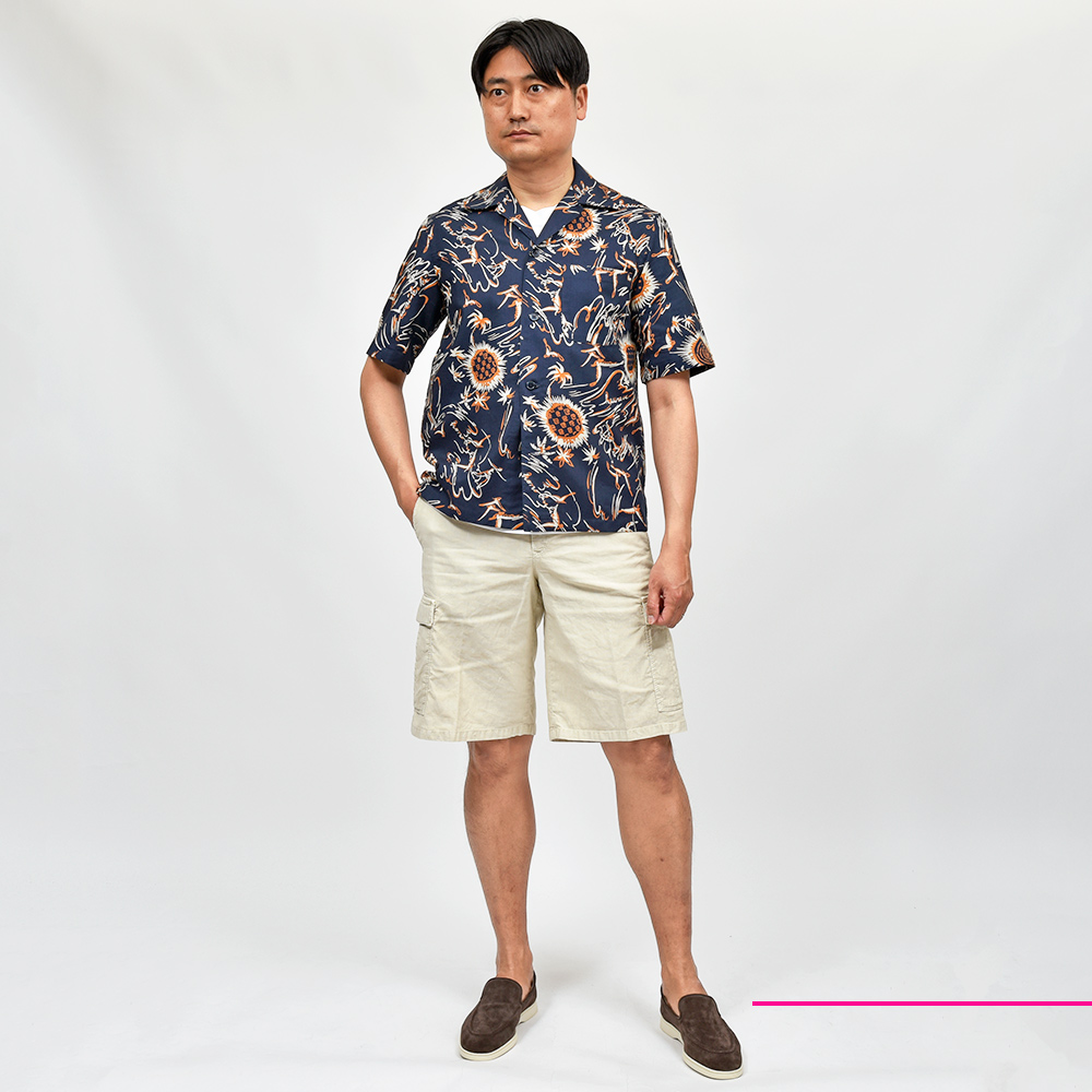 目付け340gのガーメントダイを施した生地は、コードレーンによく似た畝が入ることでドライな質感を生んでいます。PT TORINOの夏を代表する少しコンパクトなFITの“BERMUDA”ですが、こちらはカーゴポケットの付いた足回りにゆとりのあるシルエット。丈も通常のBERMUDAよりも長くなっているため、カーゴポケットとバランスの取れたシルエットを作り上げています。