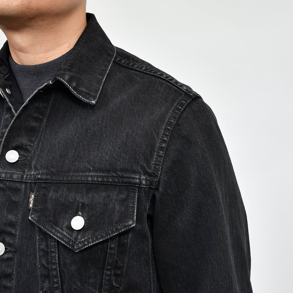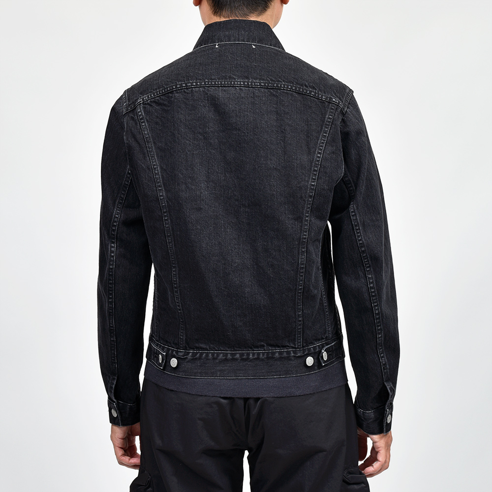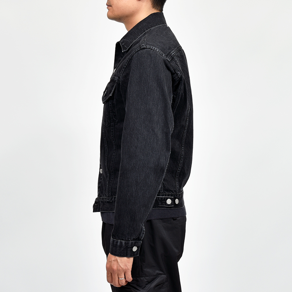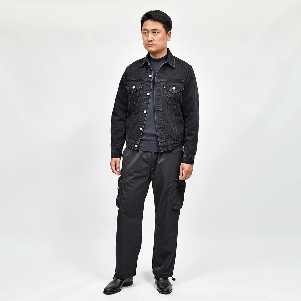 最もベーシックと言えるトラッカージャケットのディティールに、加工感のあるブラックデニムが良い塩梅のムードを感じさせます。