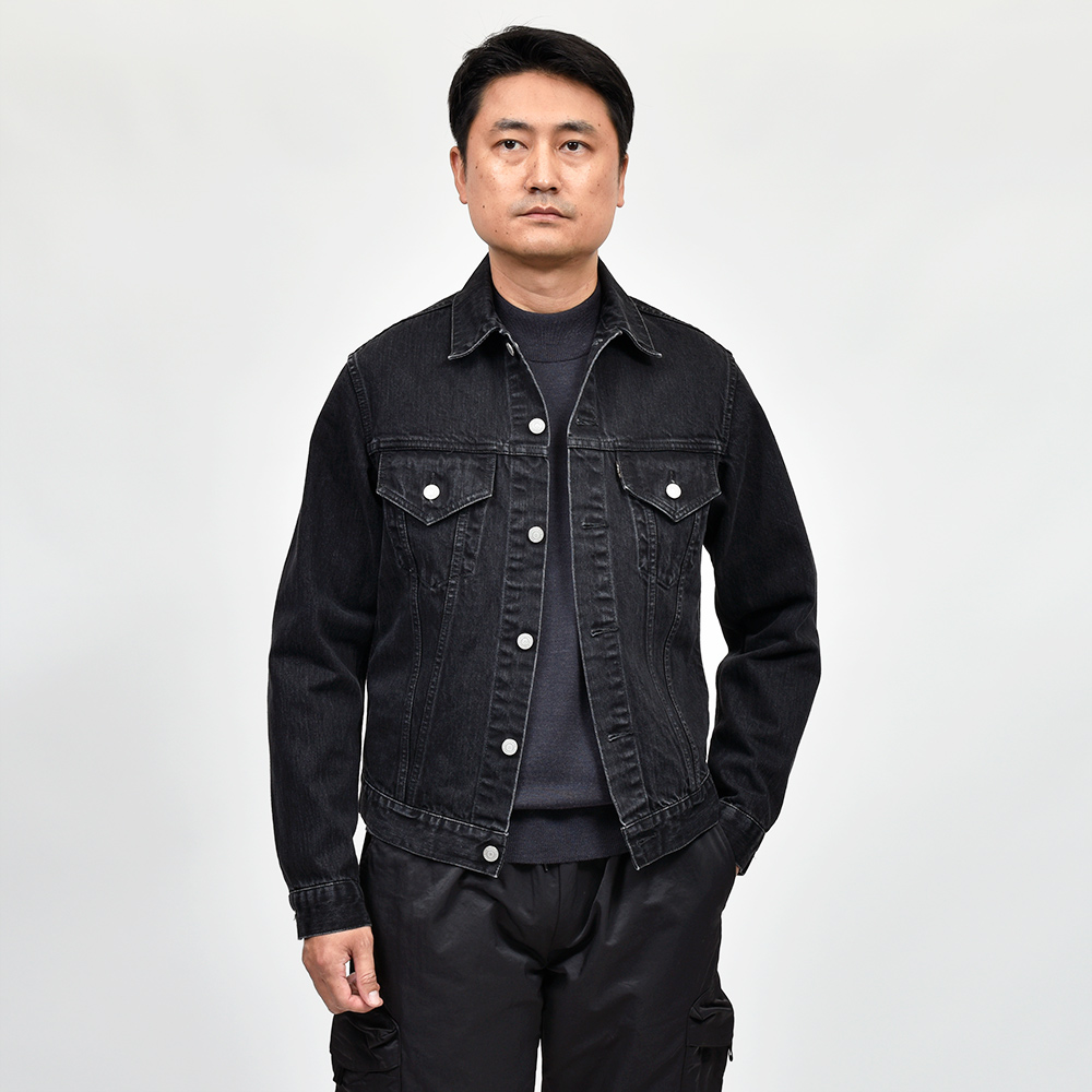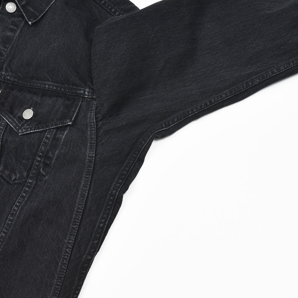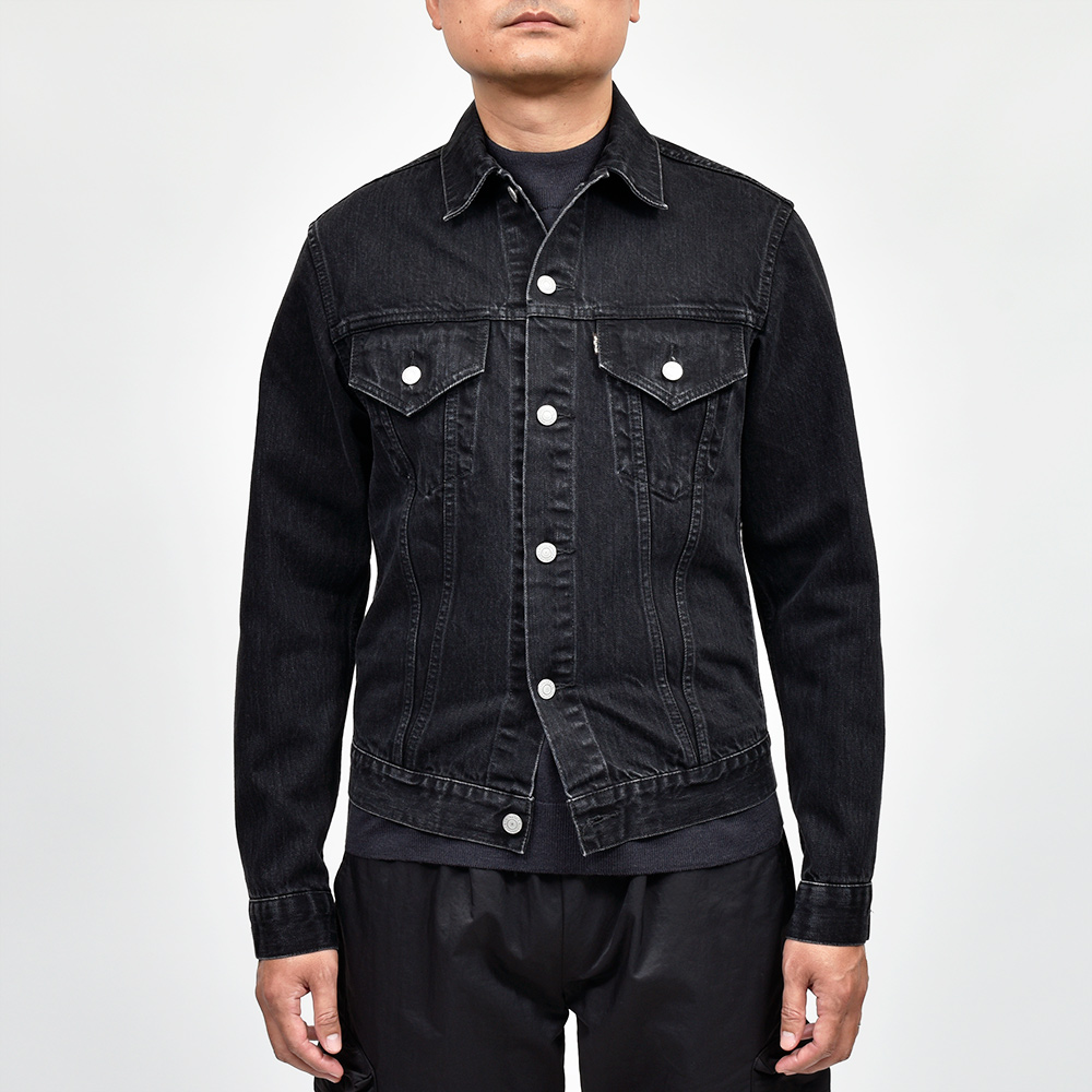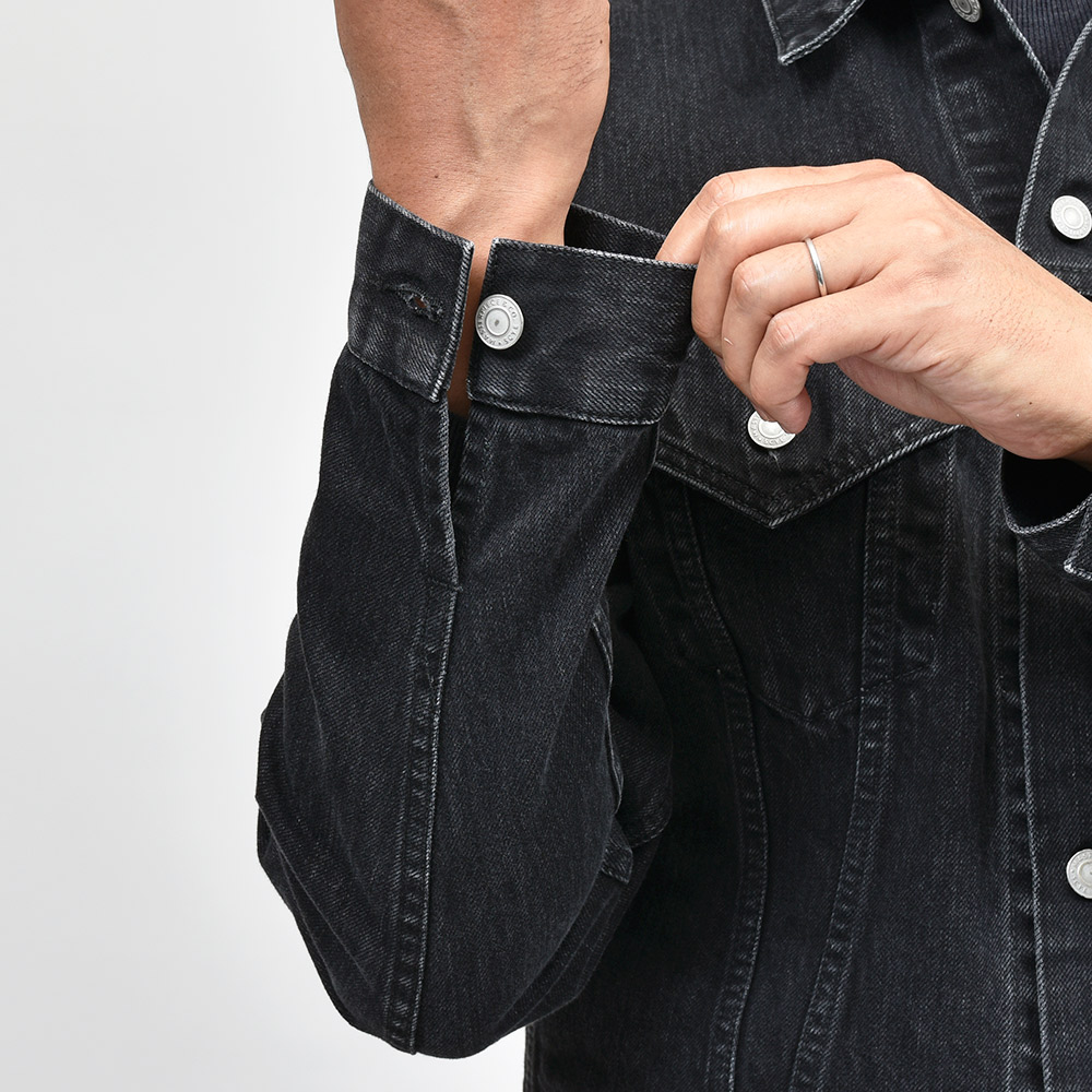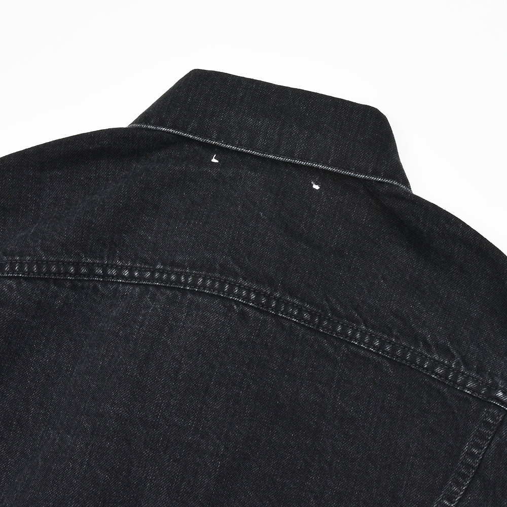 最もベーシックと言えるトラッカージャケットのディティールに、加工感のあるブラックデニムが良い塩梅のムードを感じさせます。