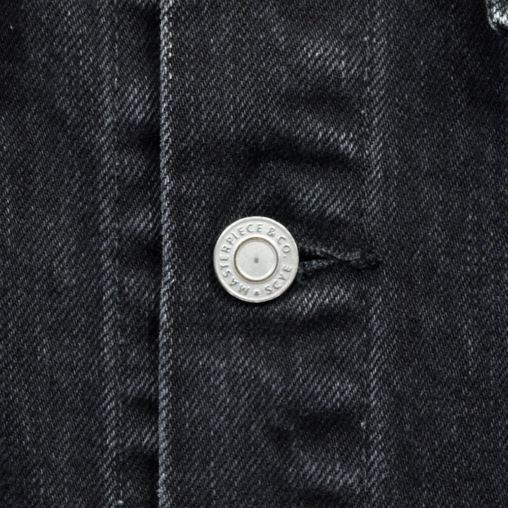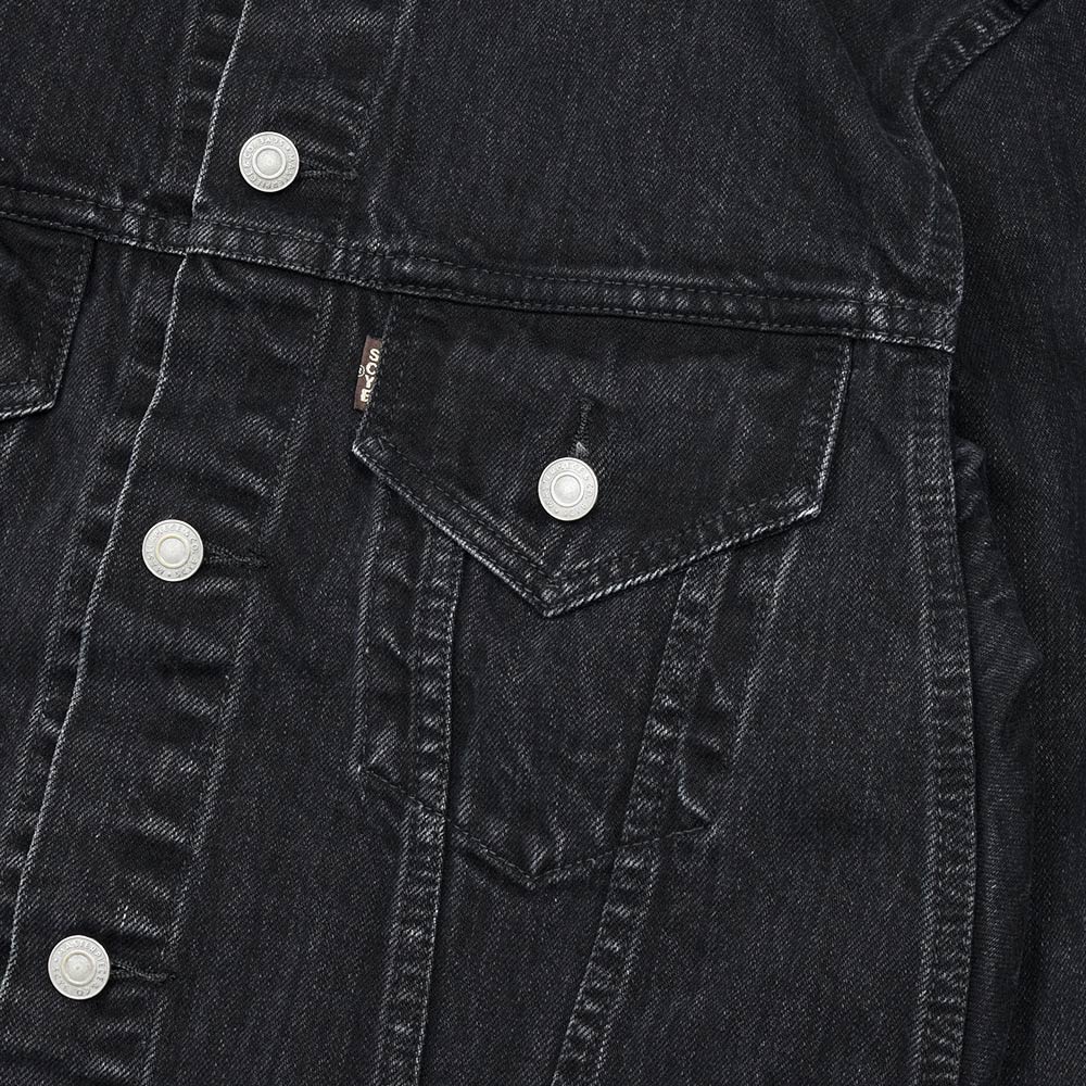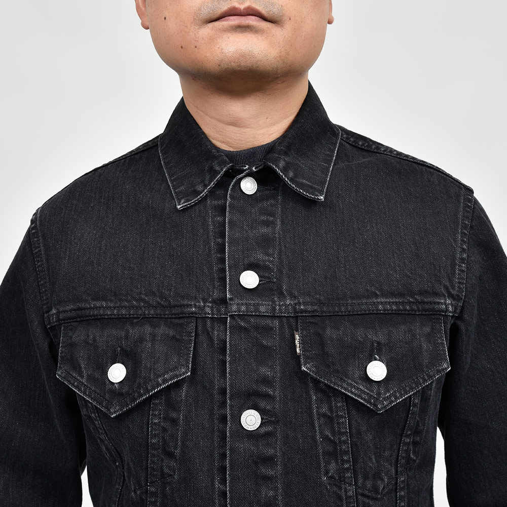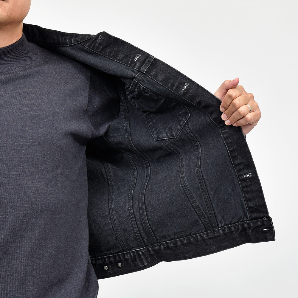 最もベーシックと言えるトラッカージャケットのディティールに、加工感のあるブラックデニムが良い塩梅のムードを感じさせます。