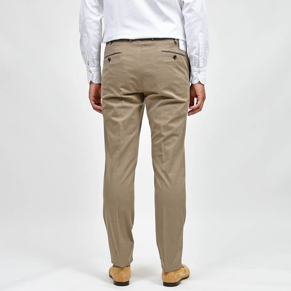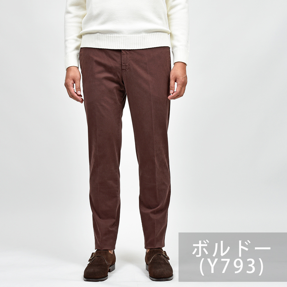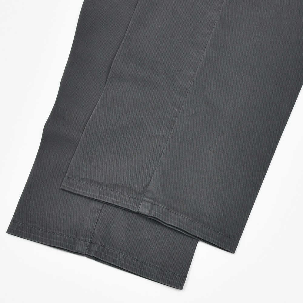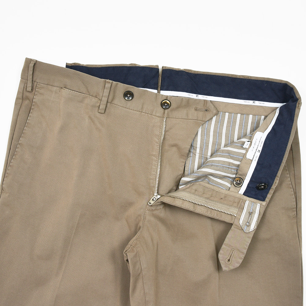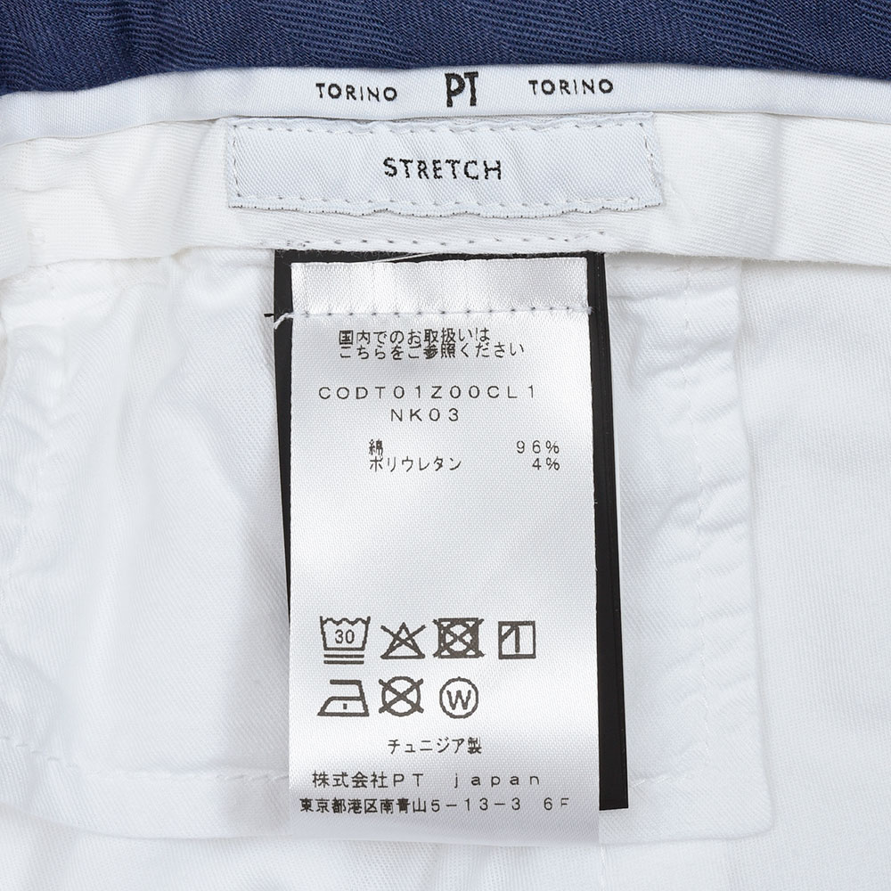 目付け340gの製品洗いをかけたコットンストレッチ素材は、PT TORINOのロングセラーである定番のチノクロスになります。細畝のツイル織りがカジュアルでありながらも上品さとエレガンスを感じさせる、これぞPT TORINOと言える要素が詰まっています。コチラは起毛感を抑え、厚すぎず薄すぎない生地感になりますので、ロングシーズンでの着用が可能となります。