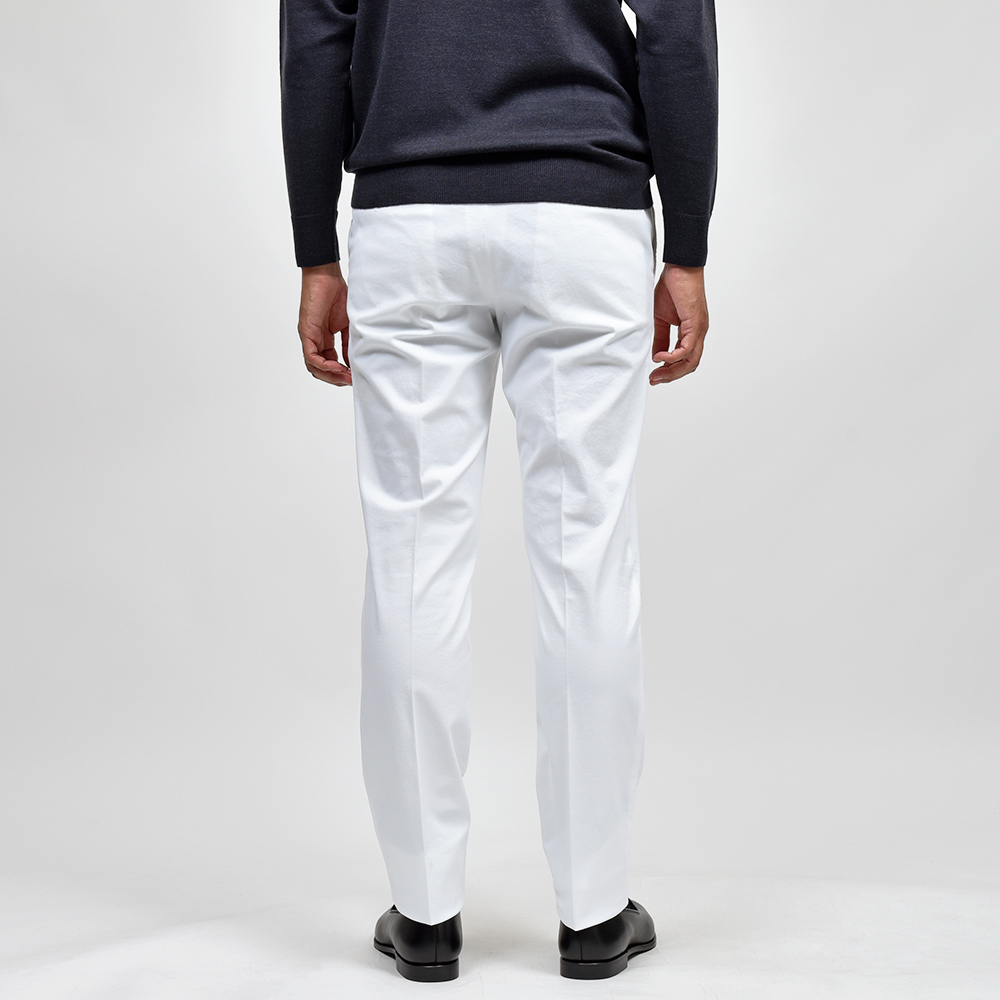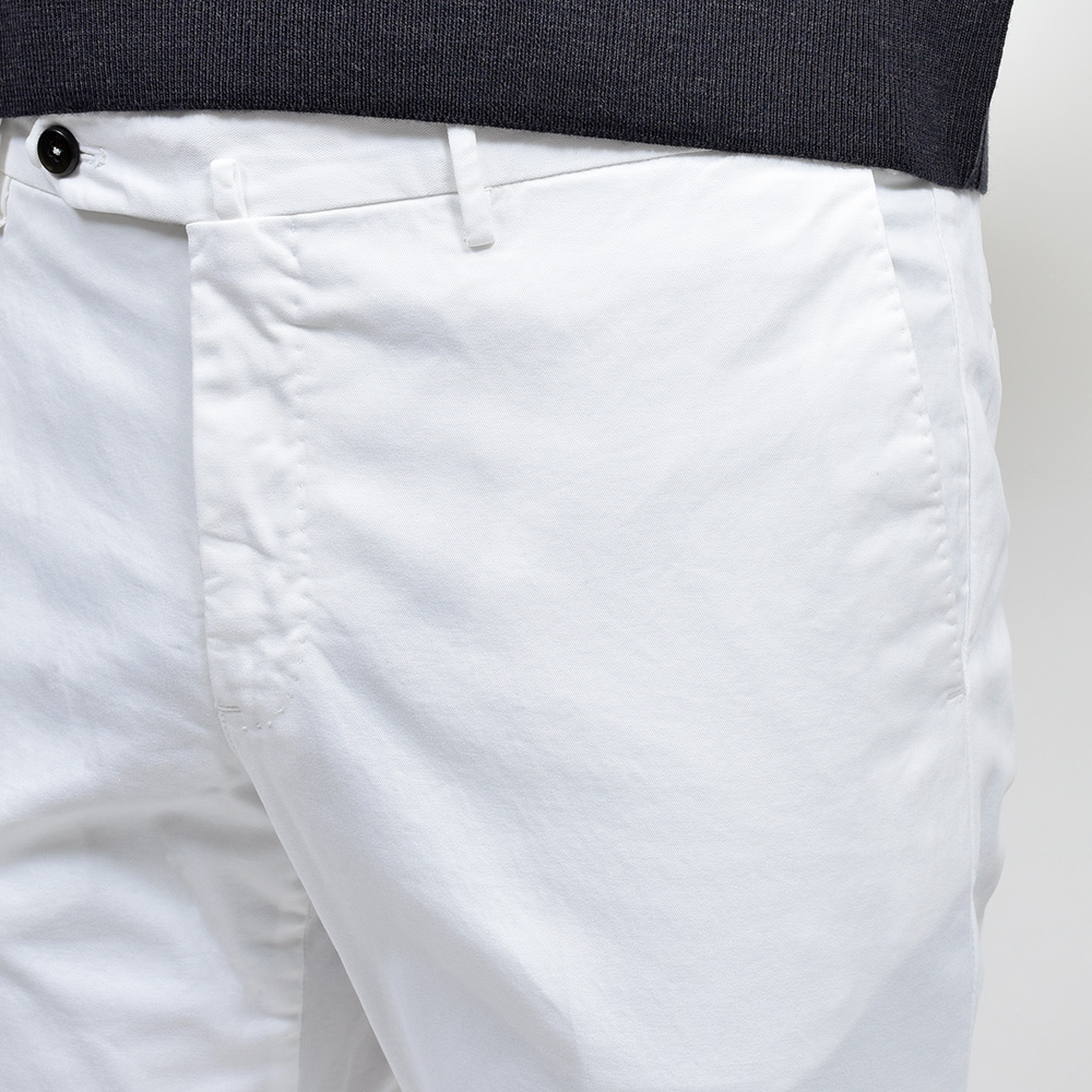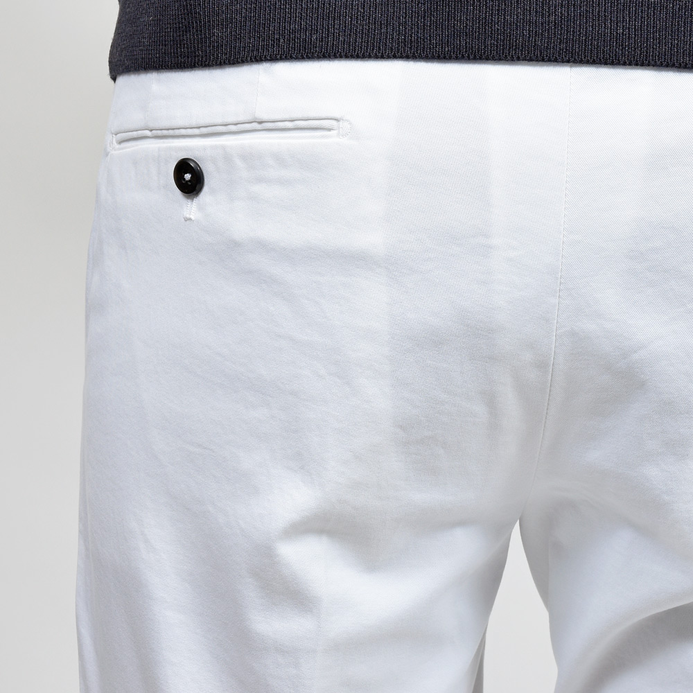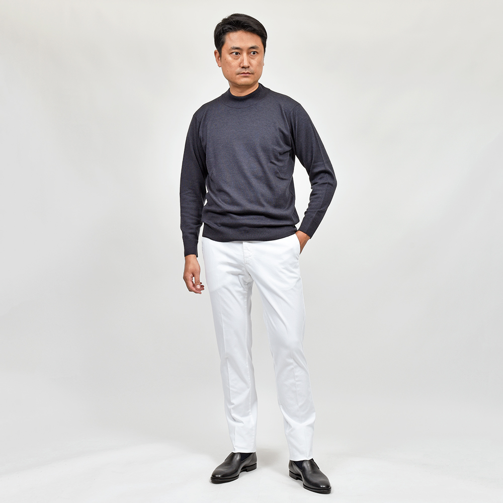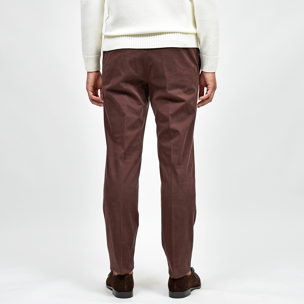 目付け340gの製品洗いをかけたコットンストレッチ素材は、PT TORINOのロングセラーである定番のチノクロスになります。細畝のツイル織りがカジュアルでありながらも上品さとエレガンスを感じさせる、これぞPT TORINOと言える要素が詰まっています。コチラは起毛感を抑え、厚すぎず薄すぎない生地感になりますので、ロングシーズンでの着用が可能となります。