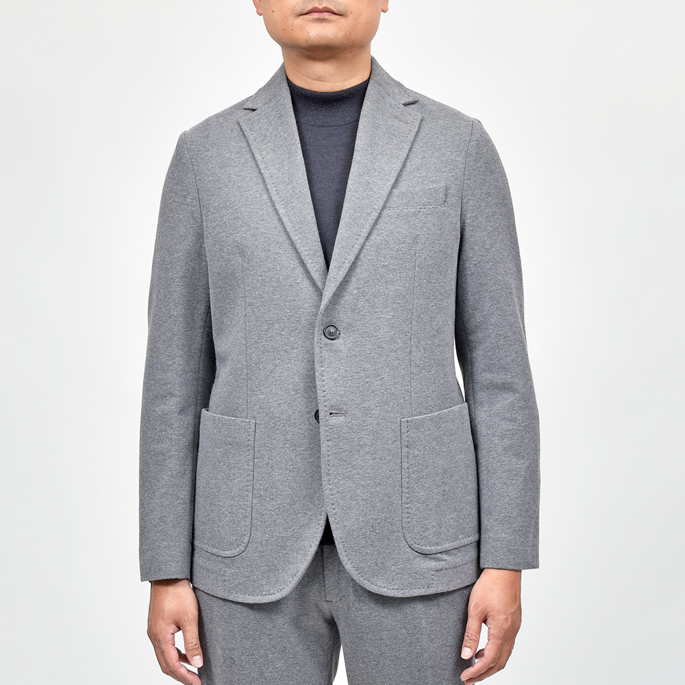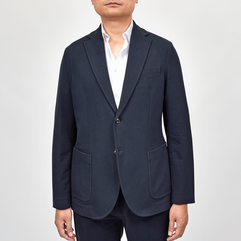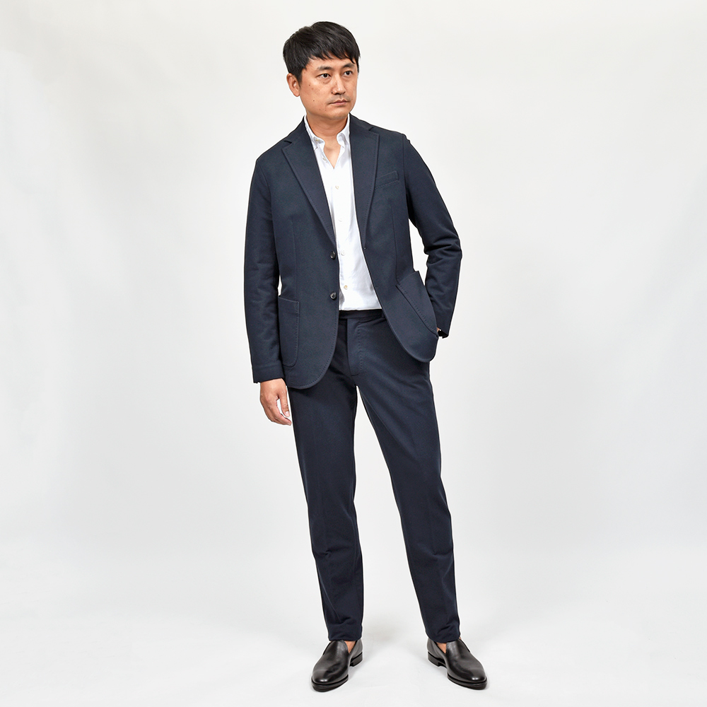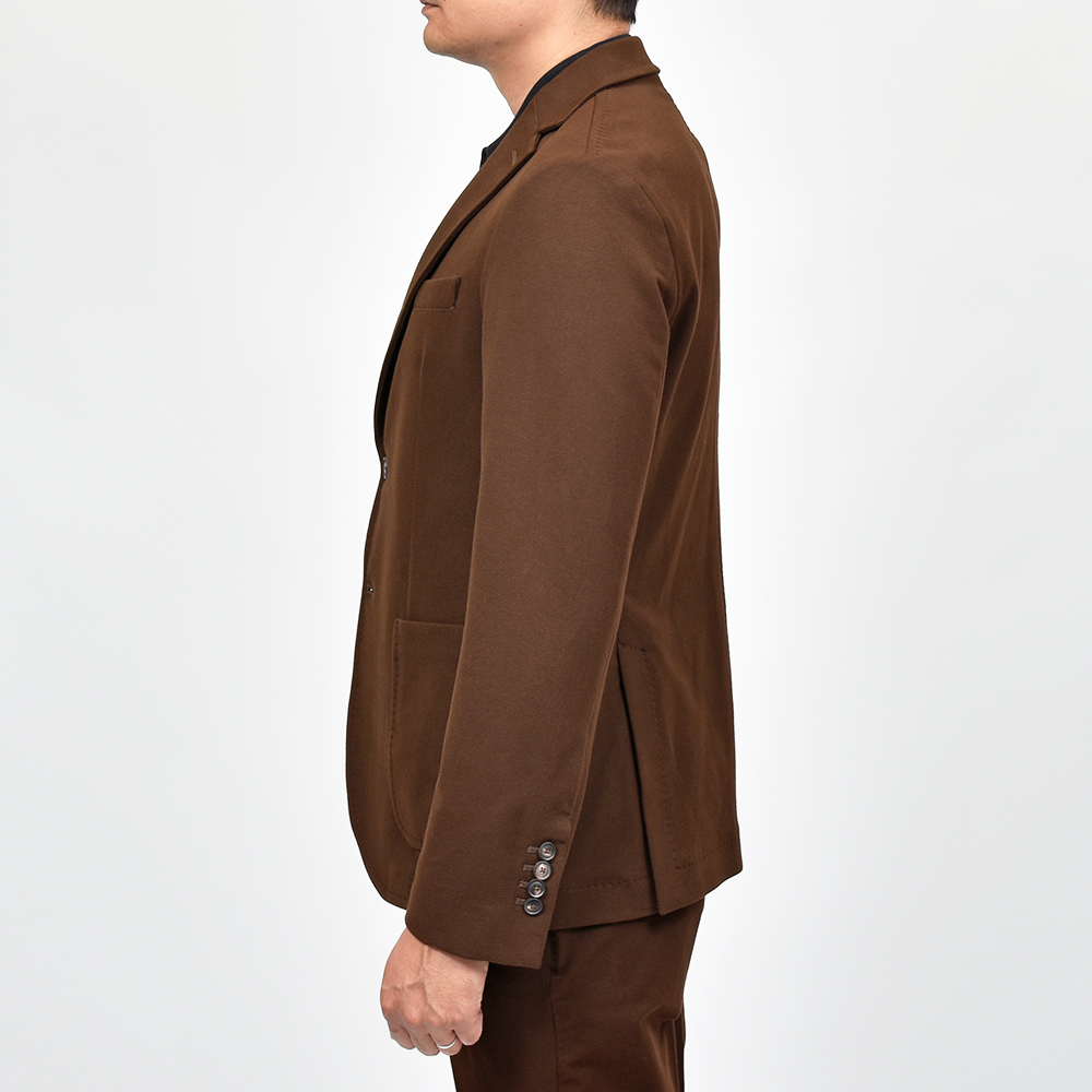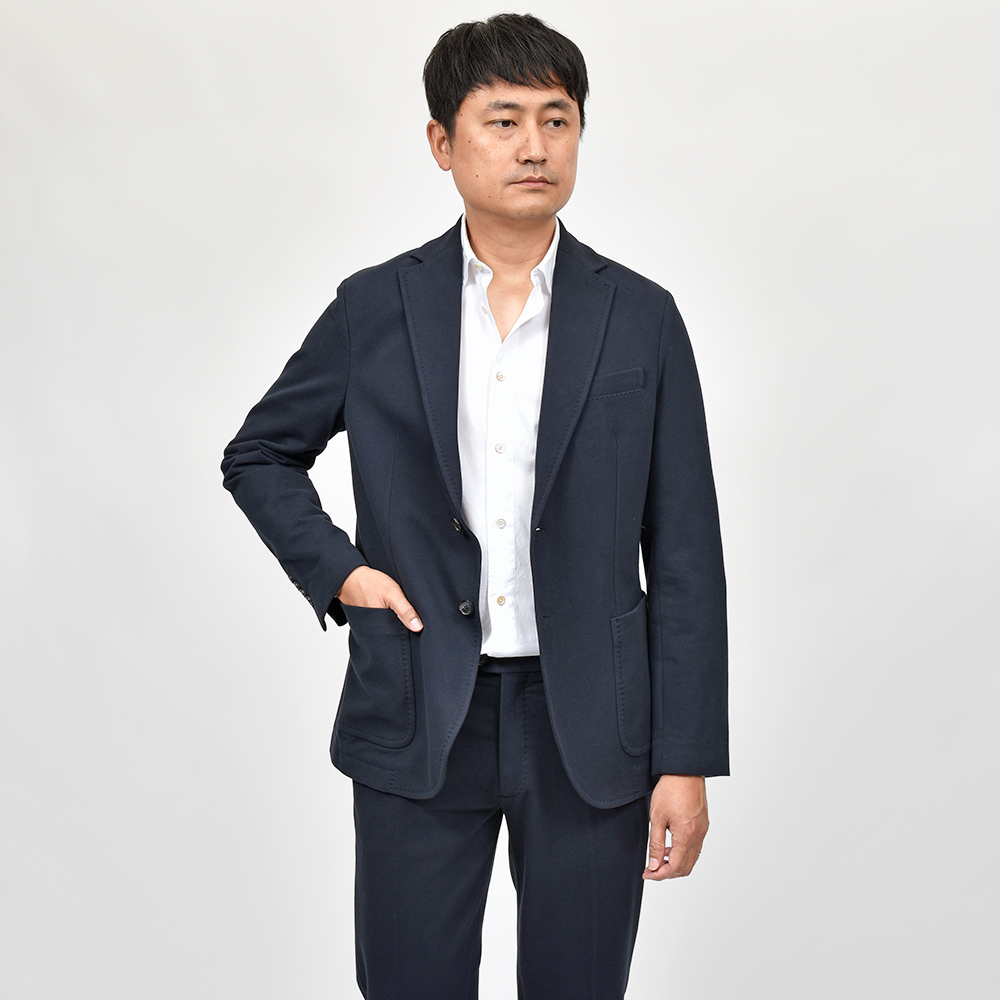 こちらは程よくタイトなシルエットに、フロントの2つボタンがジュアルなジャケットやセットアップとして非常に有能な働きをしてくれる定番モデルになります。