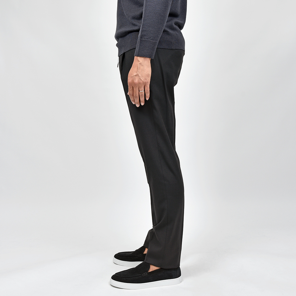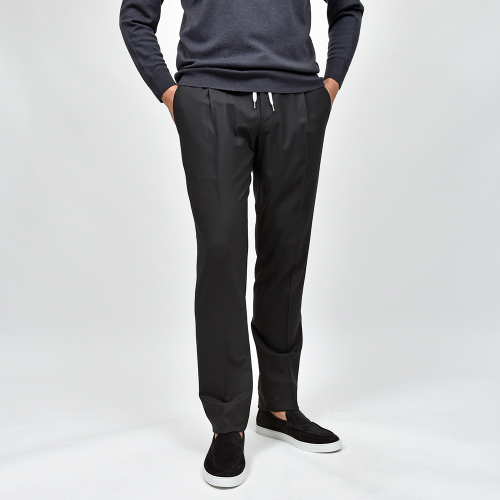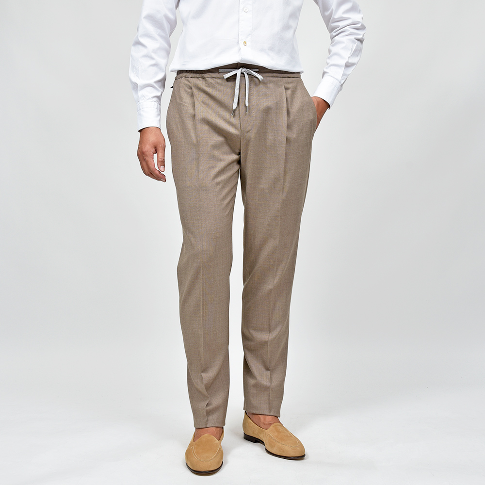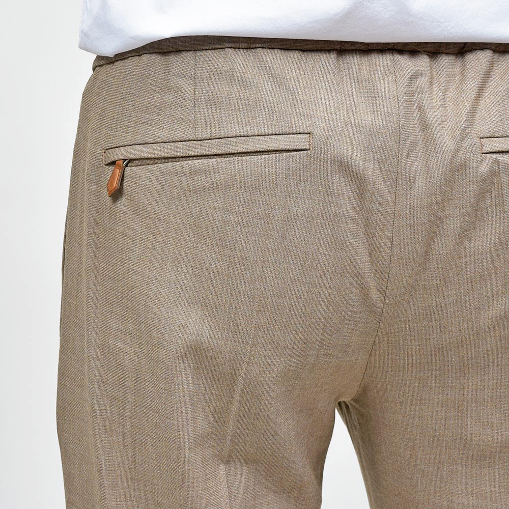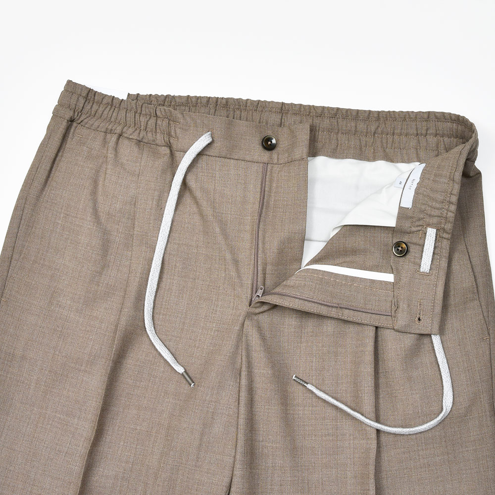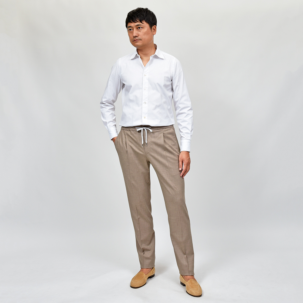 目付け290gの“TRAVELLER LIGHT STRETCH”と名付けられたこちらの生地は、ライトウエイトな生地感に程よいストレッチ性、さらに柔らかでしなやかな質感でありながらも、高い弾力性を合わせ持つことで非常にシワが入りずらい生地になります。そのため、車や電車・飛行機といった長時間座るシーンでもシワが気にならず、勿論デスクワークにもぴったりな一本となっています。大人のためのリラックスパンツを謳う“SOFT FIT”ですので、リラックスした雰囲気を高めてくれるドローコード仕様は好相性。ヴァージンウール主体のウール見えする生地ですので、ラフなジャケットと合わせてもすんなりと馴染んでくれます。