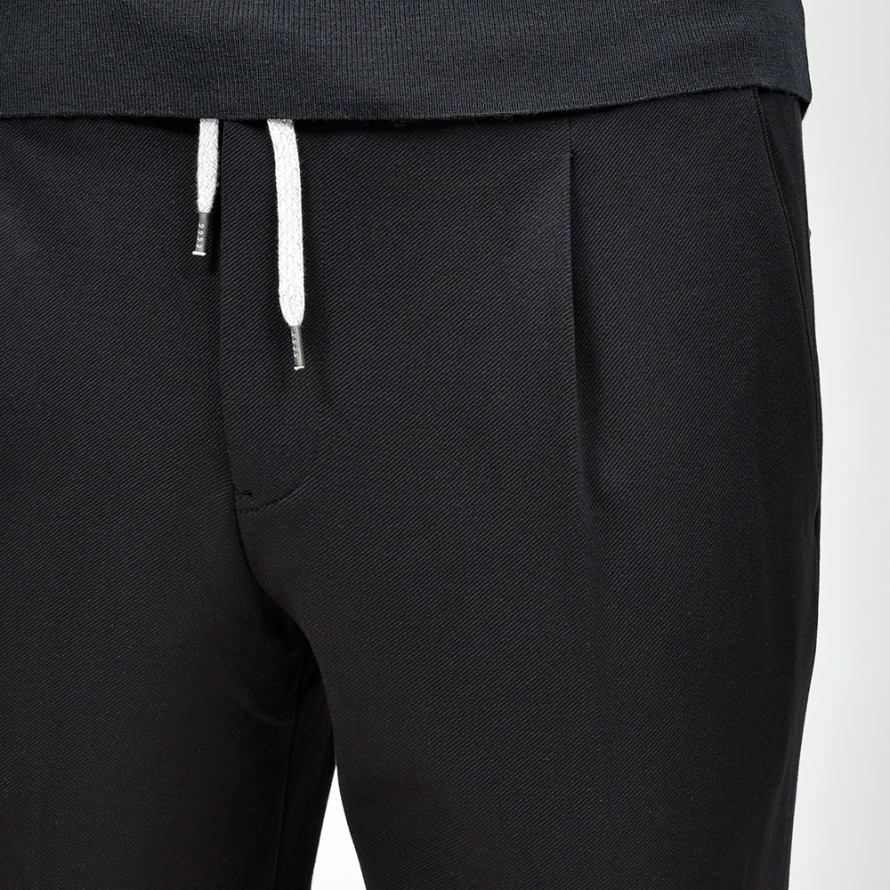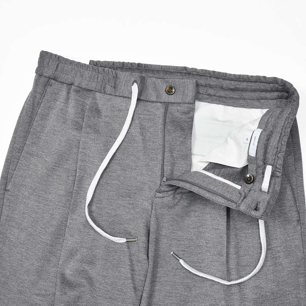 目付け500gのツイル織りのジャージーを使用したこちらは、やや厚手な生地感は夏以外で使用できる程良いウエイトになります。さらに、360度ストレッチする高い伸縮性を持ち、ストレスとは無縁の穿き心地を生んでいます。大人のためのリラックスパンツを謳う“SOFT FIT”ですので、リラックスした雰囲気を高めてくれるドローコード仕様は好相性。ツイル織りの一見するとジャージーに見えない生地感ですので、ラフなジャケットと合わせてもすんなりと馴染んでくれます。