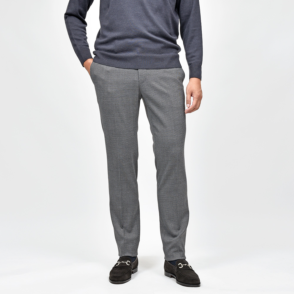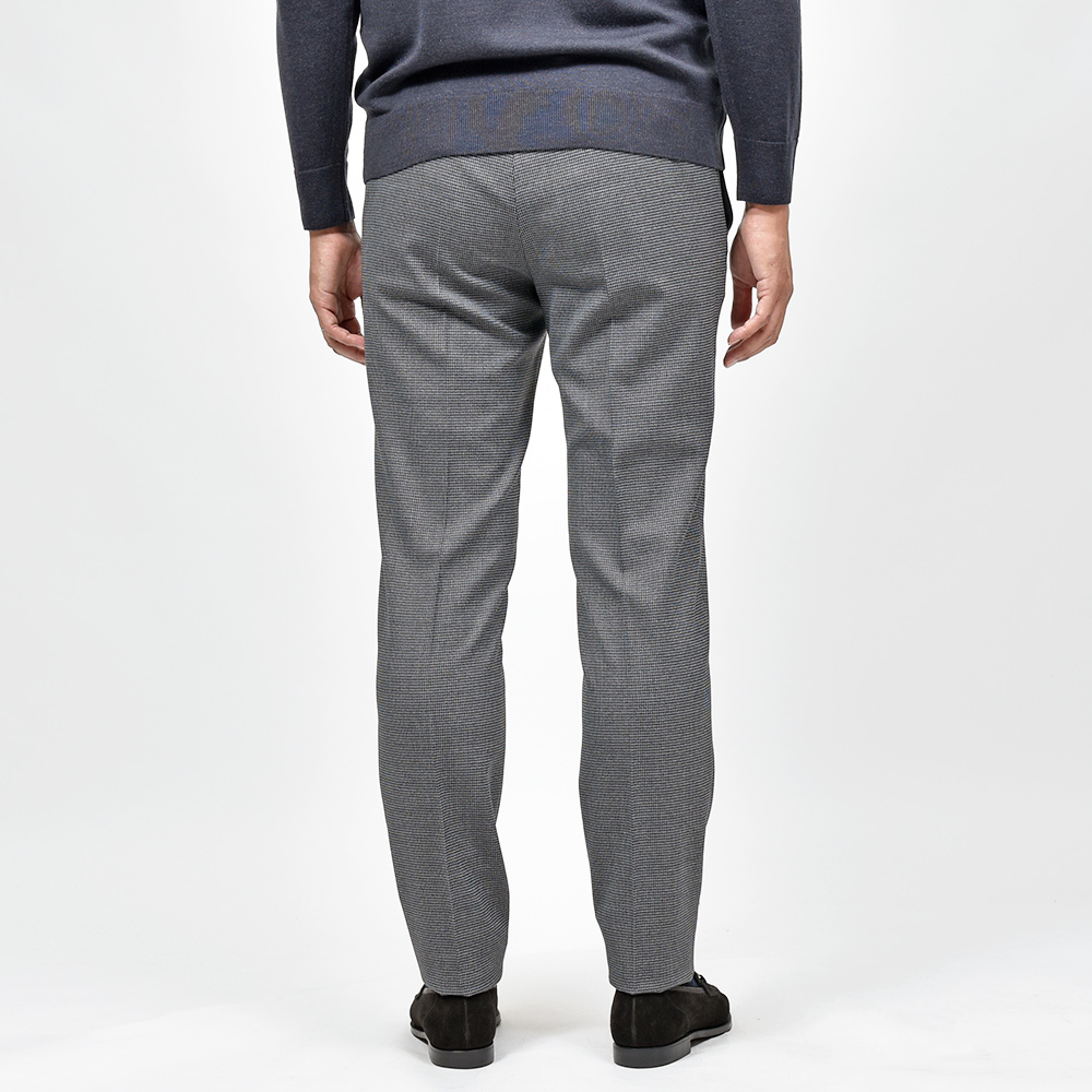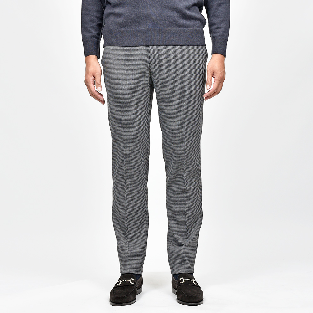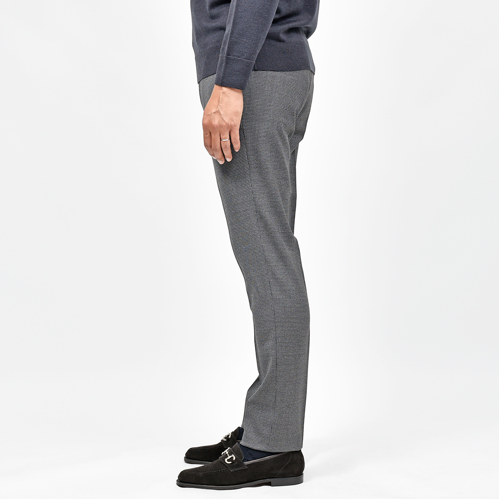 日本国内限定としてリリースされたこちらのファブリックは、目付け320gのハウンドトゥース。薄すぎず厚すぎない程よい生地に、少しストレッチが効いた穿き心地になります。あまり起毛感のない質感は、柔らかでしなやかなタッチでありながらも、高い弾力性を合わせ持つことでシワが入りずらい生地感です。そのため、車や電車・飛行機といった長時間座るシーンでもシワが気にならず、勿論デスクワークにもぴったりな一本。また、洗濯機で洗えることでデイリーユースに活躍してくれること間違いありません。