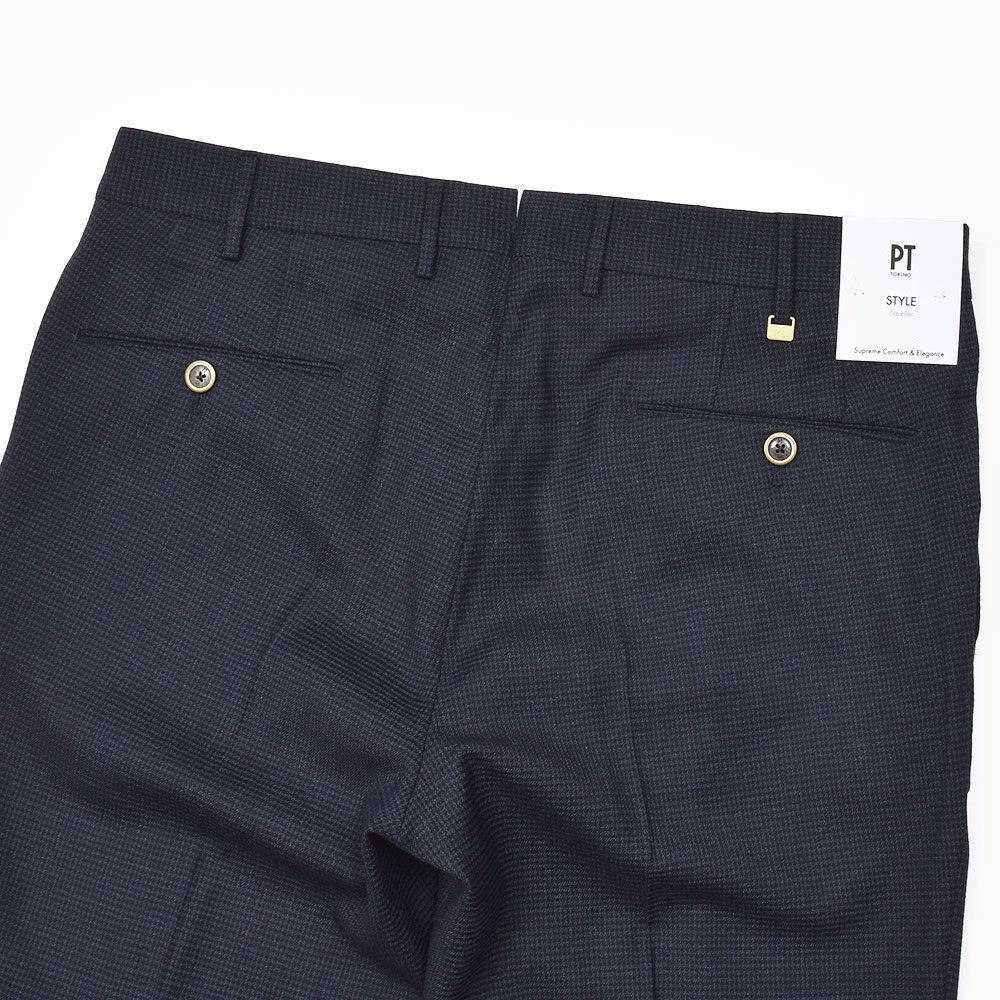 サイズ44でジャストサイズです。全体的なシルエットはピッタリですが窮屈さは無く、適度にタイトで膝下テーパードがしっかりしているPTらしい綺麗な脚のラインが印象的です。全体的にゆとりをもたせるならサイズ46ですがウエストやヒップ・股のあたりがゆるくなりシルエットが崩れてしまうのでサイズ44を選びます。