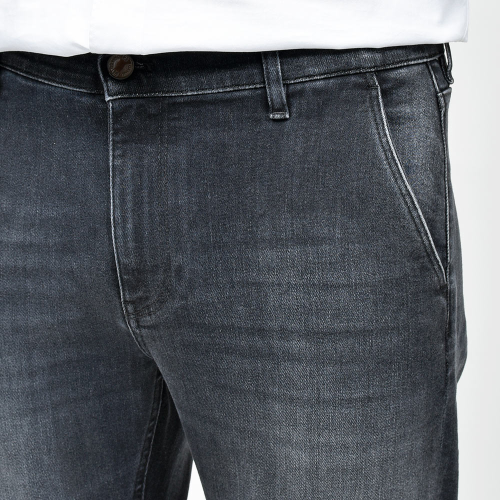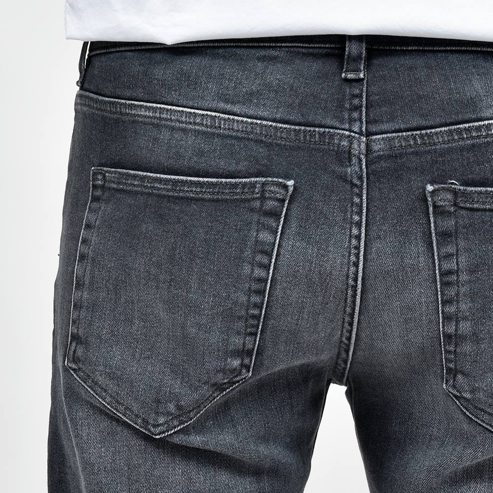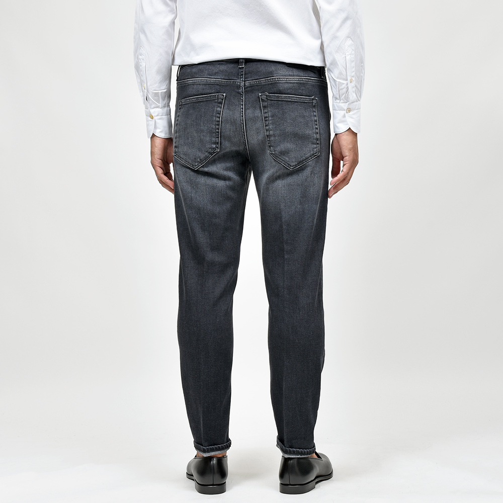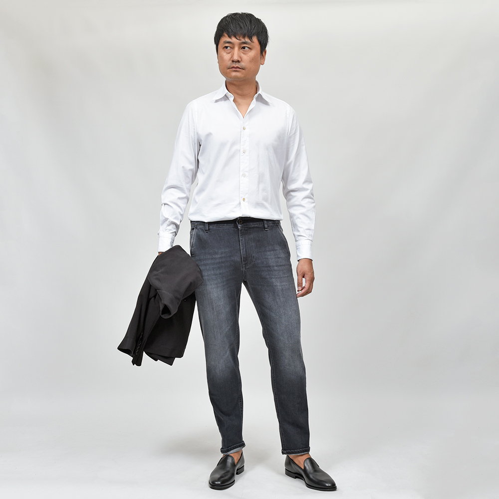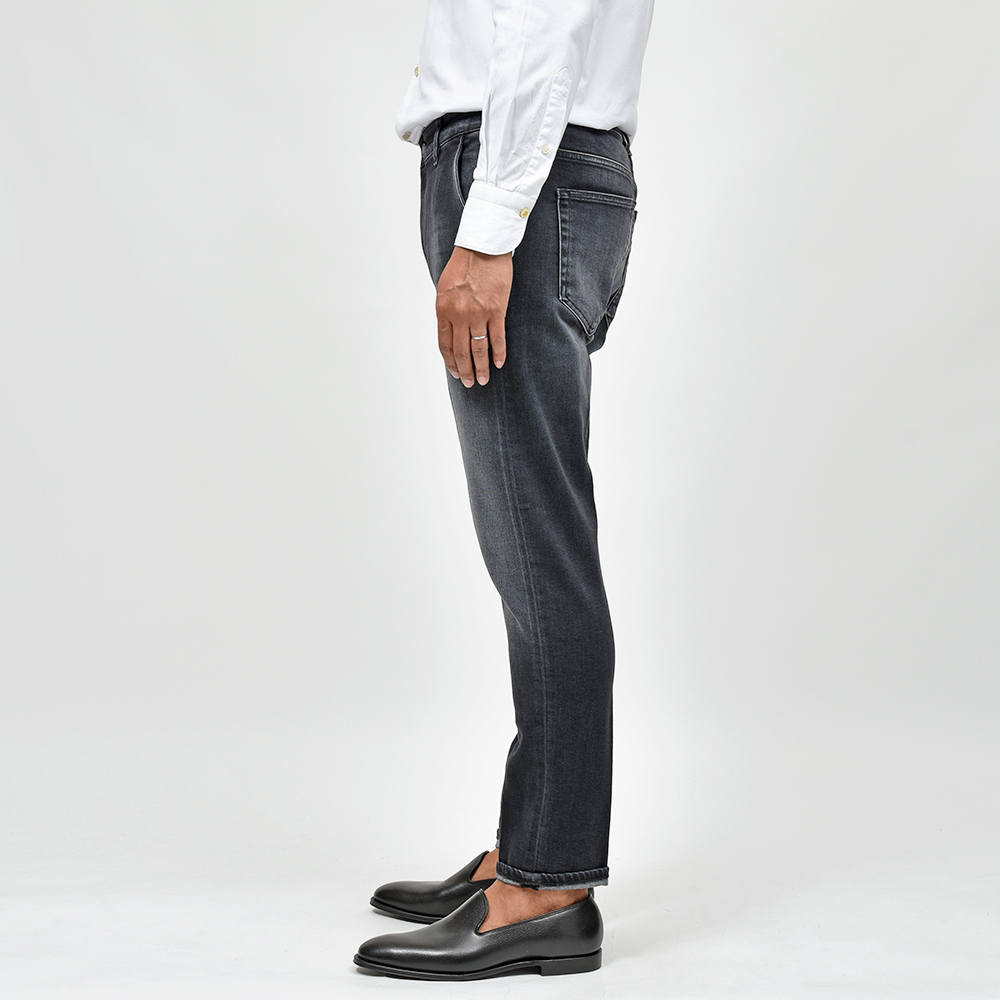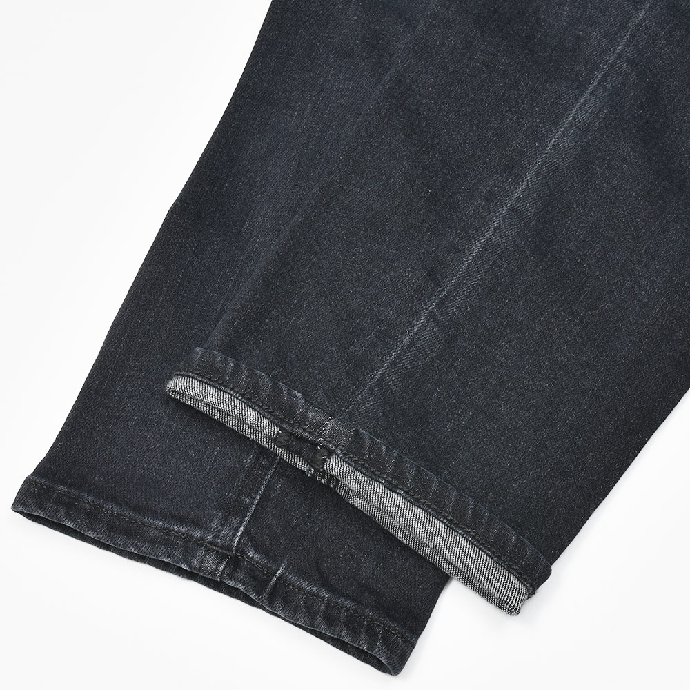 ミディアムなブラックカラーまでウォッシュド加工を施したこちらは、アタリ感を少し抑えることでモダンな雰囲気を作り上げています。また、非常に高いストレッチ性を持ったトラベラーデニムを使用していますので、その穿き心地は言わずもがな。飴色のボタンに、同色のステッチ、高級感のあるスエードの革パッチが大人の色気を演出してくれます。