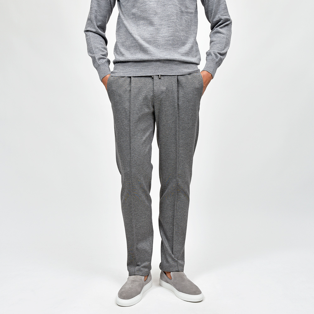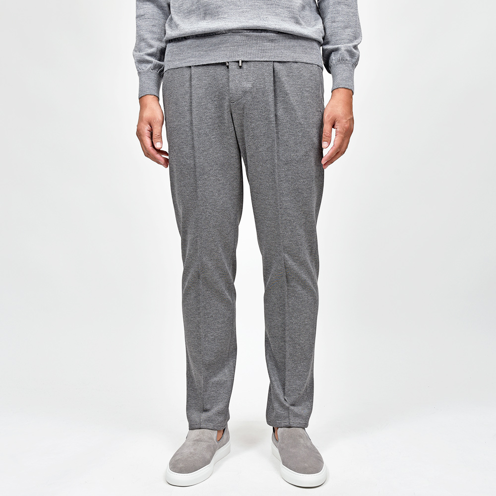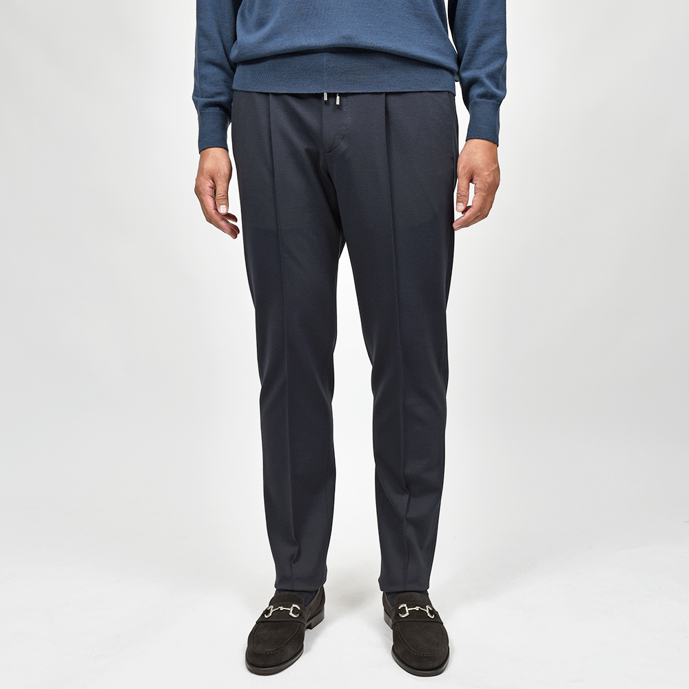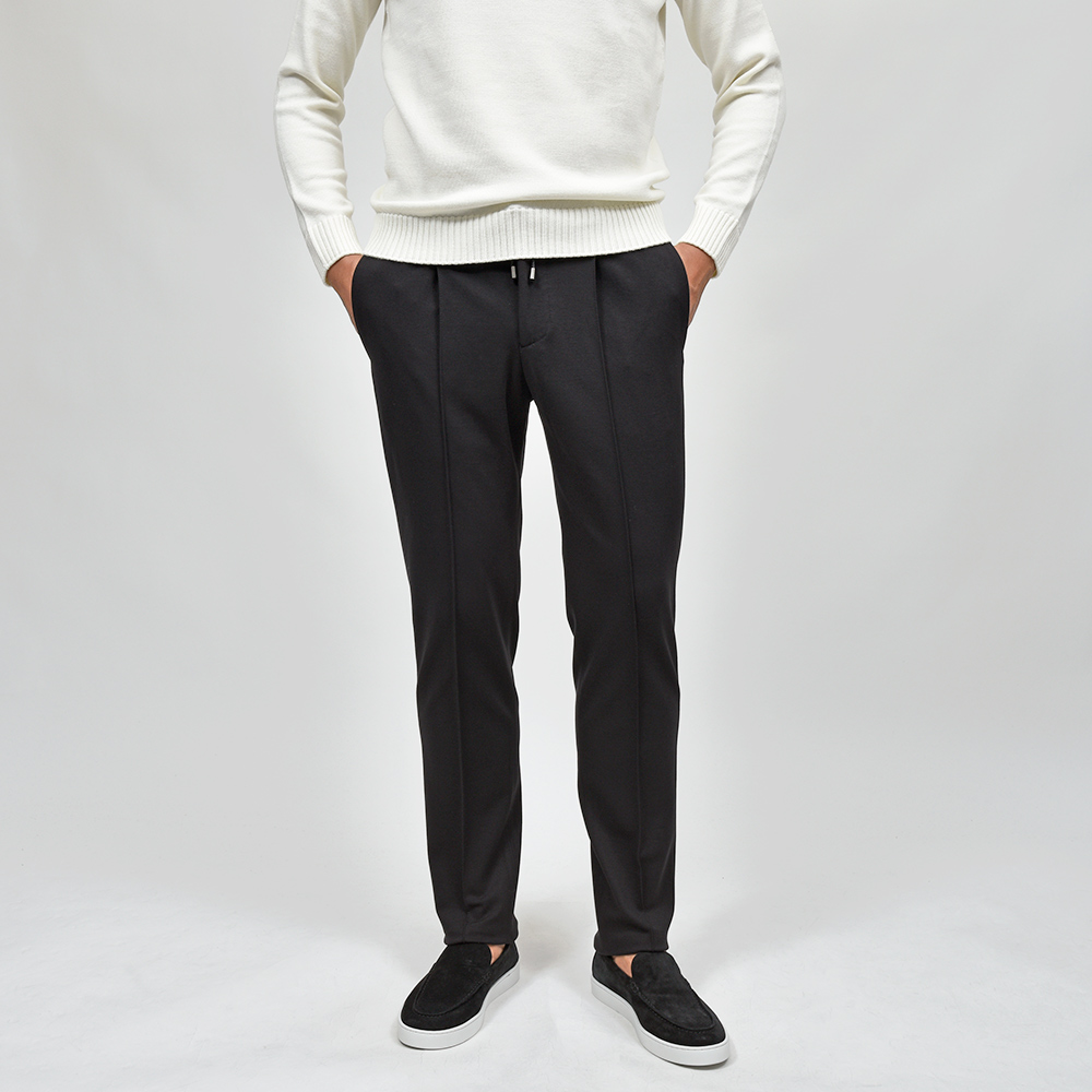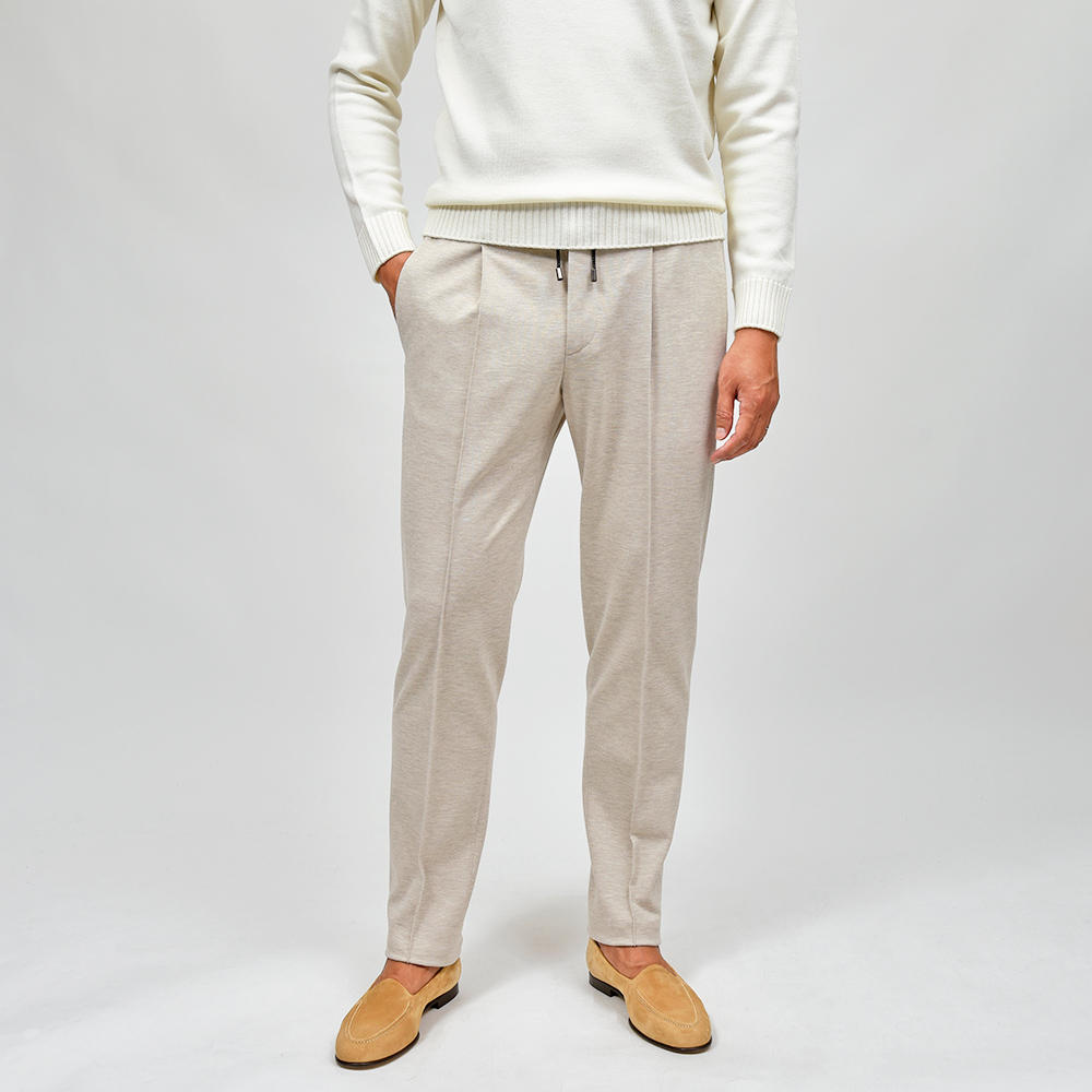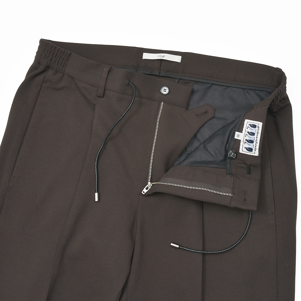 サイズ50がジャストサイズです。ヒップ・ワタリから裾にかけてタイトすぎず適度にゆとりがあって穿きやすく、それでいてスッキリとしています。永久クリースに旬なプリーツが ring 別注ポイントで、イントレチャートのドローコードをアクセントにしています。定番のジャージーならコチラです!