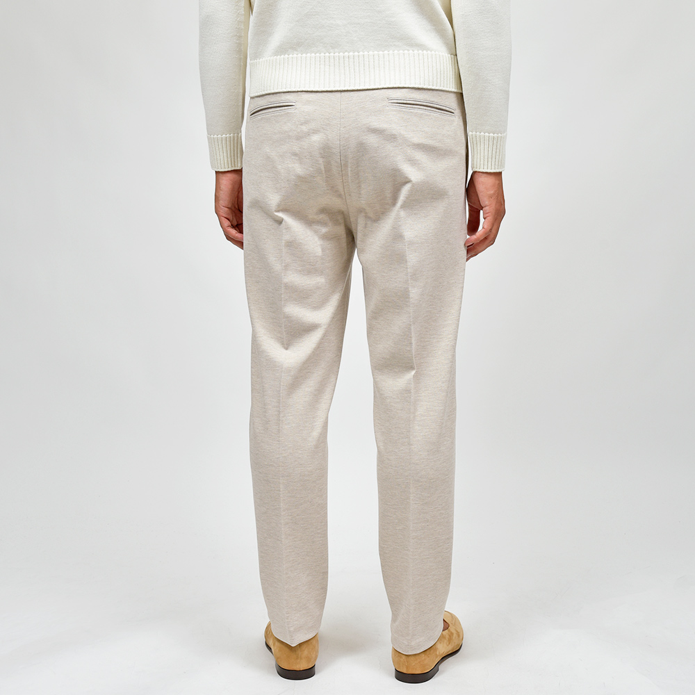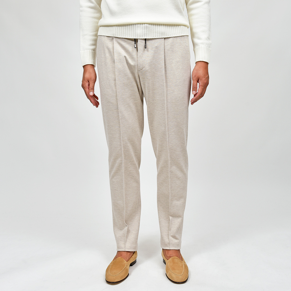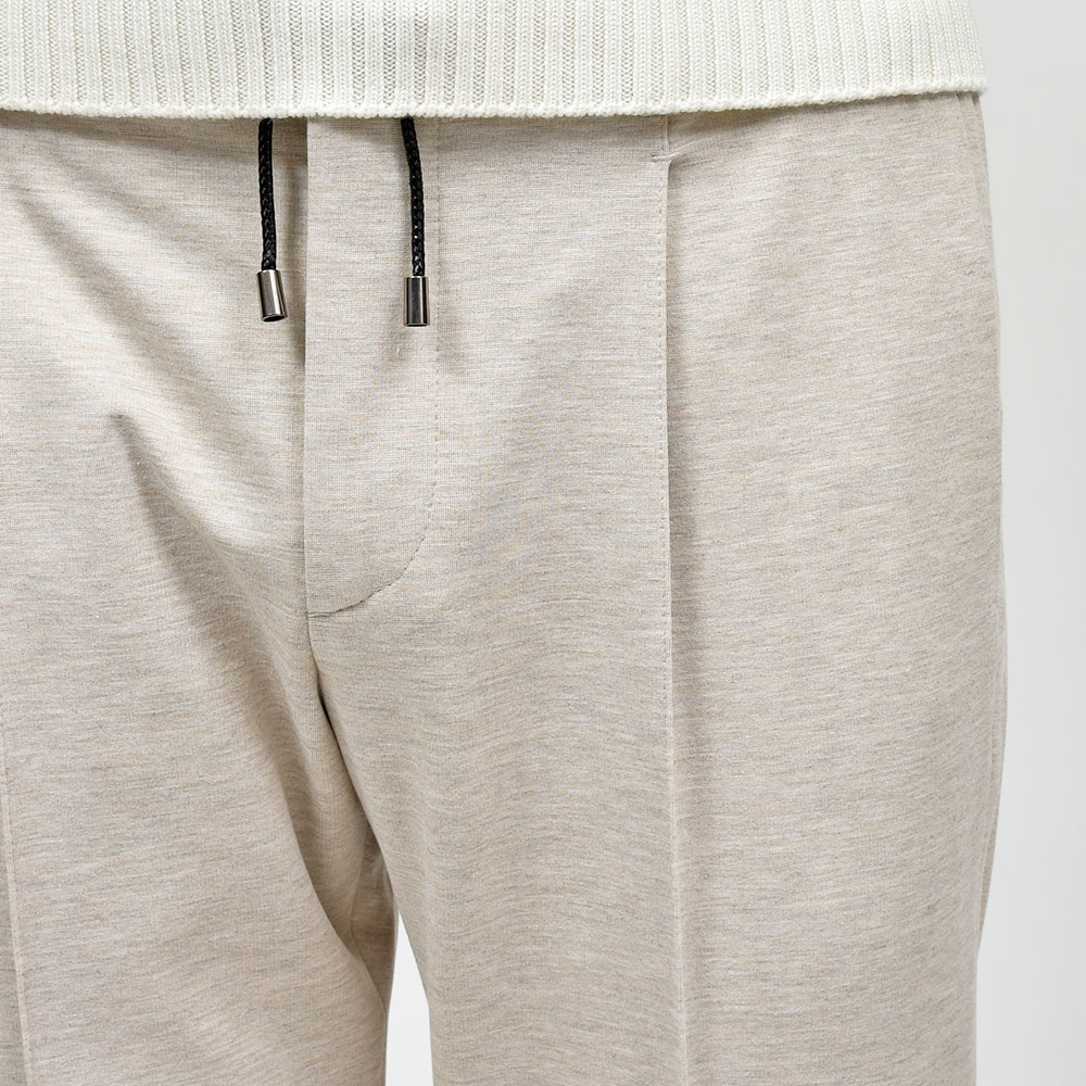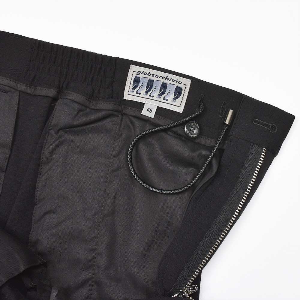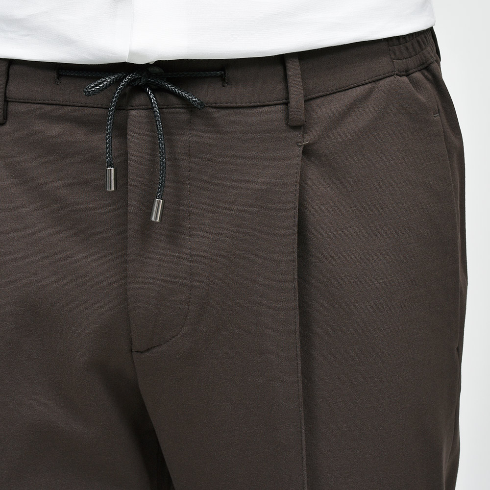 MASACCIOはフロントクリースをステッチで抑えることで、美しいラインがいつまでも続く永遠を約束された特別な一本です。ウエストのサイドにはゴムが入っており、ウエストは4cmほど伸縮してくれるリラックスした穿き心地。ドローコードは内側に隠すことができるため、ベルトを巻くとビジネスにも対応する、リラック顔にもドレス顔にも変化の効く万能なアイテムです。