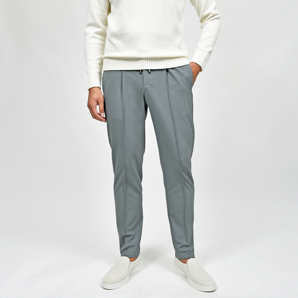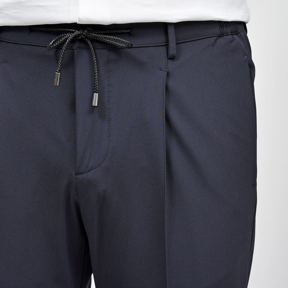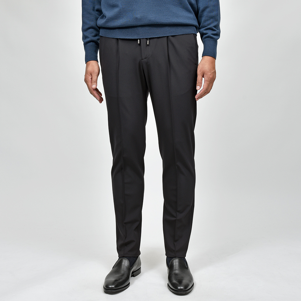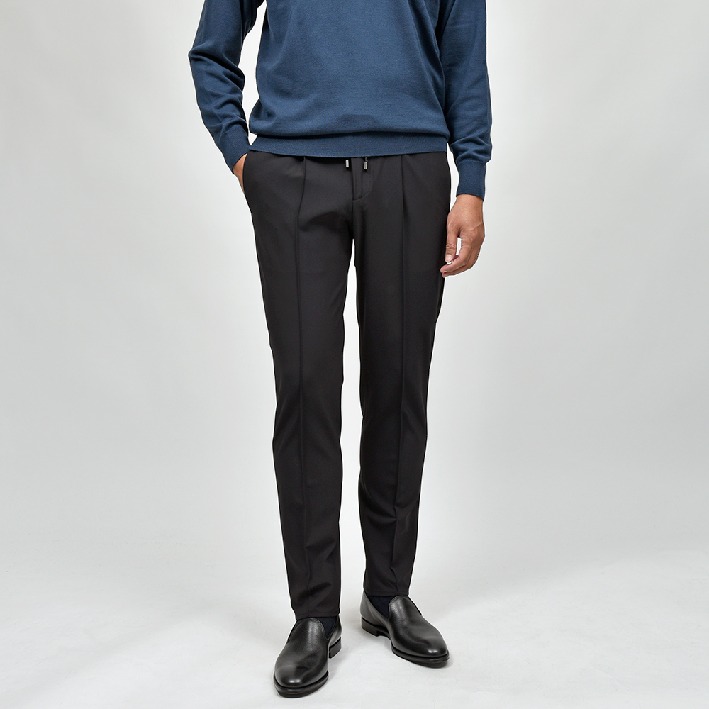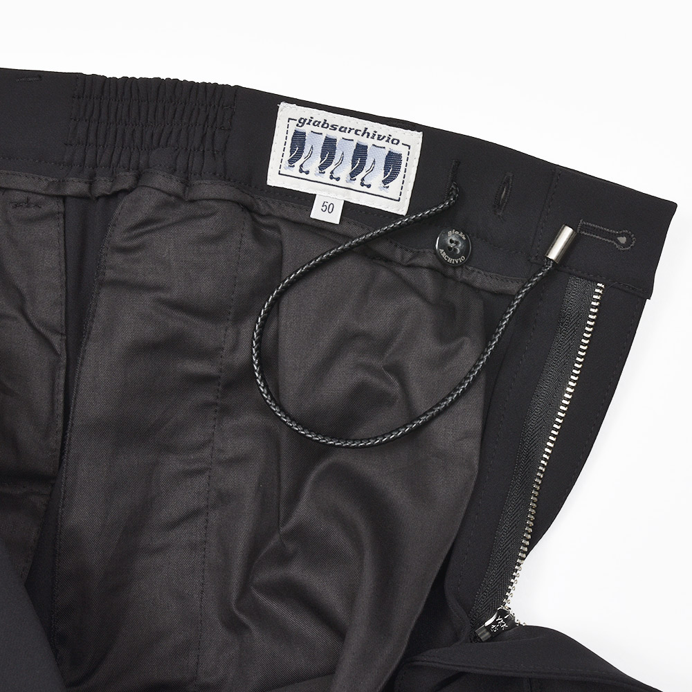 MASACCIOはフロントクリースをステッチで抑えることで、美しいラインがいつまでも続く永遠を約束された特別な一本です。ウエストのサイドにはゴムが入っており、ウエストは4cmほど伸縮してくれるリラックスした穿き心地。ドローコードは内側に隠すことができるため、ベルトを巻くとビジネスにも対応する、リラック顔にもドレス顔にも変化の効く万能なアイテムです。
