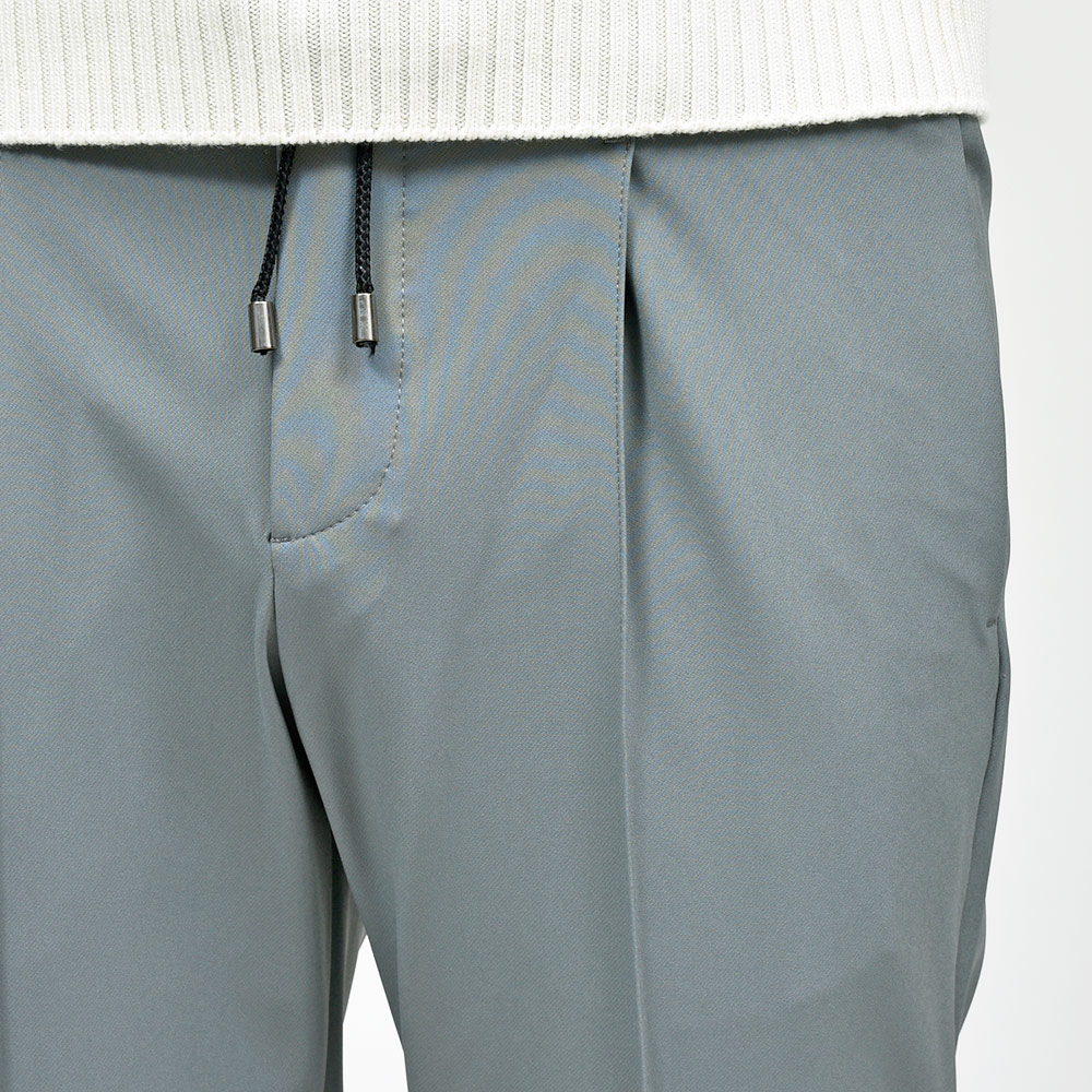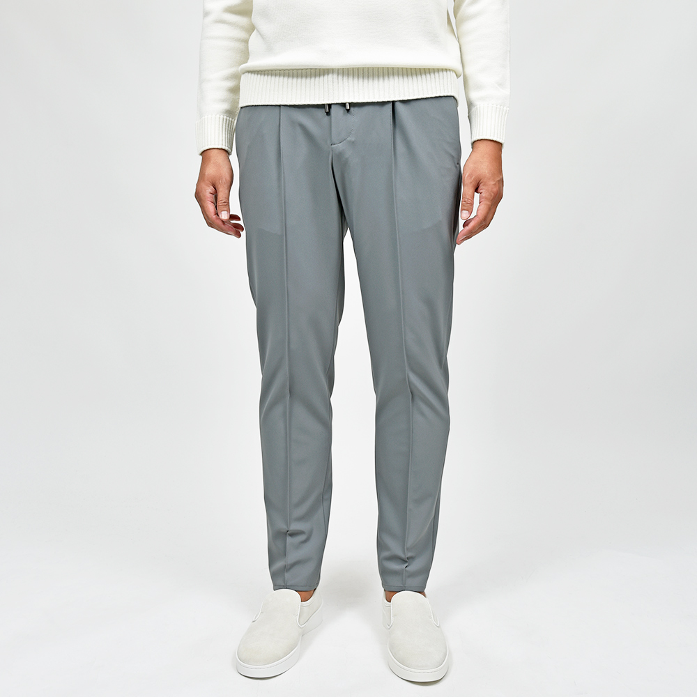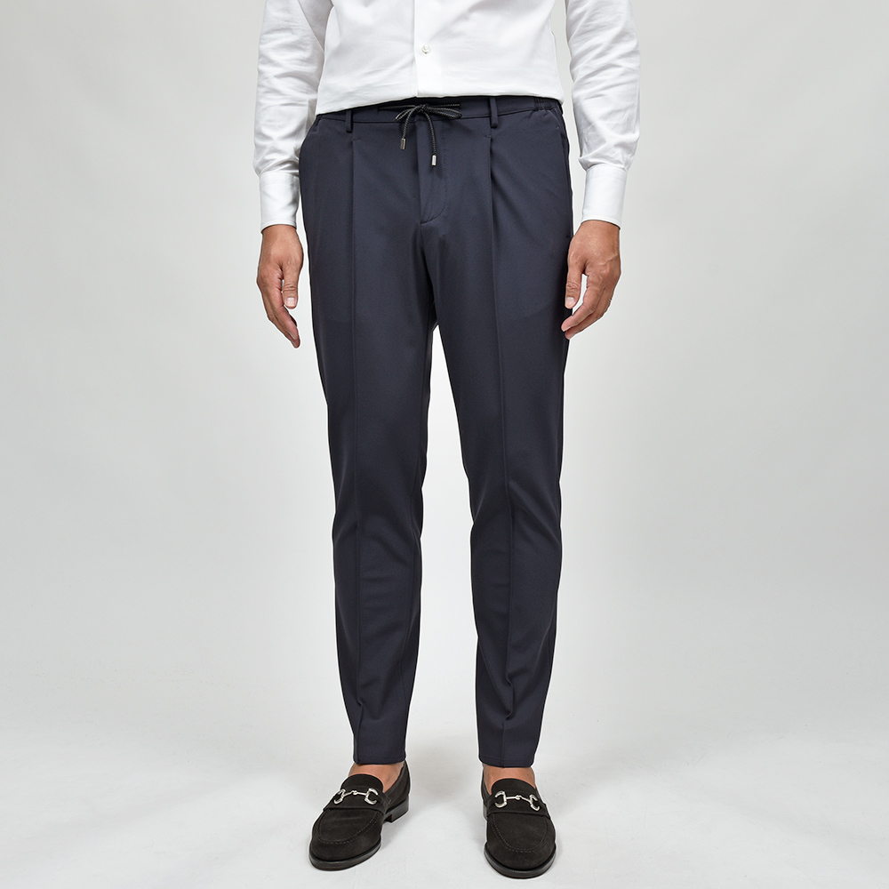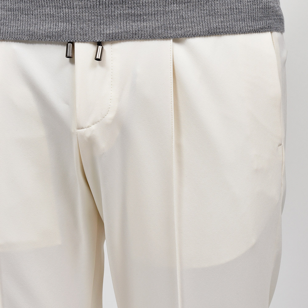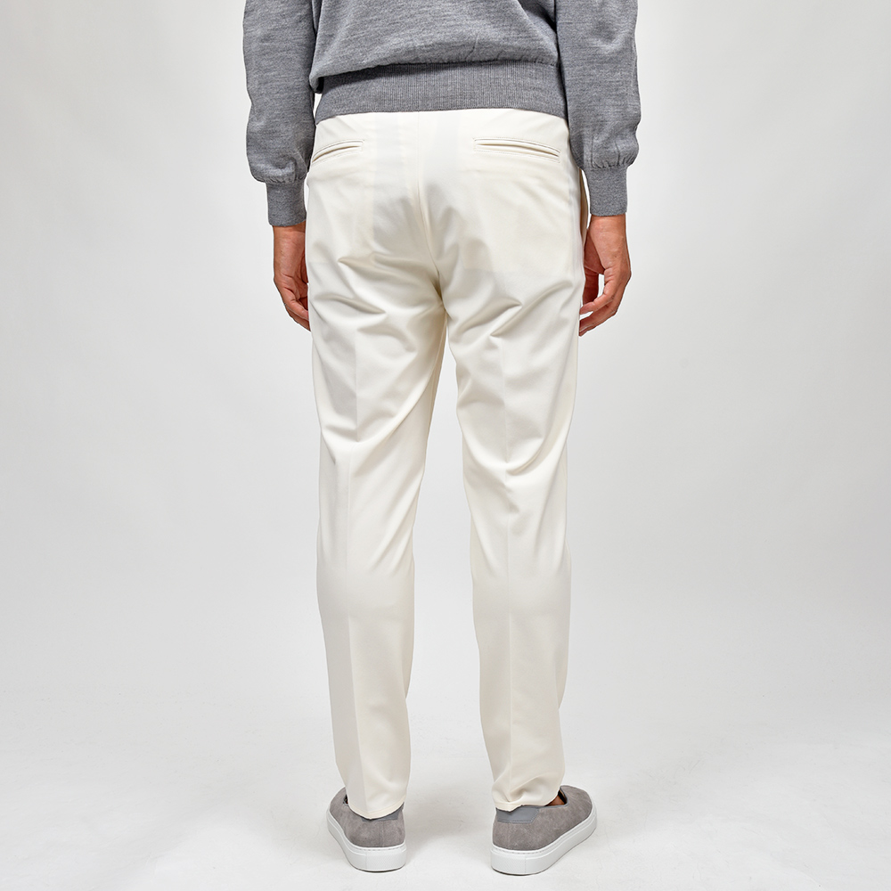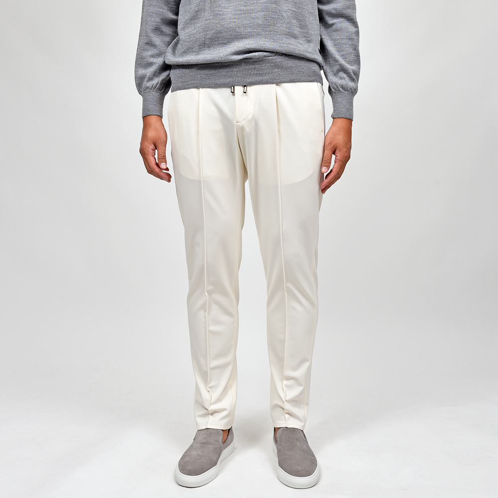MASACCIOはフロントクリースをステッチで抑えることで、美しいラインがいつまでも続く永遠を約束された特別な一本です。ウエストのサイドにはゴムが入っており、ウエストは4cmほど伸縮してくれるリラックスした穿き心地。ドローコードは内側に隠すことができるため、ベルトを巻くとビジネスにも対応する、リラック顔にもドレス顔にも変化の効く万能なアイテムです。