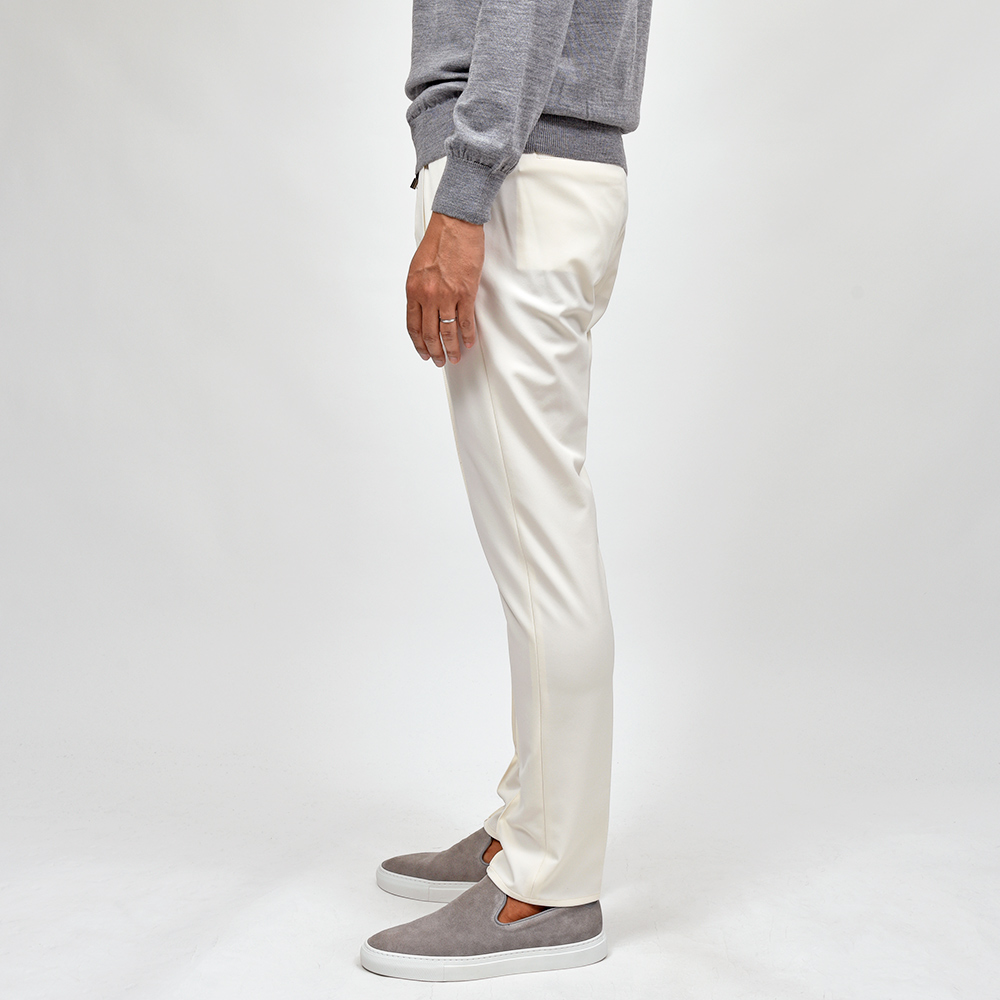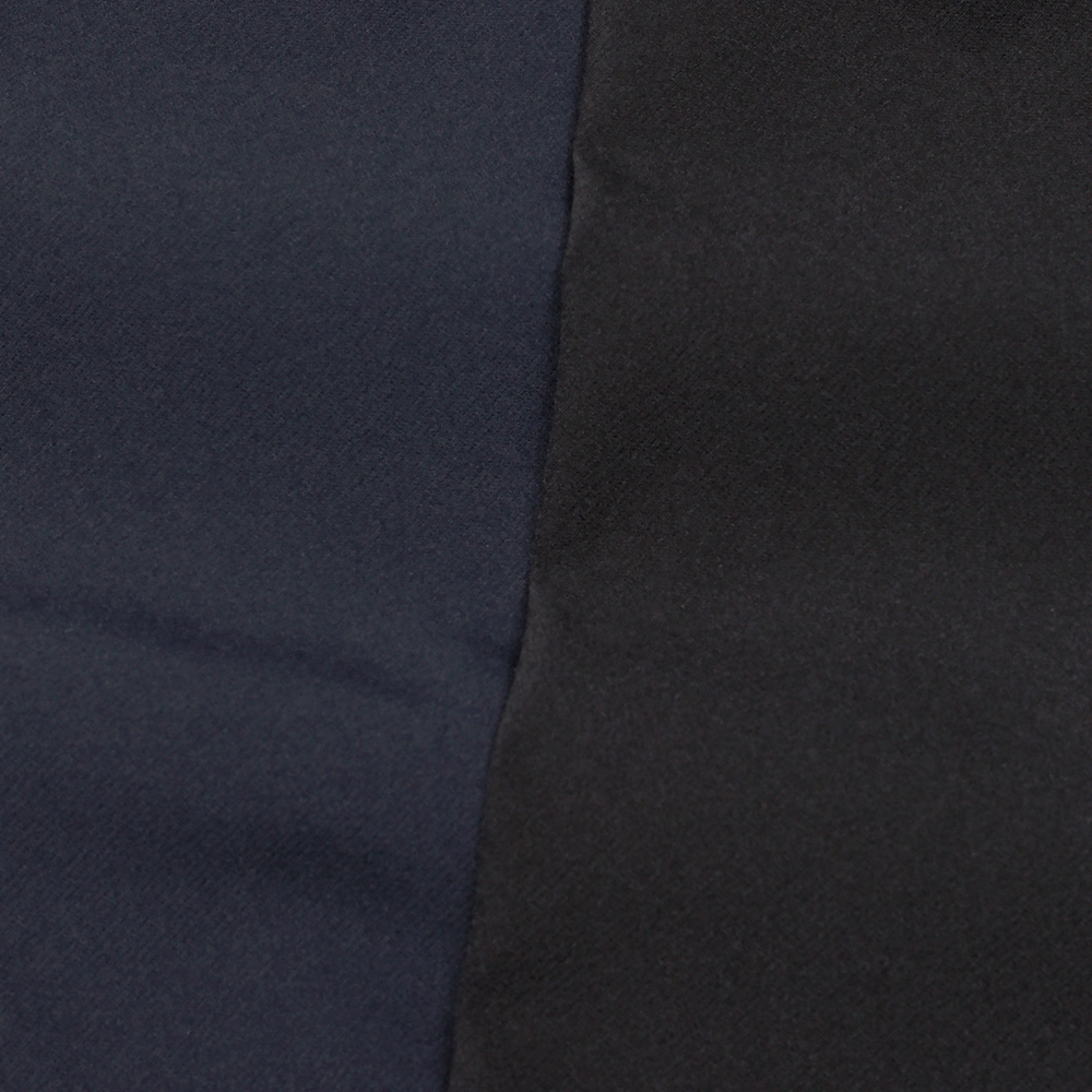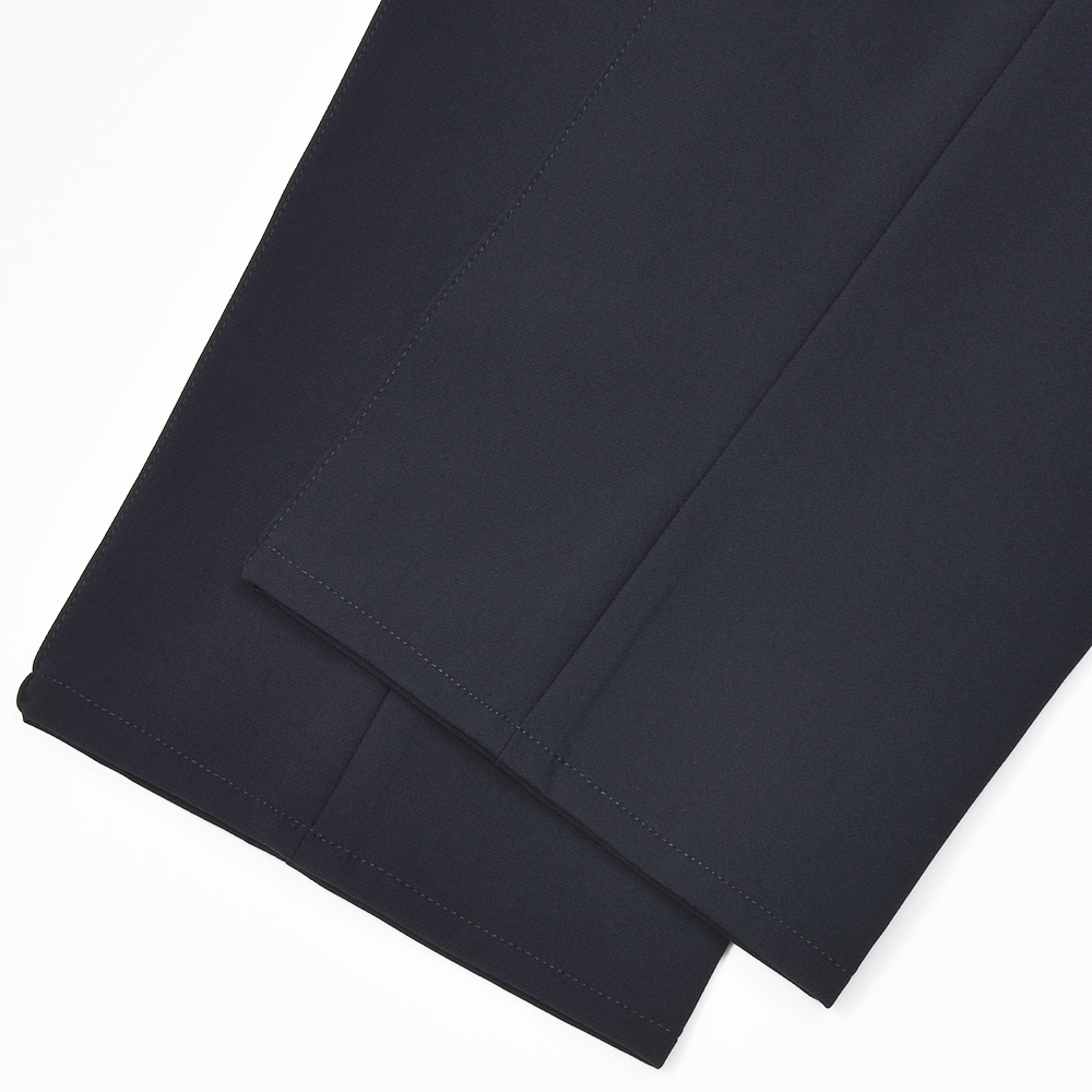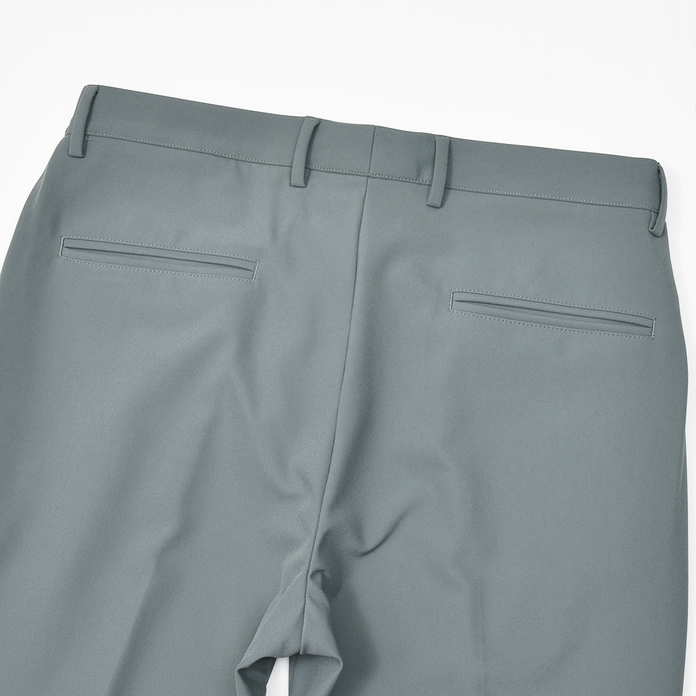 今シーズン登場したニューファブリックの“ナイロンツイルジャージー”。目付け350gの秋から春の3シーズンで着用できる薄すぎず暑すぎない程よいウエイトに、ジャージーらしいもっちりとした触感と、ナイロンらしい光沢感を併せ持った上品な佇まい。伸縮性は言わずもがなで、斜めだけではなく縦にも横にも伸びるためストレスのない穿き心地です。また、ジャージー素材でありながらもウォッシャブル仕様となっており、自宅で洗濯できるという大きなアドバンテージを持っています。