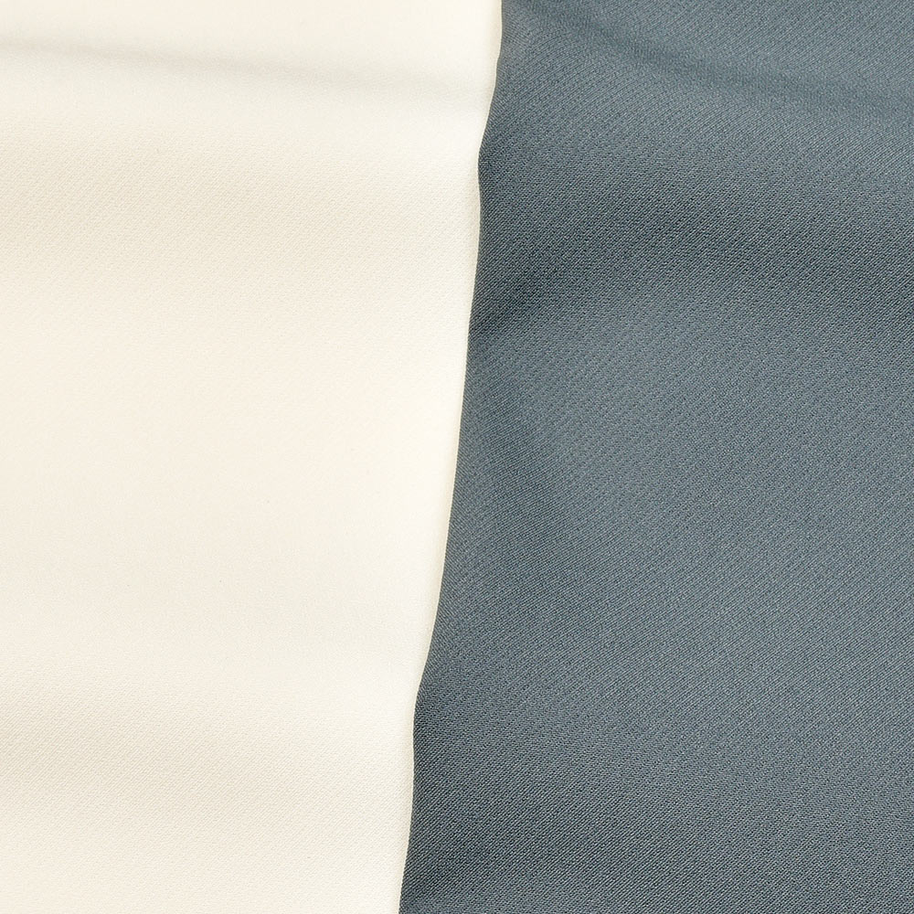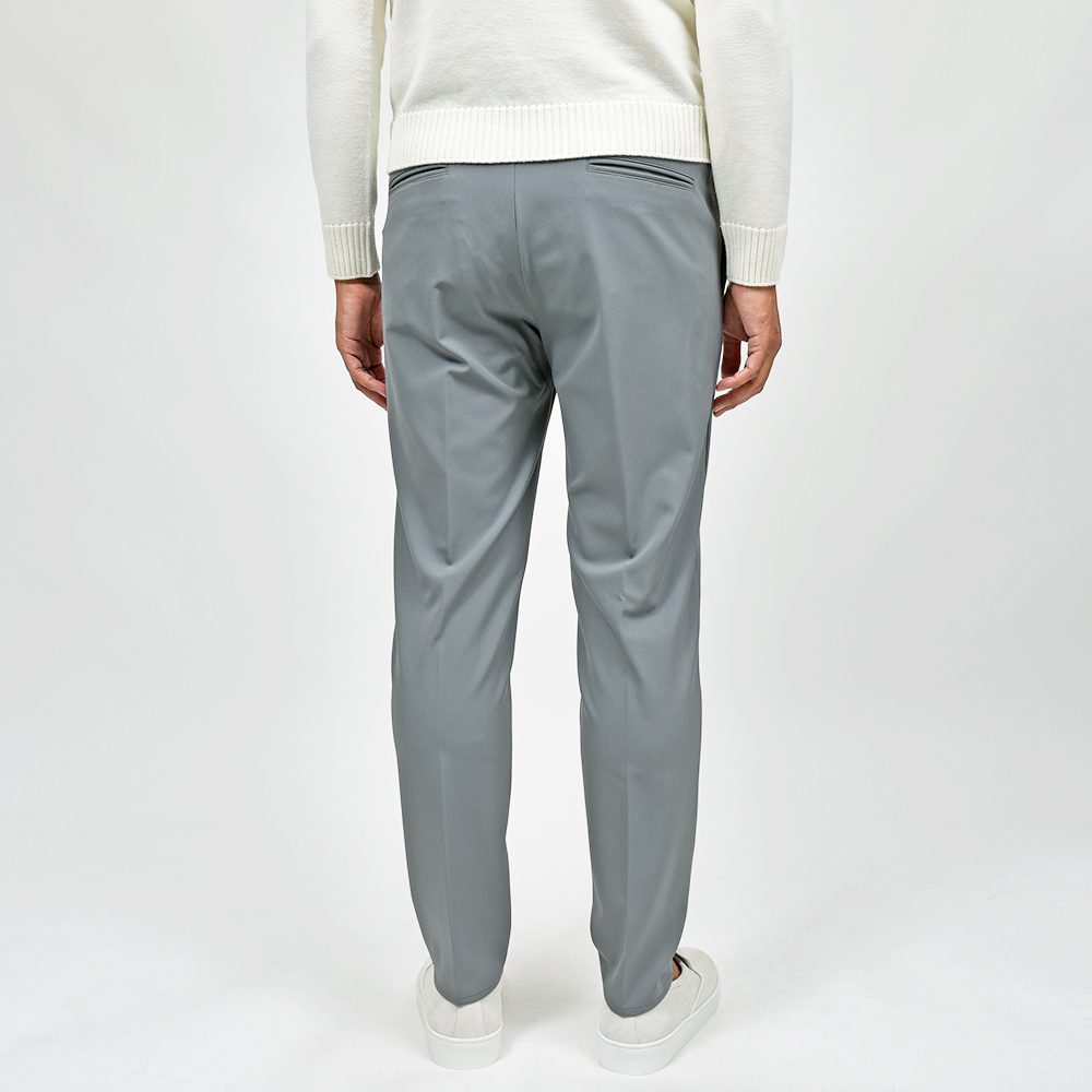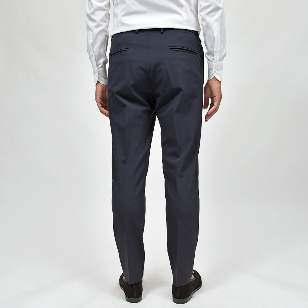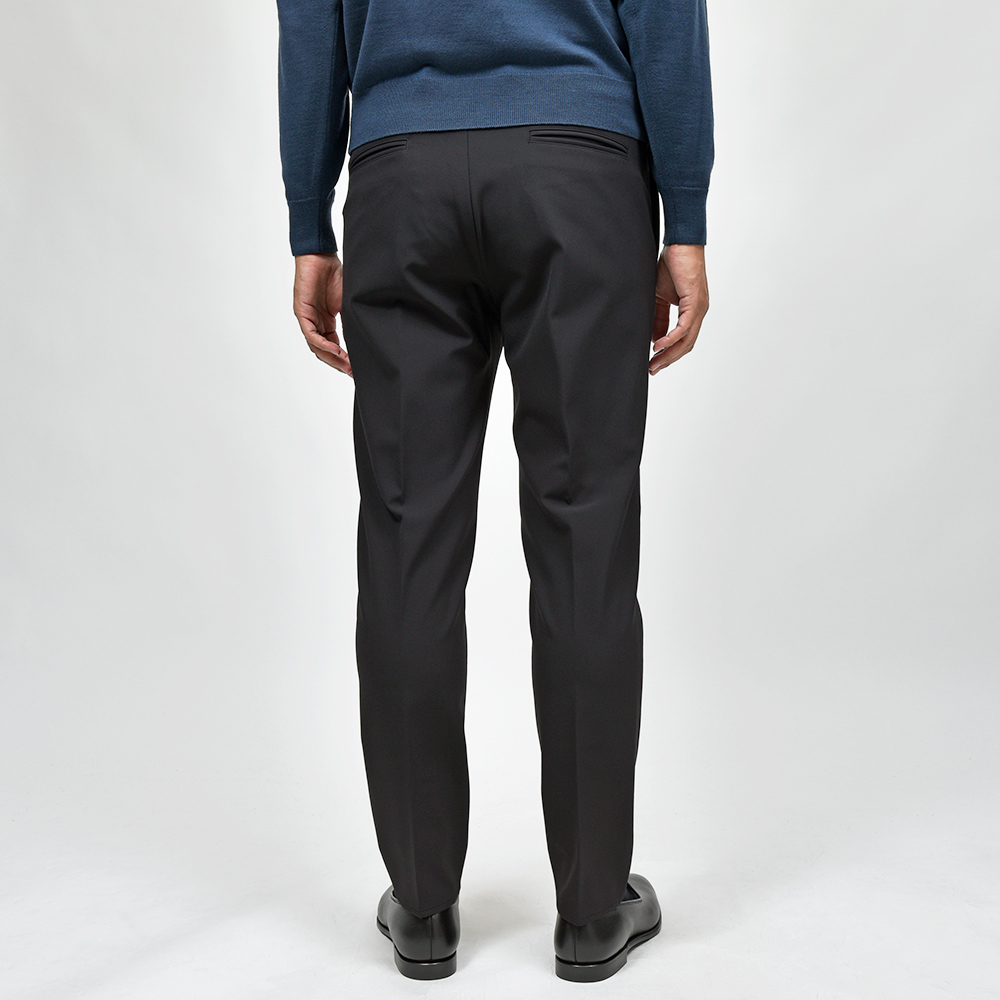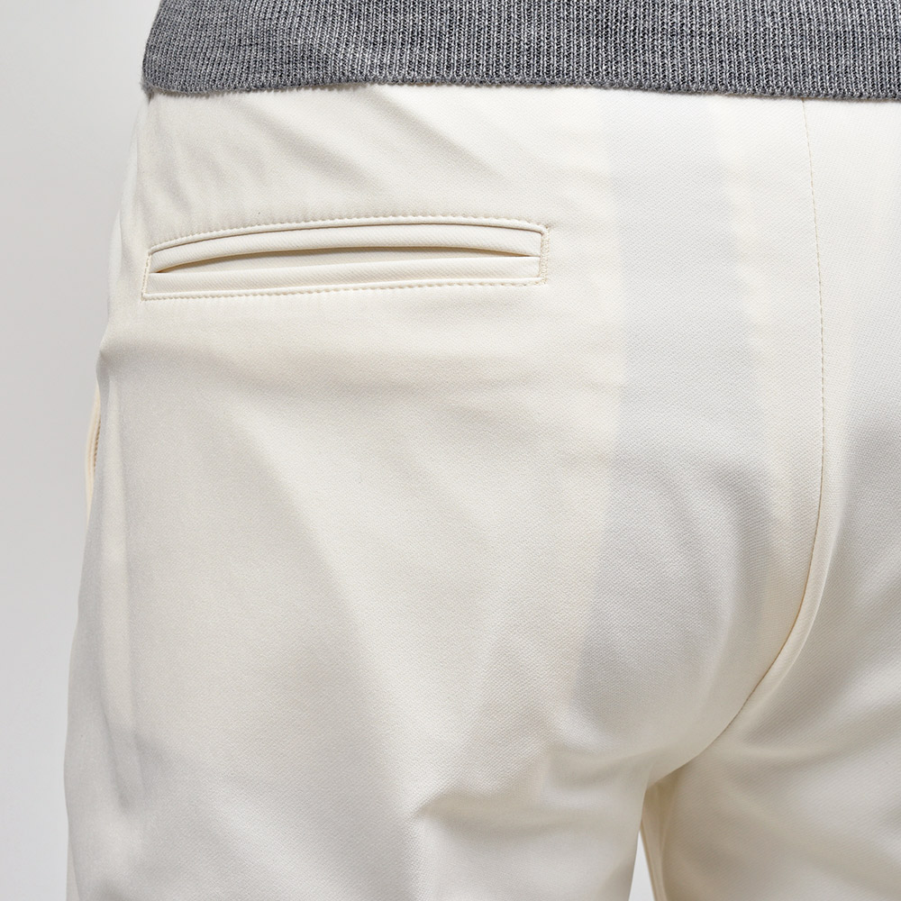 今シーズン登場したニューファブリックの“ナイロンツイルジャージー”。目付け350gの秋から春の3シーズンで着用できる薄すぎず暑すぎない程よいウエイトに、ジャージーらしいもっちりとした触感と、ナイロンらしい光沢感を併せ持った上品な佇まい。伸縮性は言わずもがなで、斜めだけではなく縦にも横にも伸びるためストレスのない穿き心地です。また、ジャージー素材でありながらもウォッシャブル仕様となっており、自宅で洗濯できるという大きなアドバンテージを持っています。