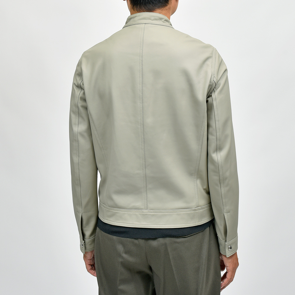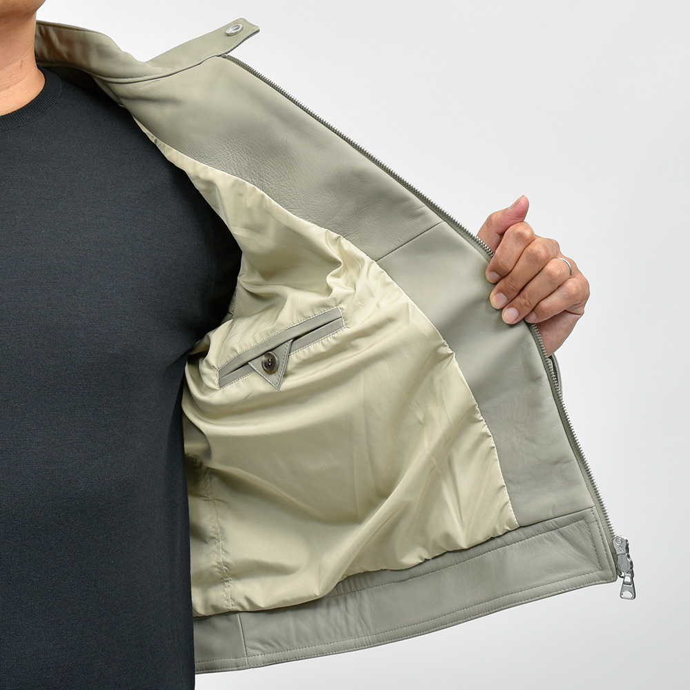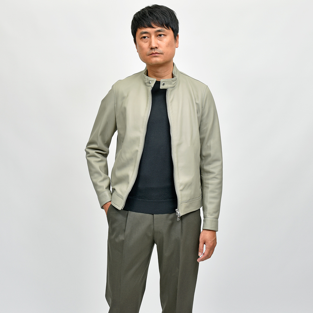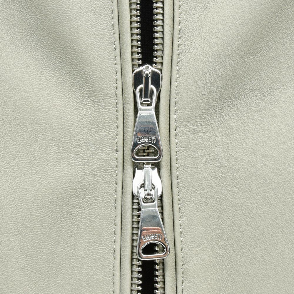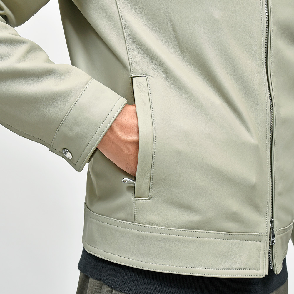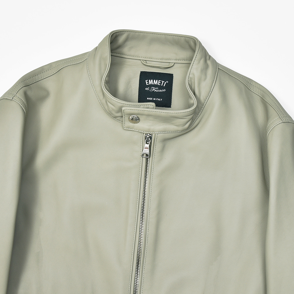 通常ラグジュアリーブランドで使用されているクオリティのレザーを、限りある着数分だけオーダーできる“SPレザー”シリーズ。こちらはEMMETI社では通常取り扱っていない、かなりしなやかで柔らかなラムレザーになります。レザーの表情はツルッとしていない、ややマットな質感で落ち着いた印象に。グレイッシュなオリーブやカーキといった色味ですので、派手な印象はなく程よい華やかさをスタイリングにもたらせてくれます。