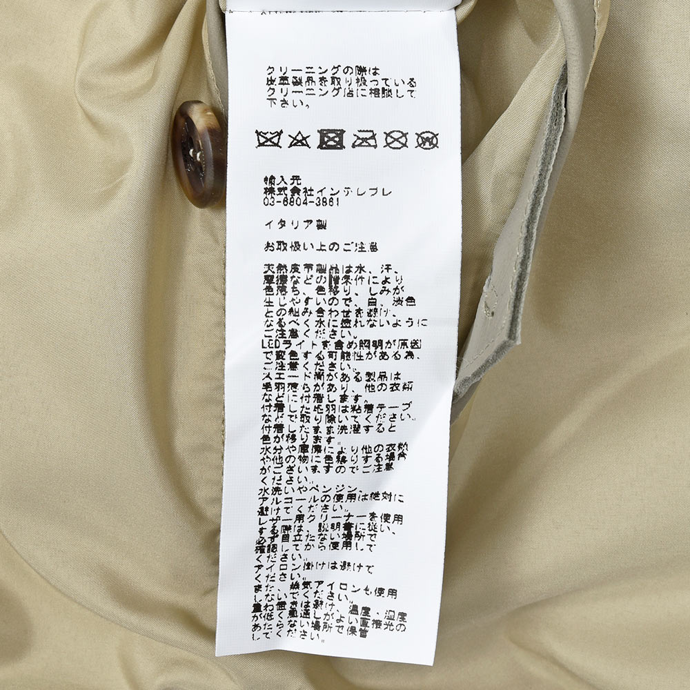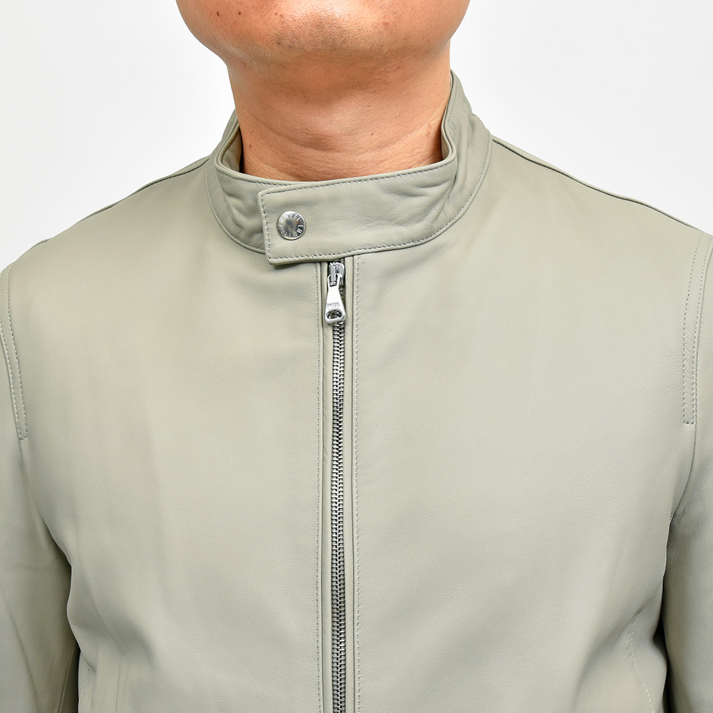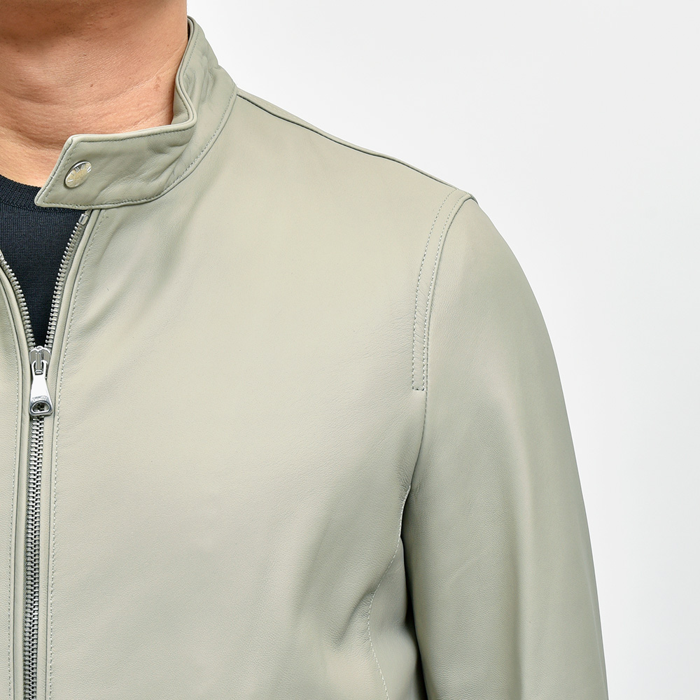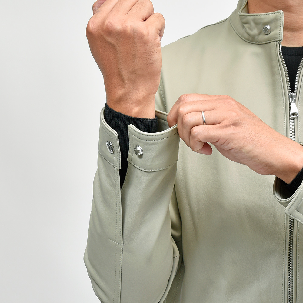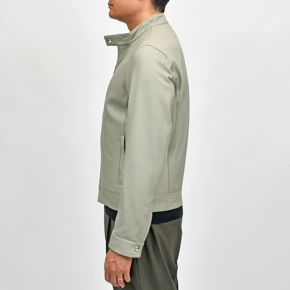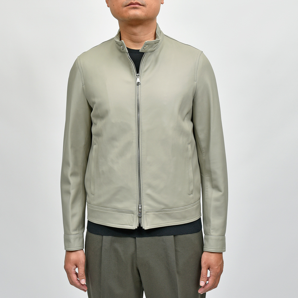通常ラグジュアリーブランドで使用されているクオリティのレザーを、限りある着数分だけオーダーできる“SPレザー”シリーズ。こちらはEMMETI社では通常取り扱っていない、かなりしなやかで柔らかなラムレザーになります。レザーの表情はツルッとしていない、ややマットな質感で落ち着いた印象に。グレイッシュなオリーブやカーキといった色味ですので、派手な印象はなく程よい華やかさをスタイリングにもたらせてくれます。