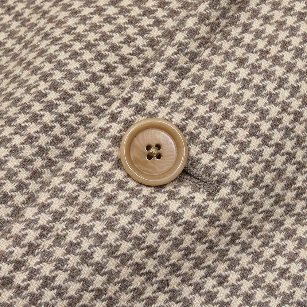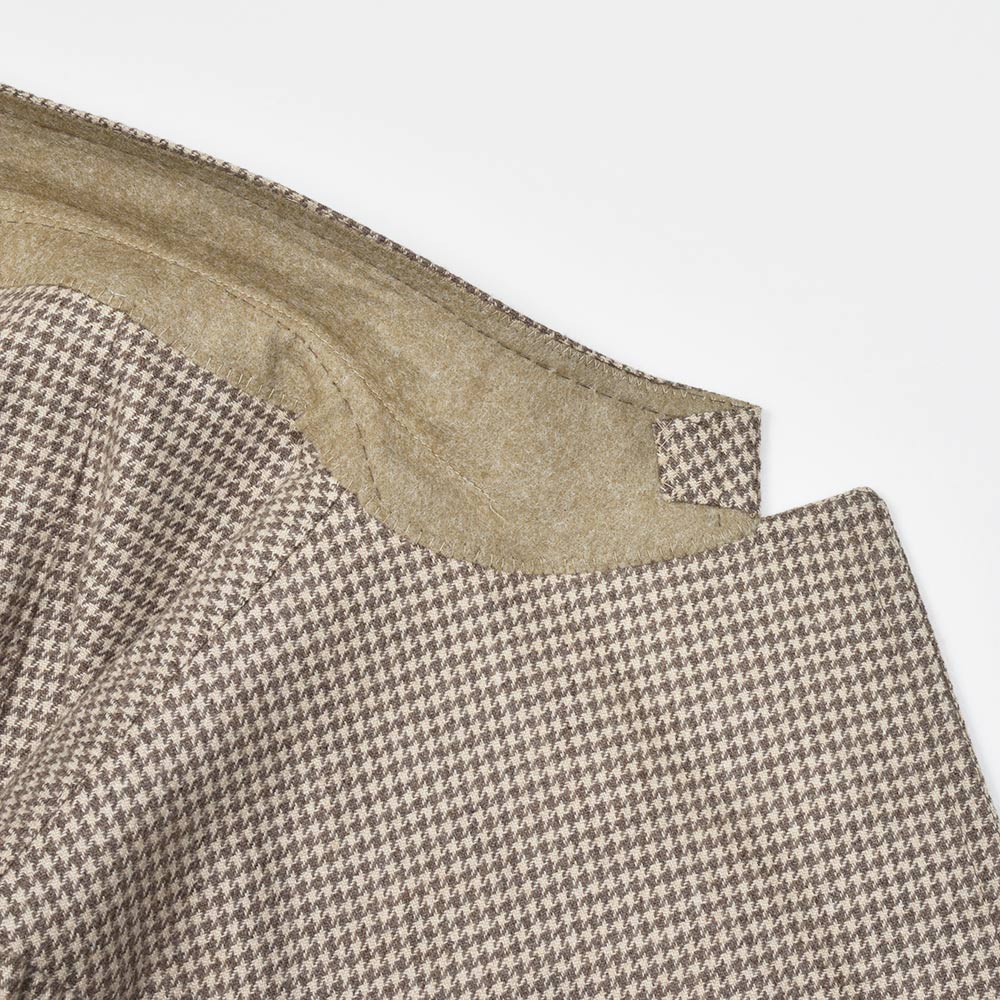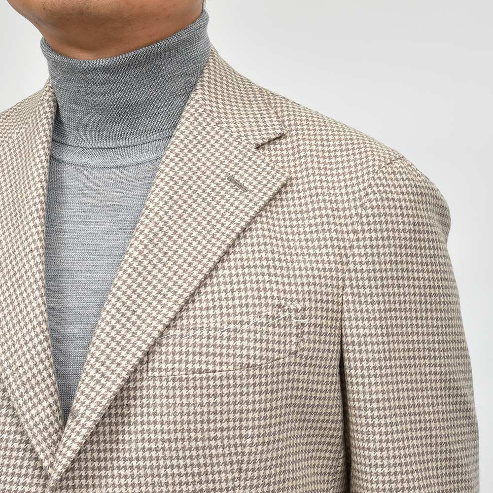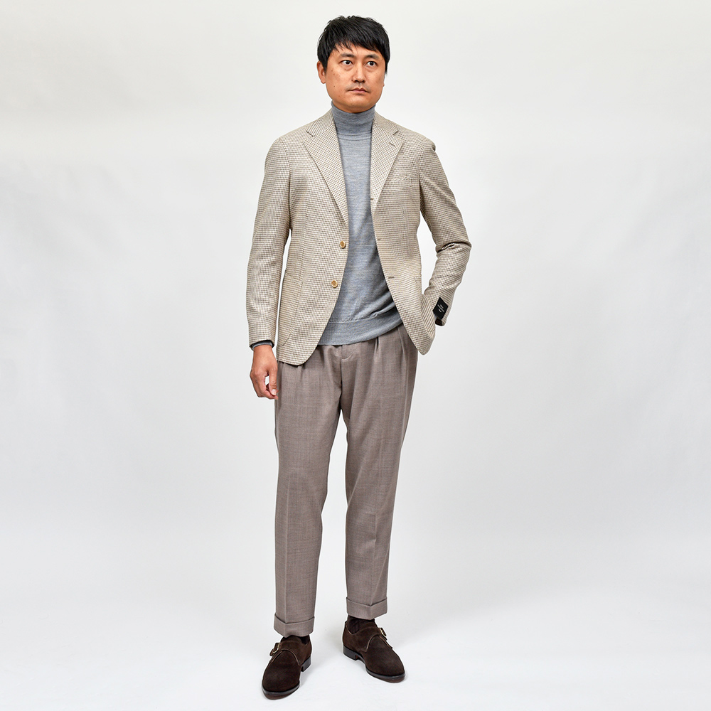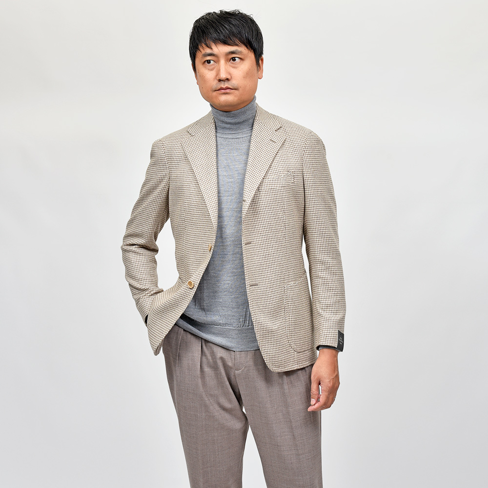 軽過ぎず重過ぎない程よい目付けのカシミヤ素材は、柔らかく滑らかで上品な風合いがクラス感ある佇まい。ベージュ×グレーベージュという同色系を使用したハウンドトゥースですので、柄が悪目立ちせずナチュラルでシックな雰囲気を作り上げてくれます。