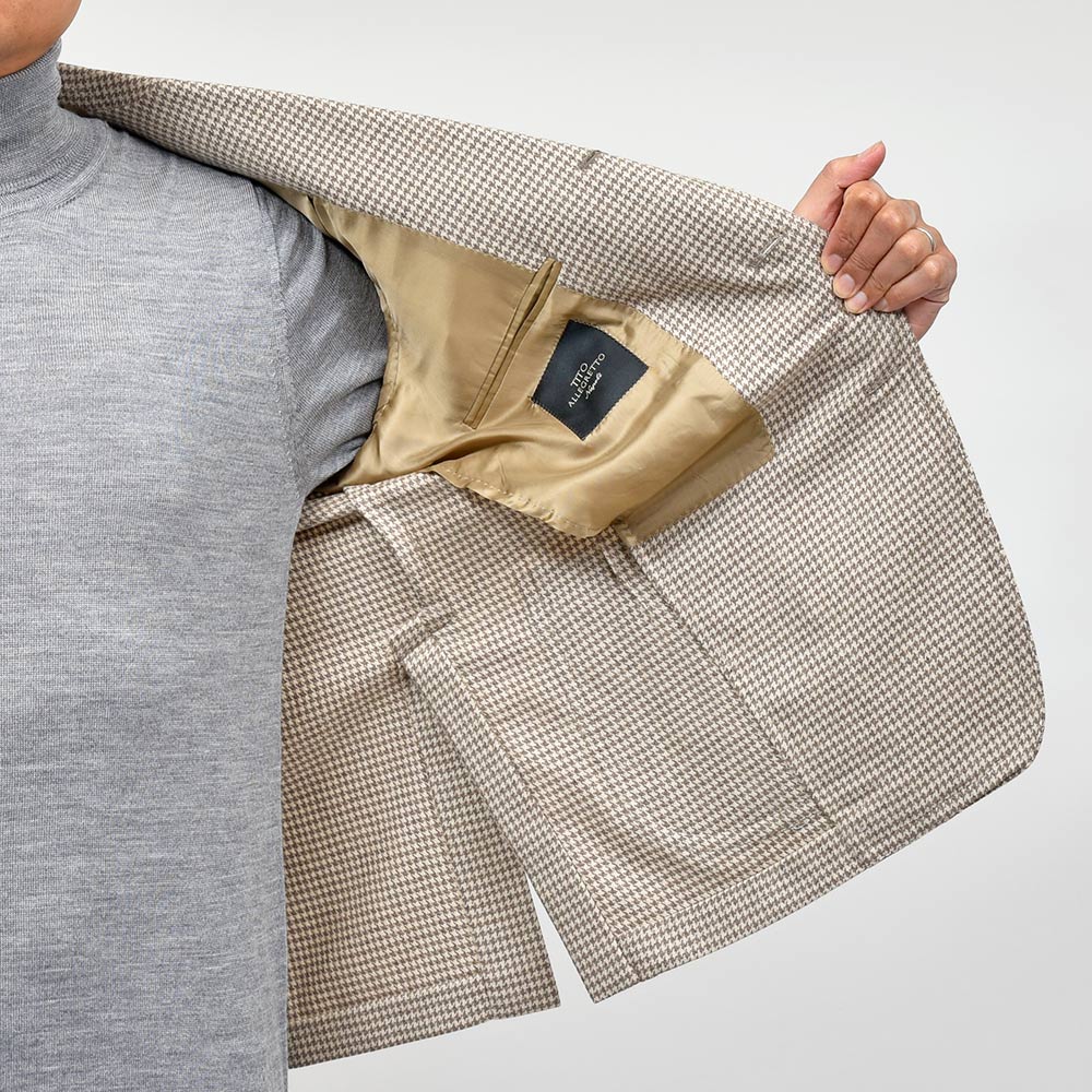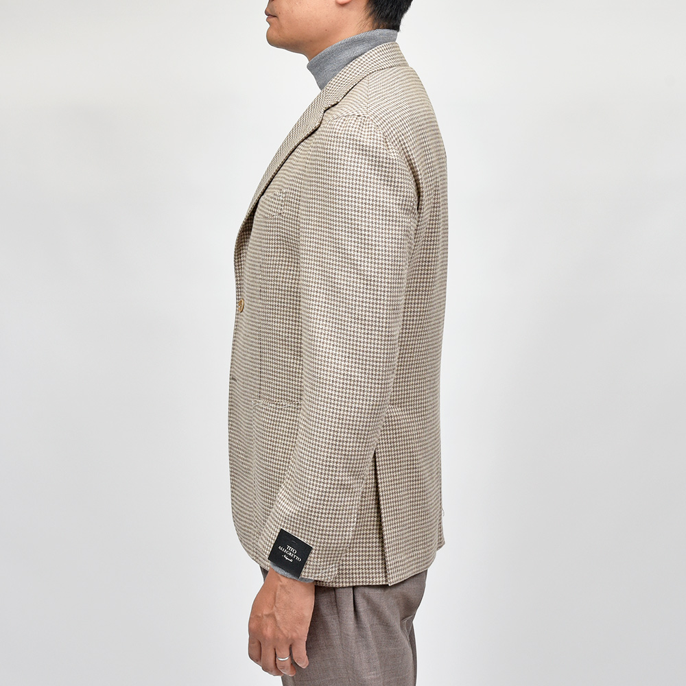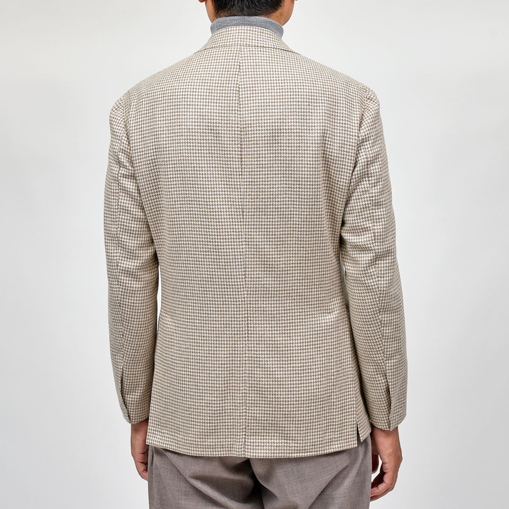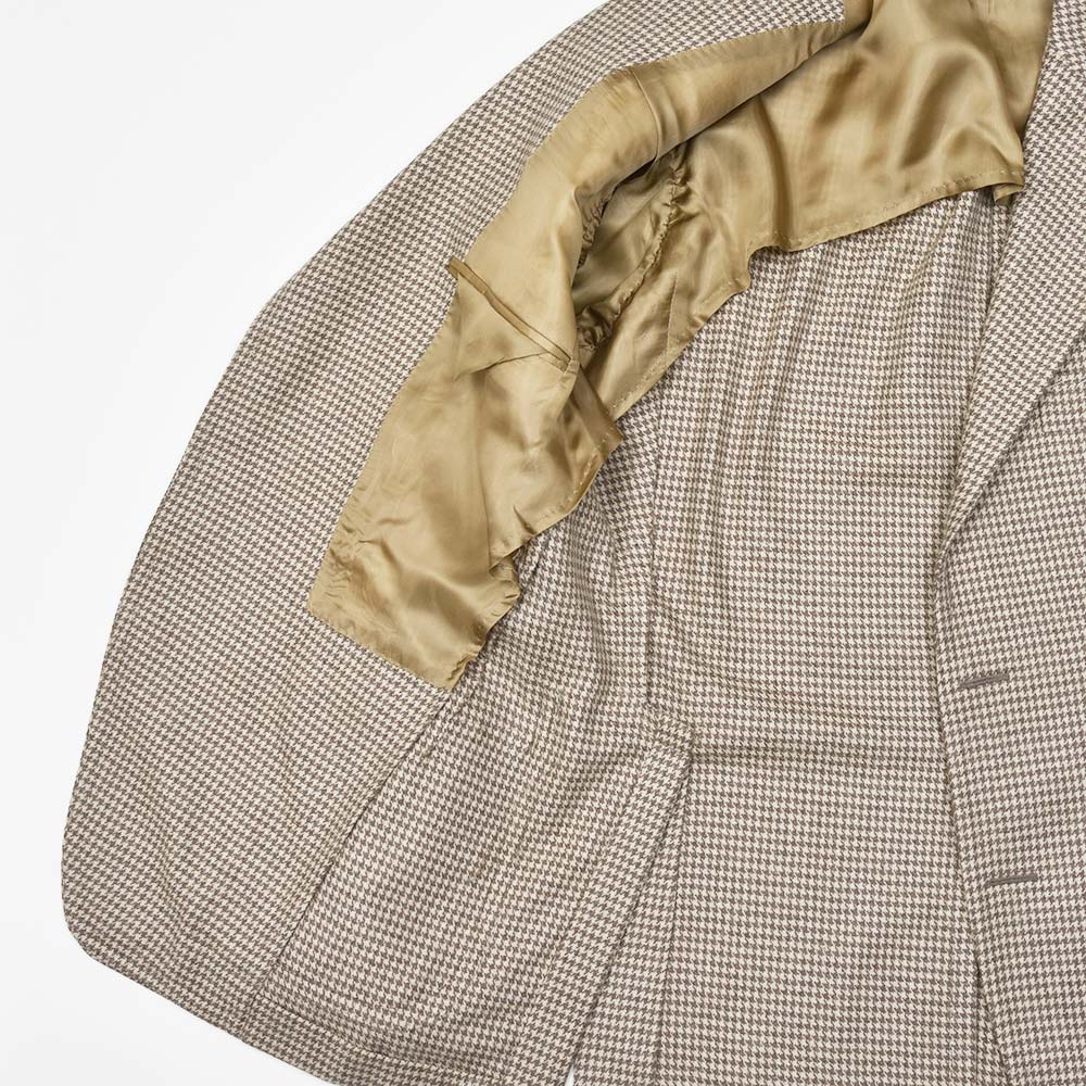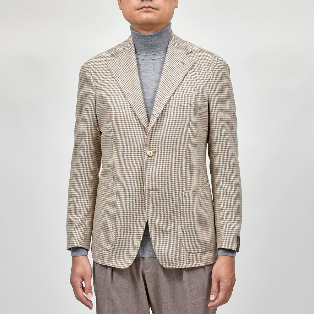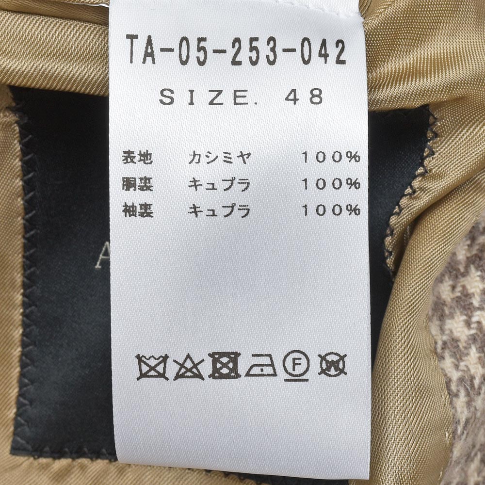 サイズ48がジャストサイズです。タイトすぎず、緩すぎずちょうどいいサイジングです。見た感じの雰囲気はスッキリとしています。ライトベージュのハウンドトゥースにカシミヤがマッチしたジャケットです!