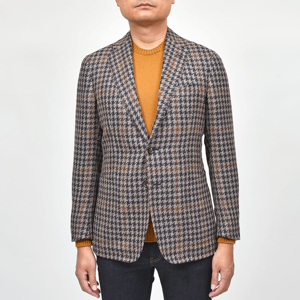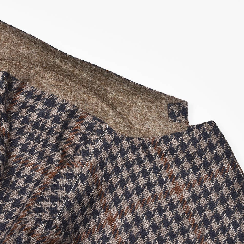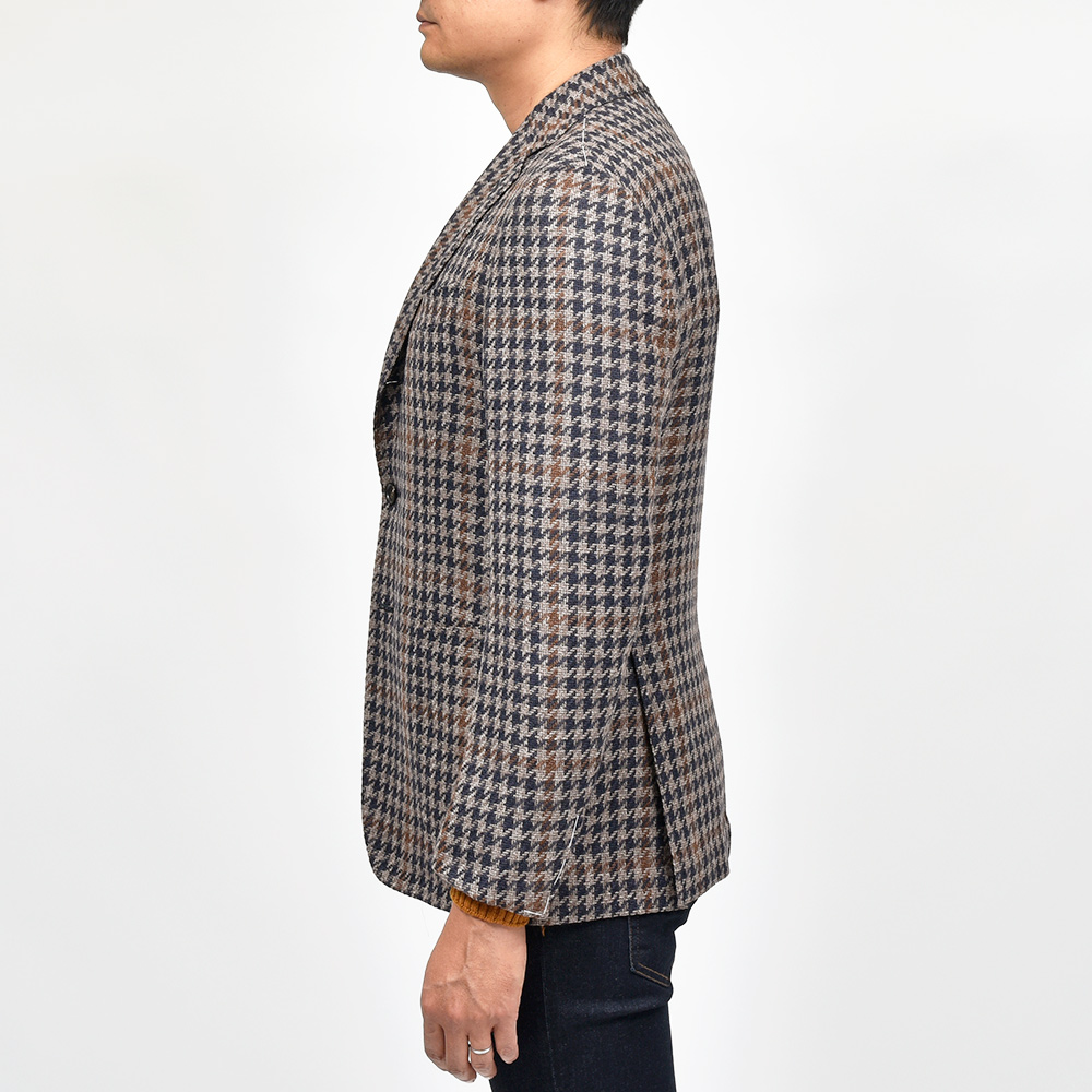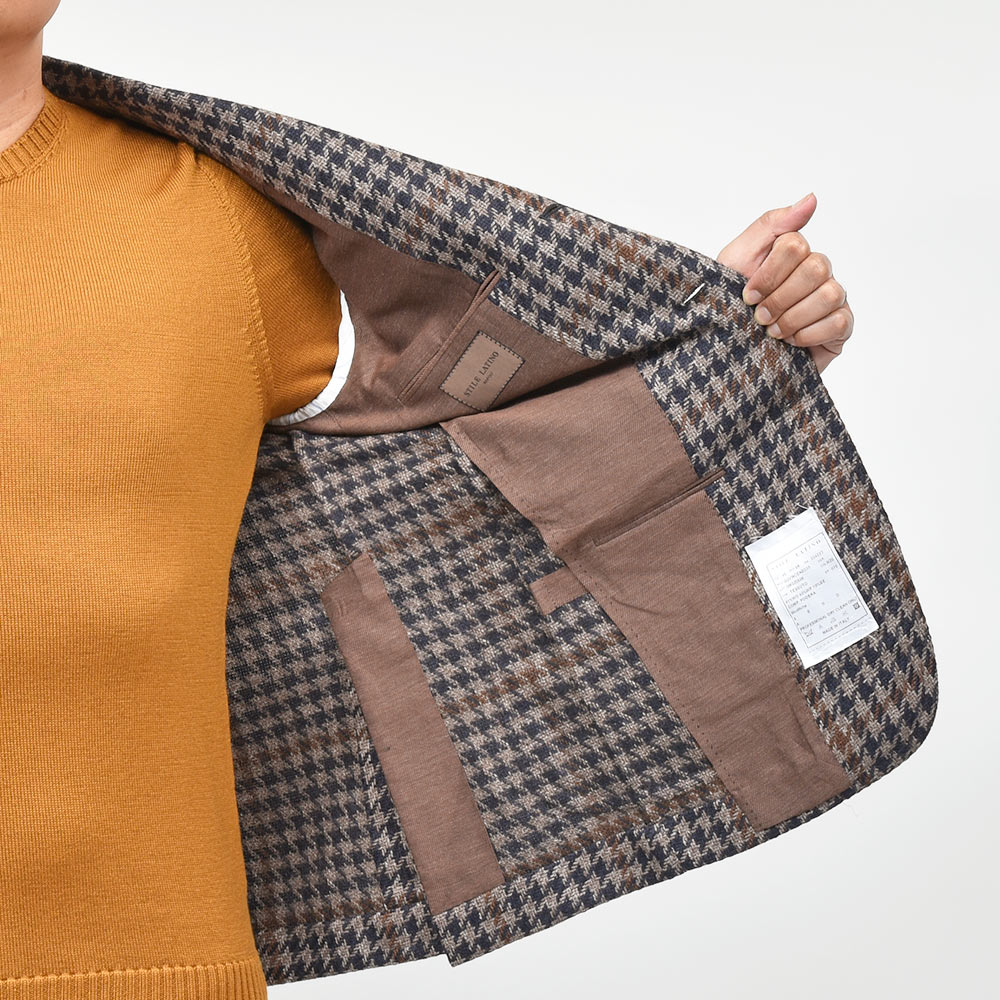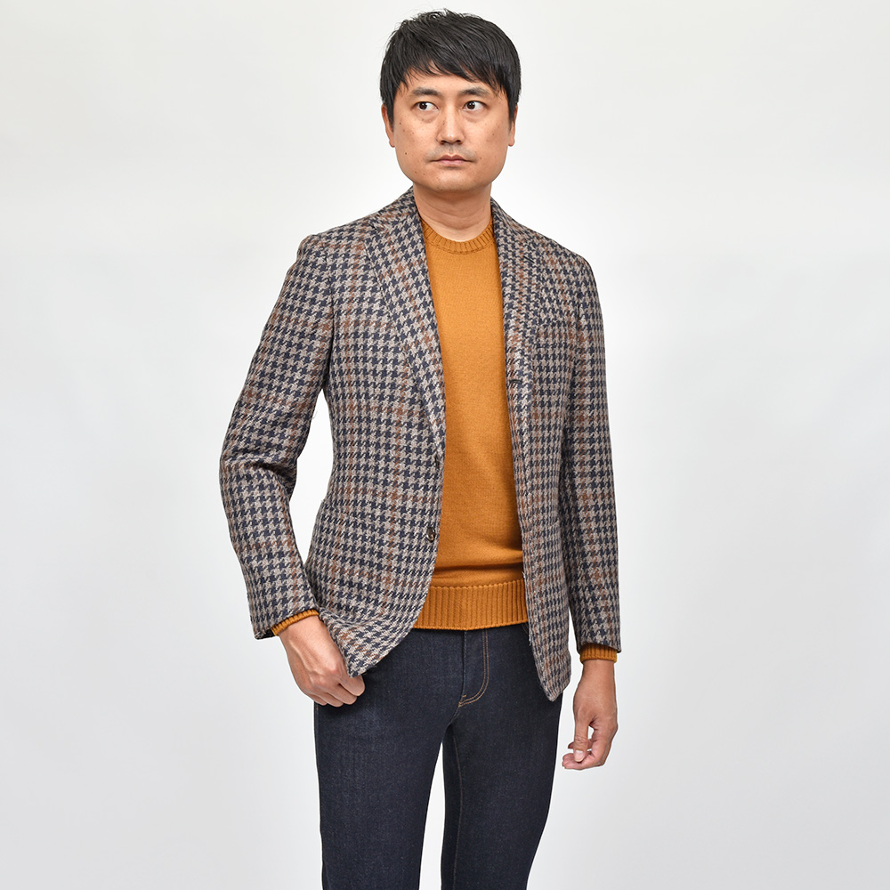 ツイード調の見た目ですが、目付け280gと秋冬素材では非常に軽いウエイトのハウンドトゥース。起毛感はありながらも目付けが軽いため、昨今の気候が加味された一着となっています。またこちらは、イタリアを代表する生地メーカー“FERLA(フェルラ)”にSTILE LATINOが別注したエクスクルーシブファブリックになります。STILE LATINOらしいやや大柄なハウンドトゥースは、グレーベージュとダークネイビーのハウンドトゥースにブラウンのペーンがなんとも言えない色気を香らせています。
