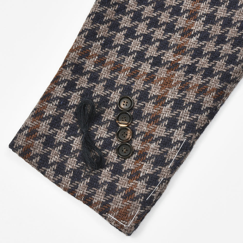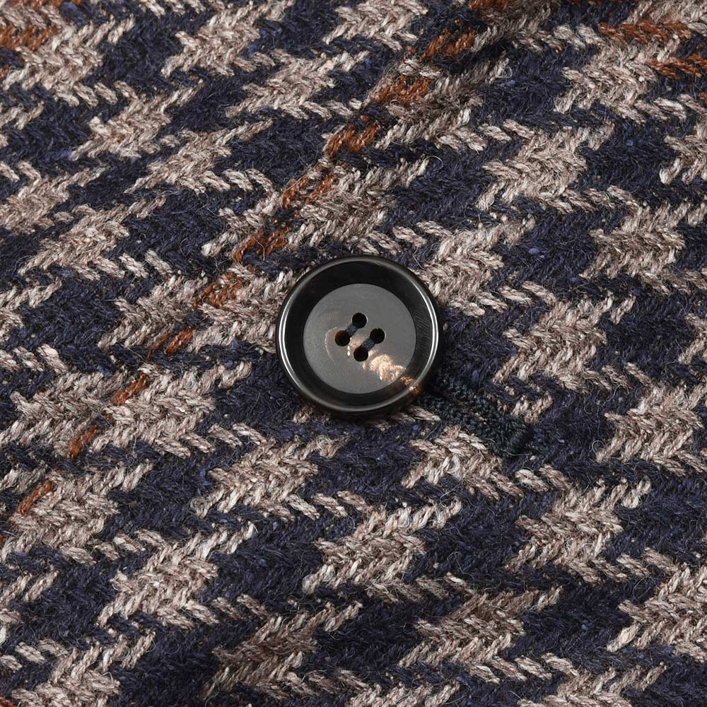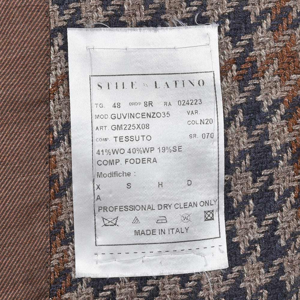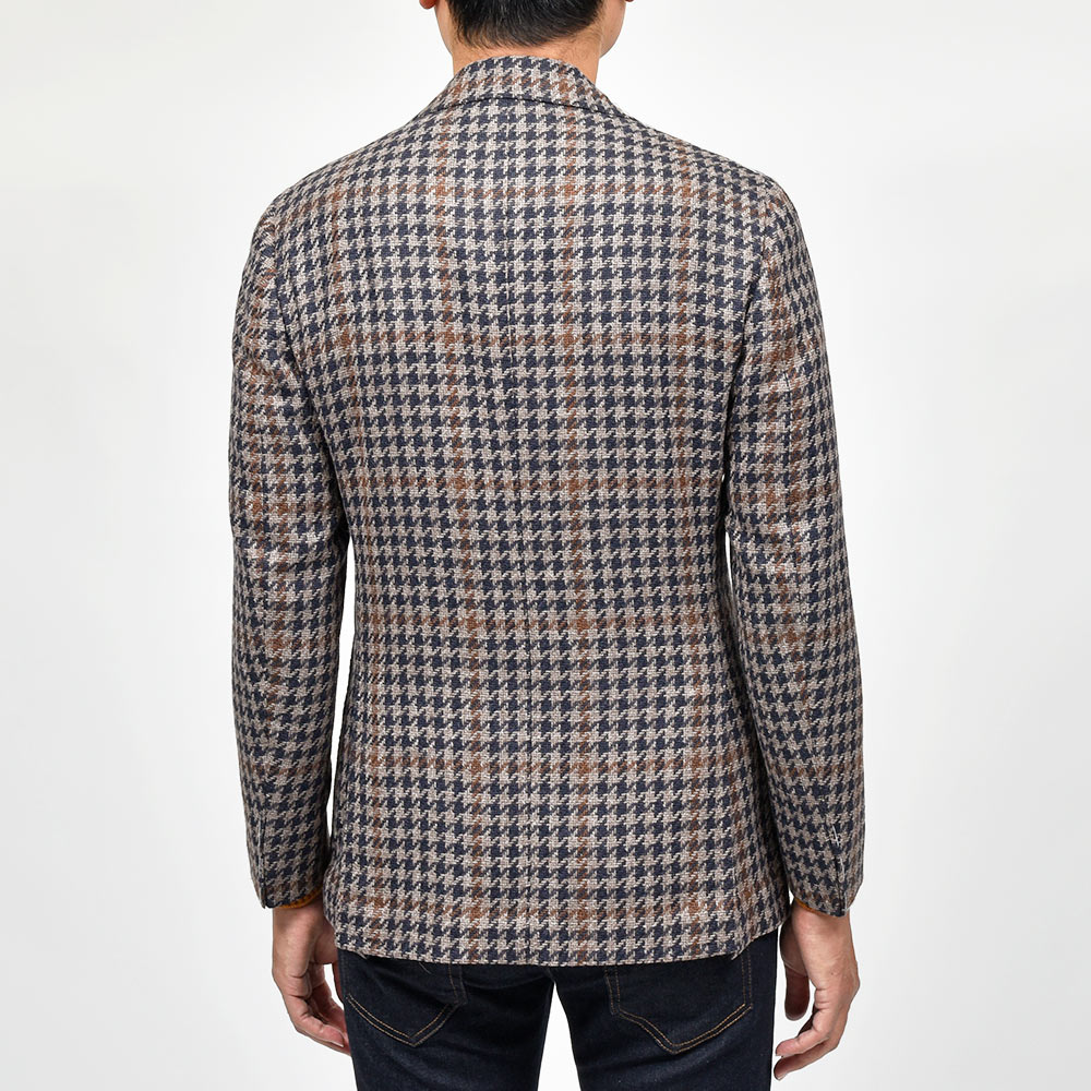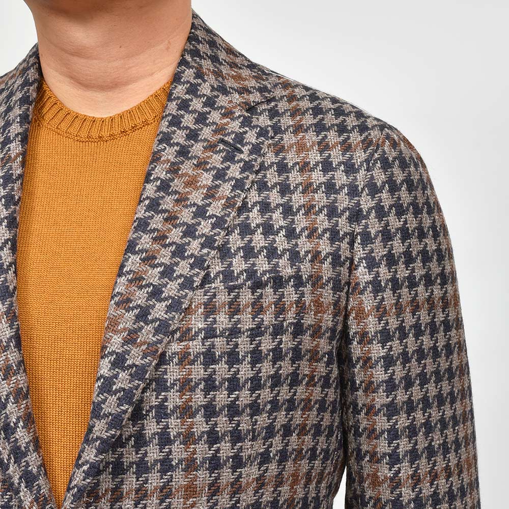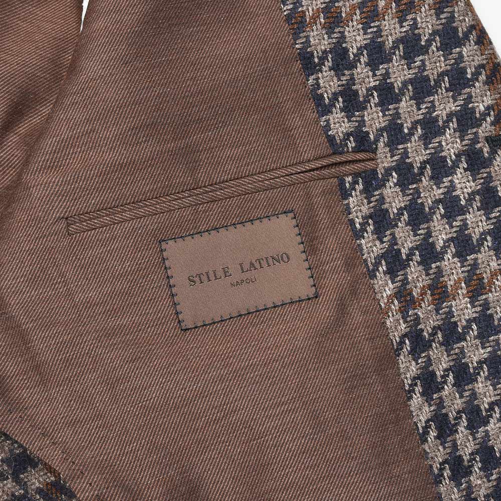 ツイード調の見た目ですが、目付け280gと秋冬素材では非常に軽いウエイトのハウンドトゥース。起毛感はありながらも目付けが軽いため、昨今の気候が加味された一着となっています。またこちらは、イタリアを代表する生地メーカー“FERLA(フェルラ)”にSTILE LATINOが別注したエクスクルーシブファブリックになります。STILE LATINOらしいやや大柄なハウンドトゥースは、グレーベージュとダークネイビーのハウンドトゥースにブラウンのペーンがなんとも言えない色気を香らせています。