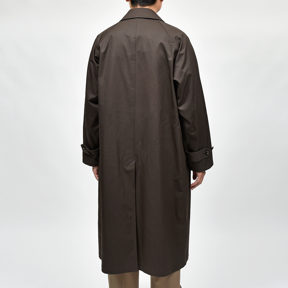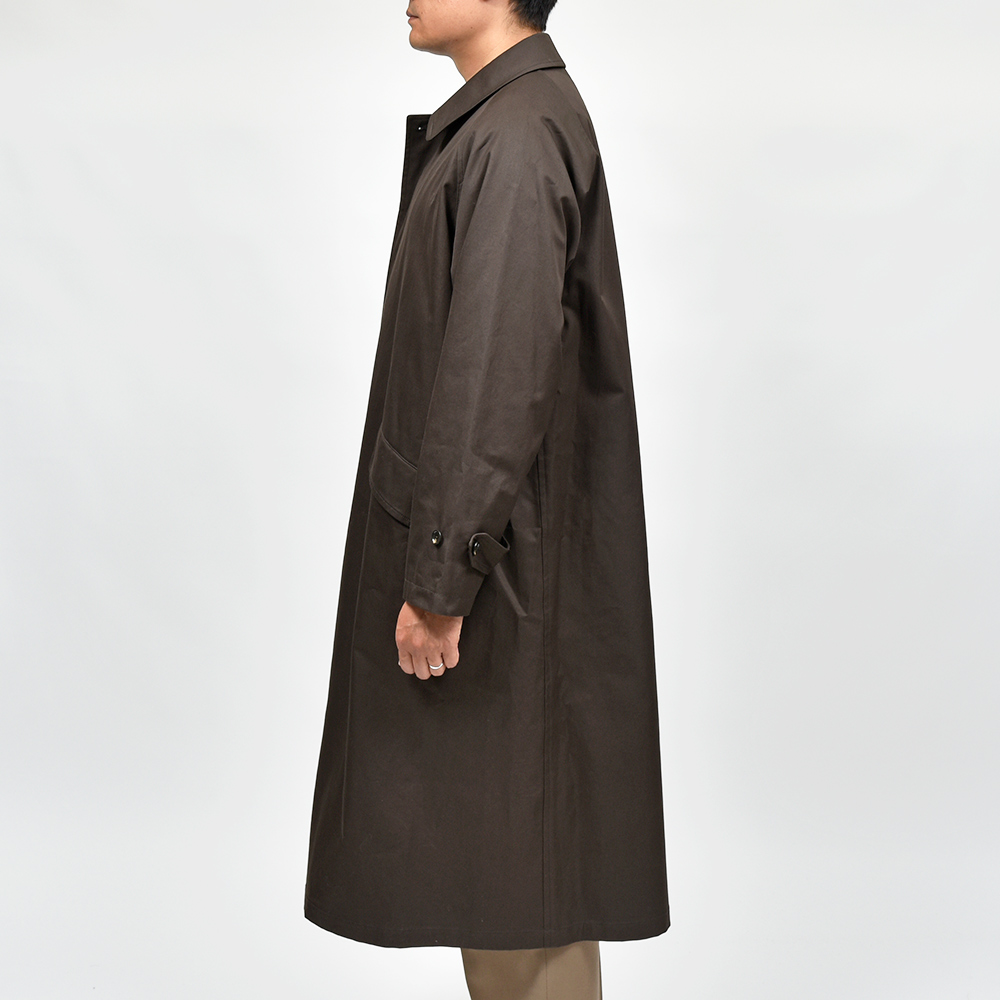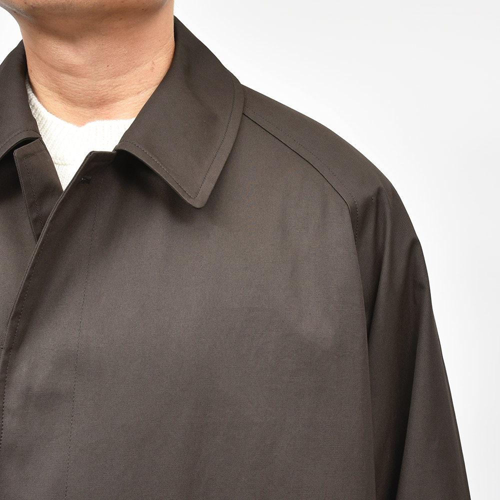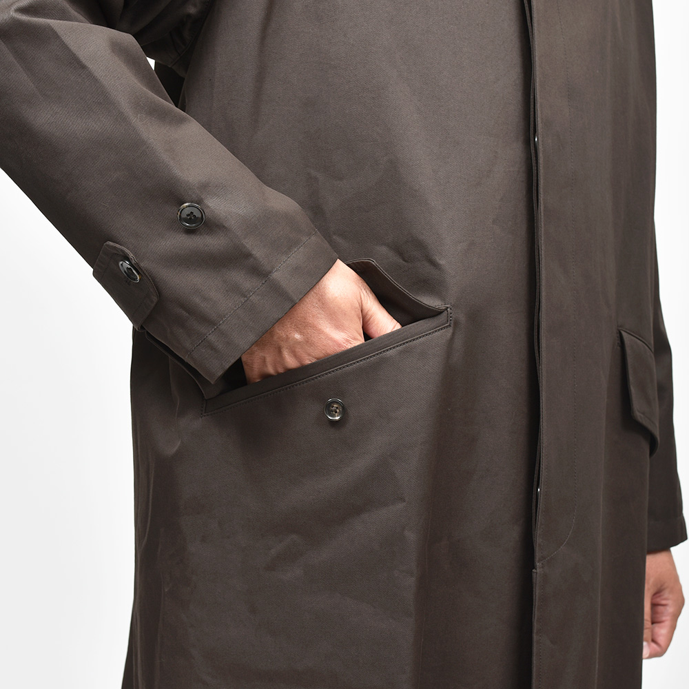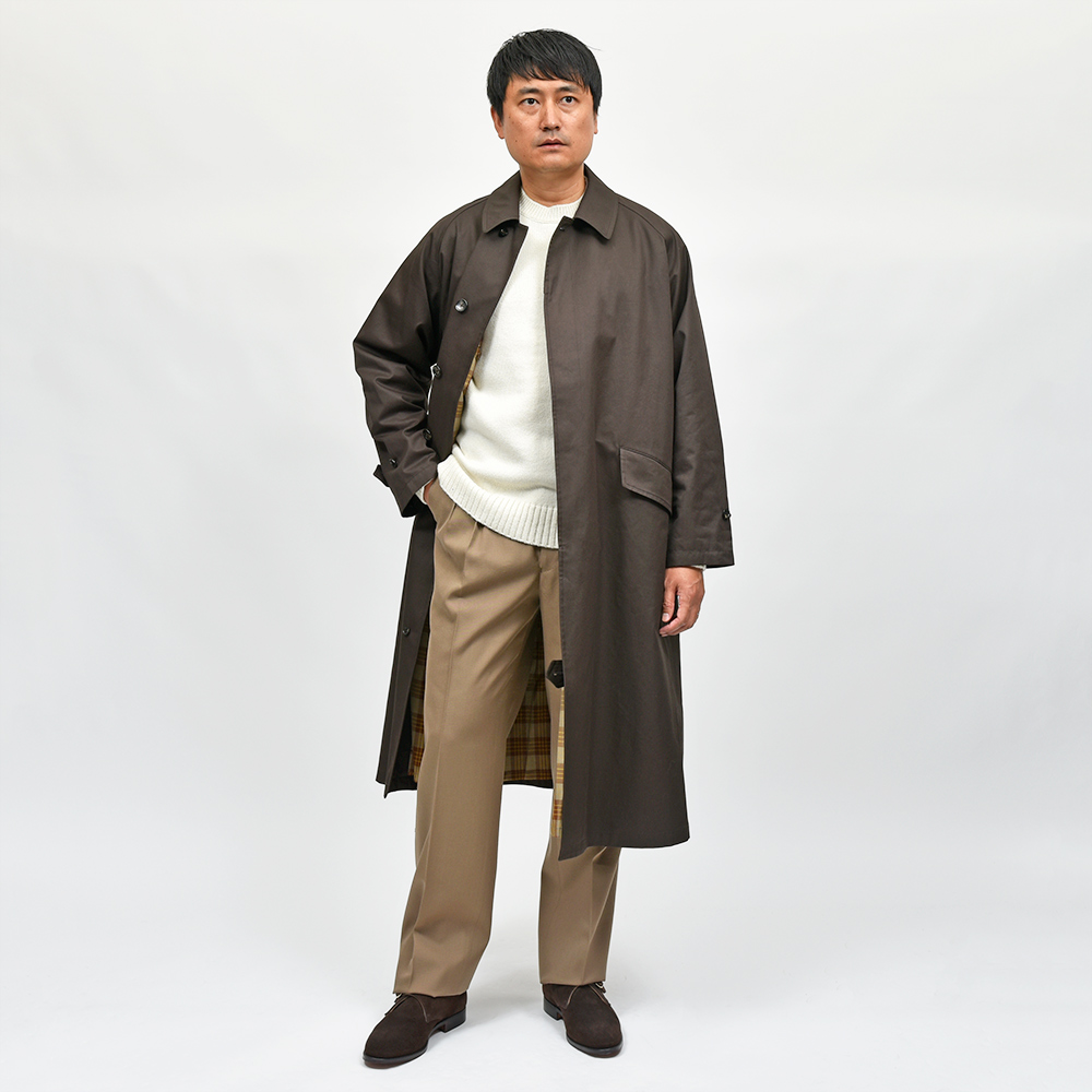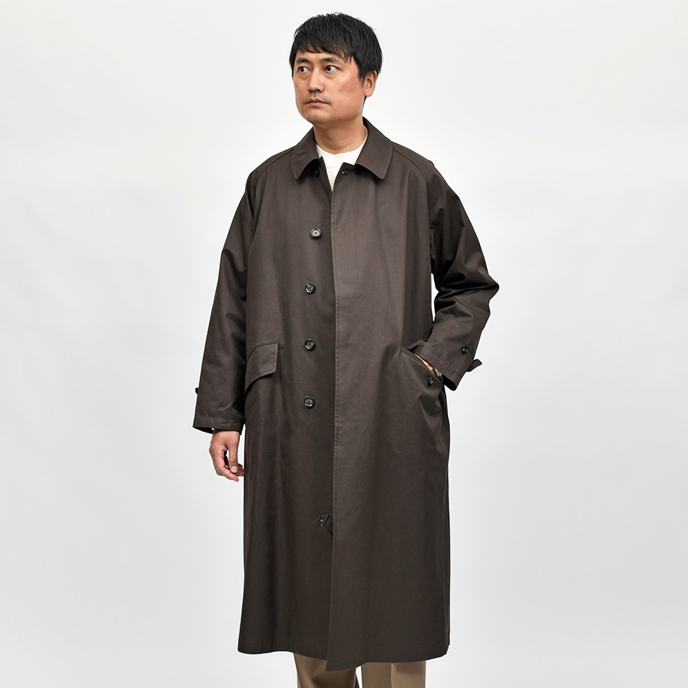 汎用性の高いコットン素材を使用したオーバーコートは、今流れがきているシックなダークブラウンの色味がなんとも言えない雰囲気を醸し出します。