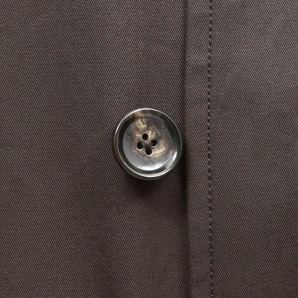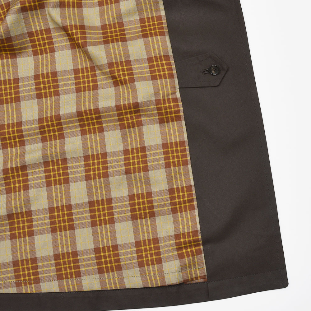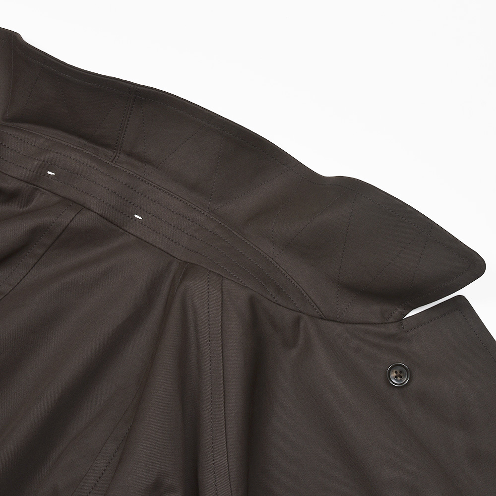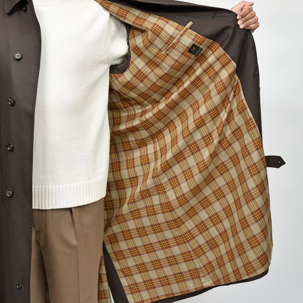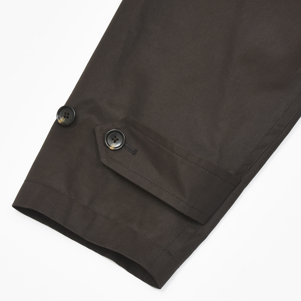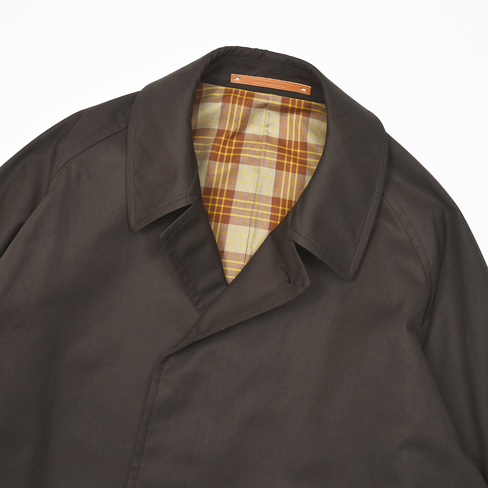 汎用性の高いコットン素材を使用したオーバーコートは、今流れがきているシックなダークブラウンの色味がなんとも言えない雰囲気を醸し出します。