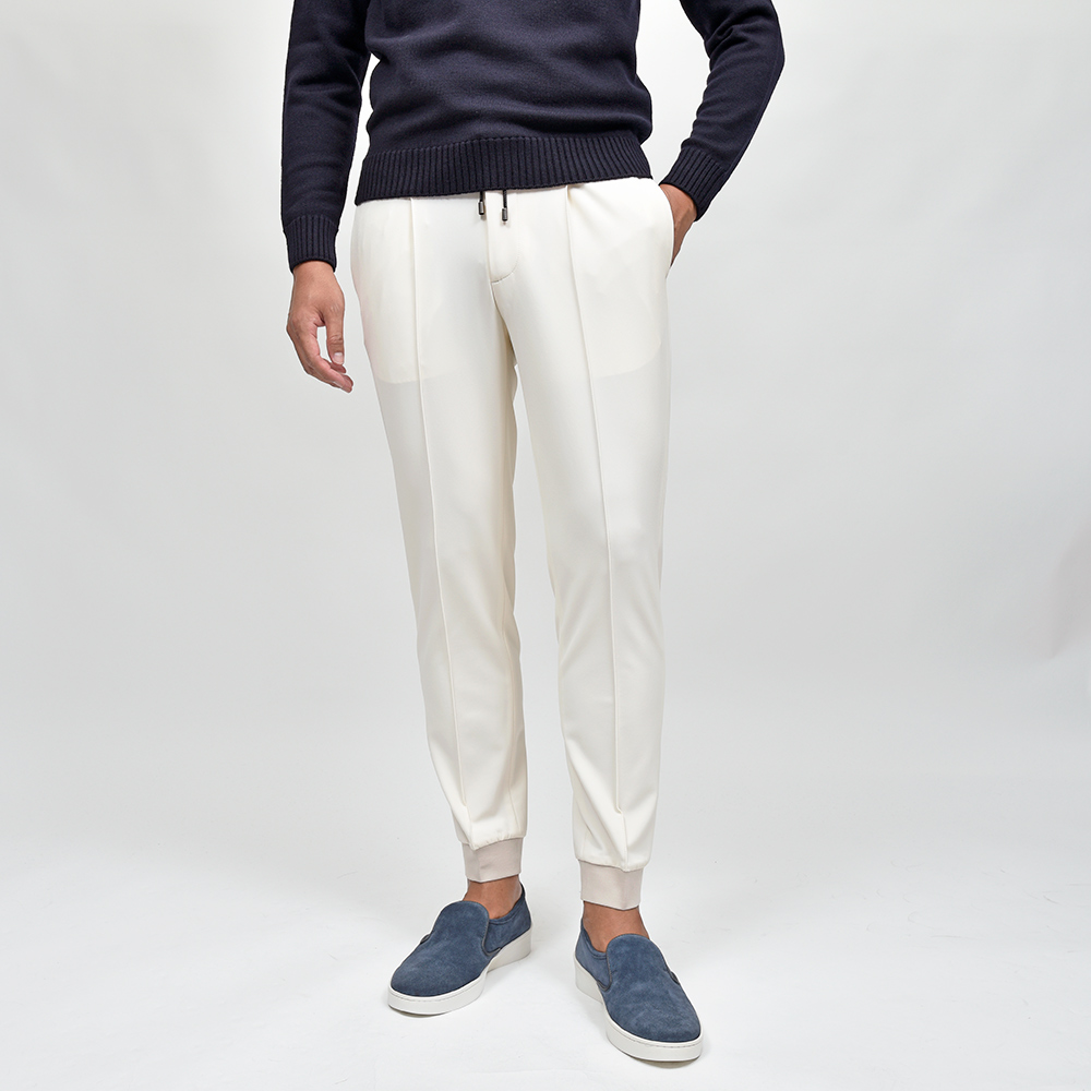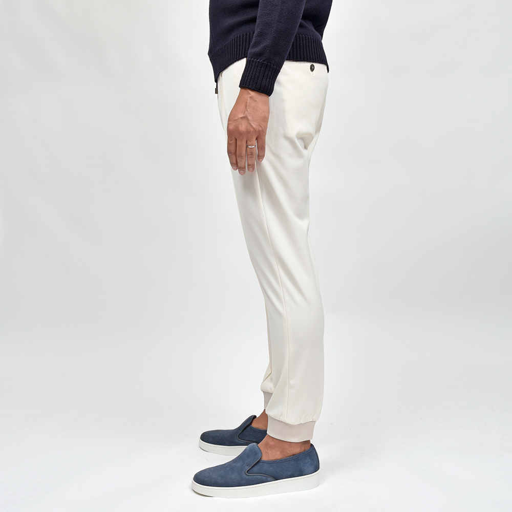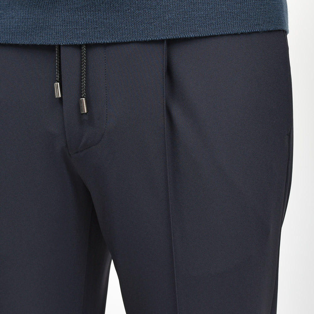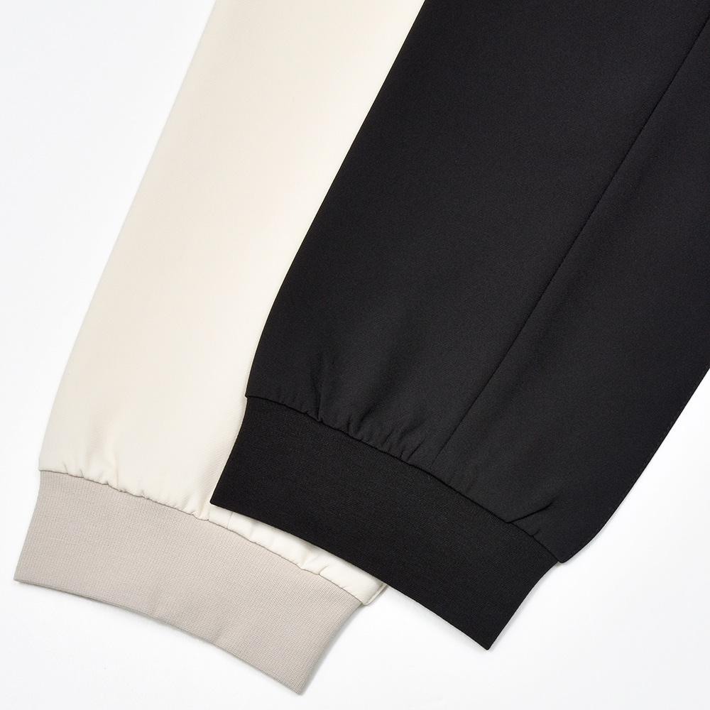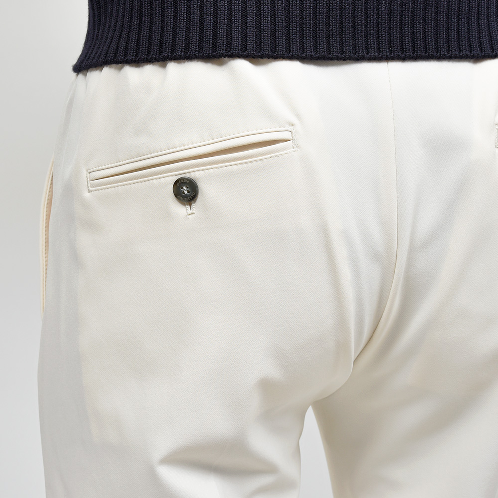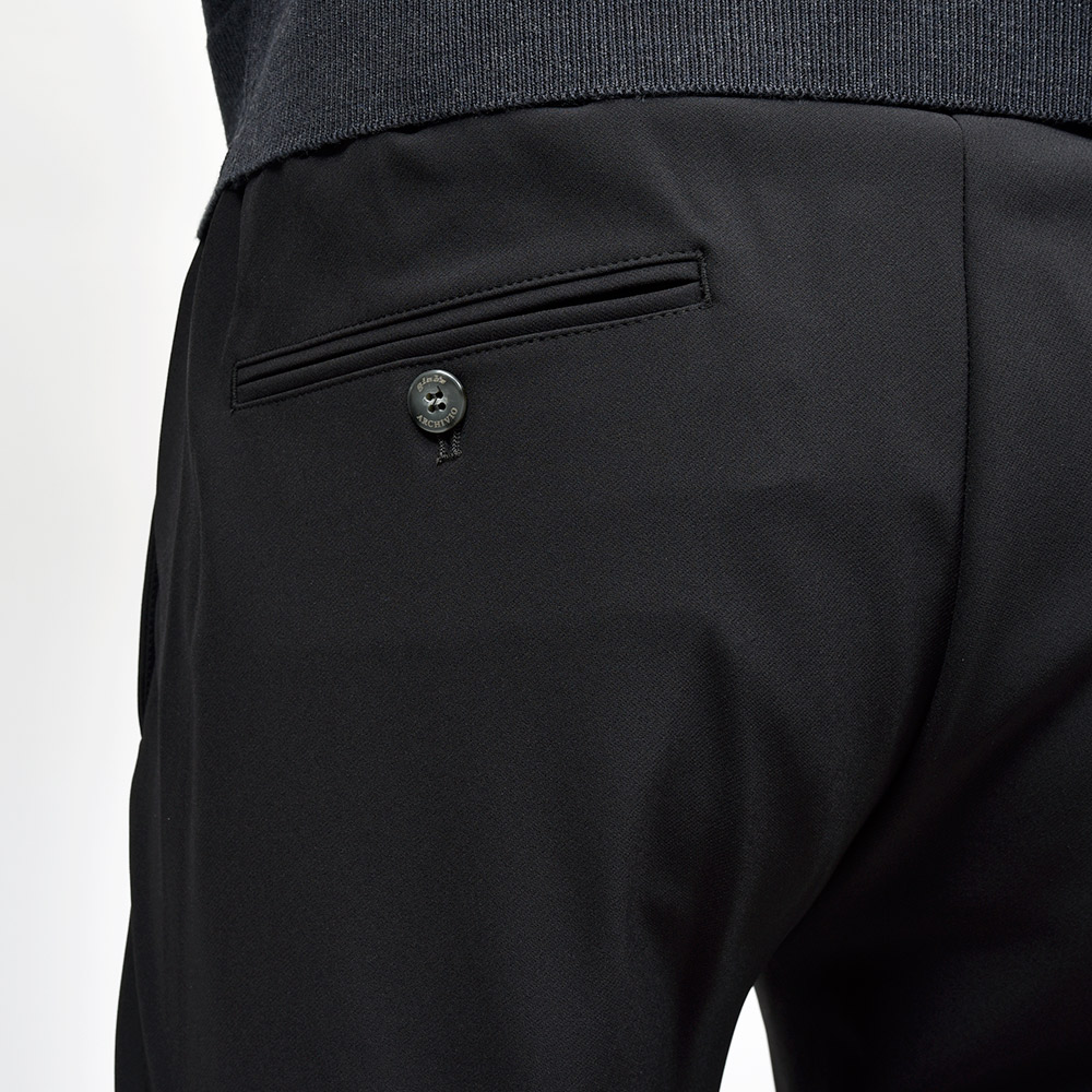 今シーズン登場したニューファブリックの“ナイロンツイルジャージー”。目付け350gの秋から春の3シーズンで着用できる薄すぎず暑すぎない程よいウエイトに、ジャージーらしいもっちりとした触感と、ナイロンらしい光沢感を併せ持った上品な佇まい。伸縮性は言わずもがなで、斜めだけではなく縦にも横にも伸びるためストレスのない穿き心地です。また、ジャージー素材でありながらもウォッシャブル仕様となっており、自宅で洗濯できるという大きなアドバンテージを持っています。