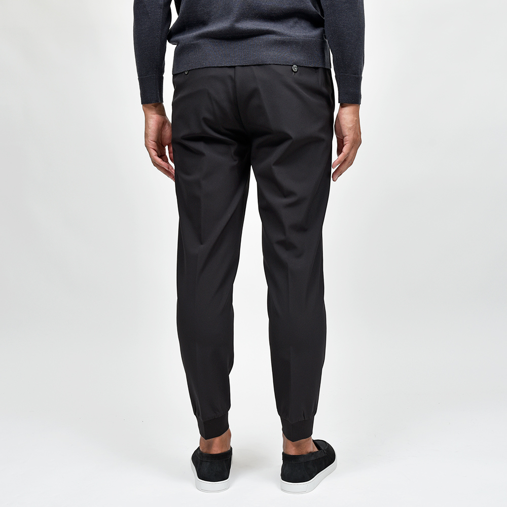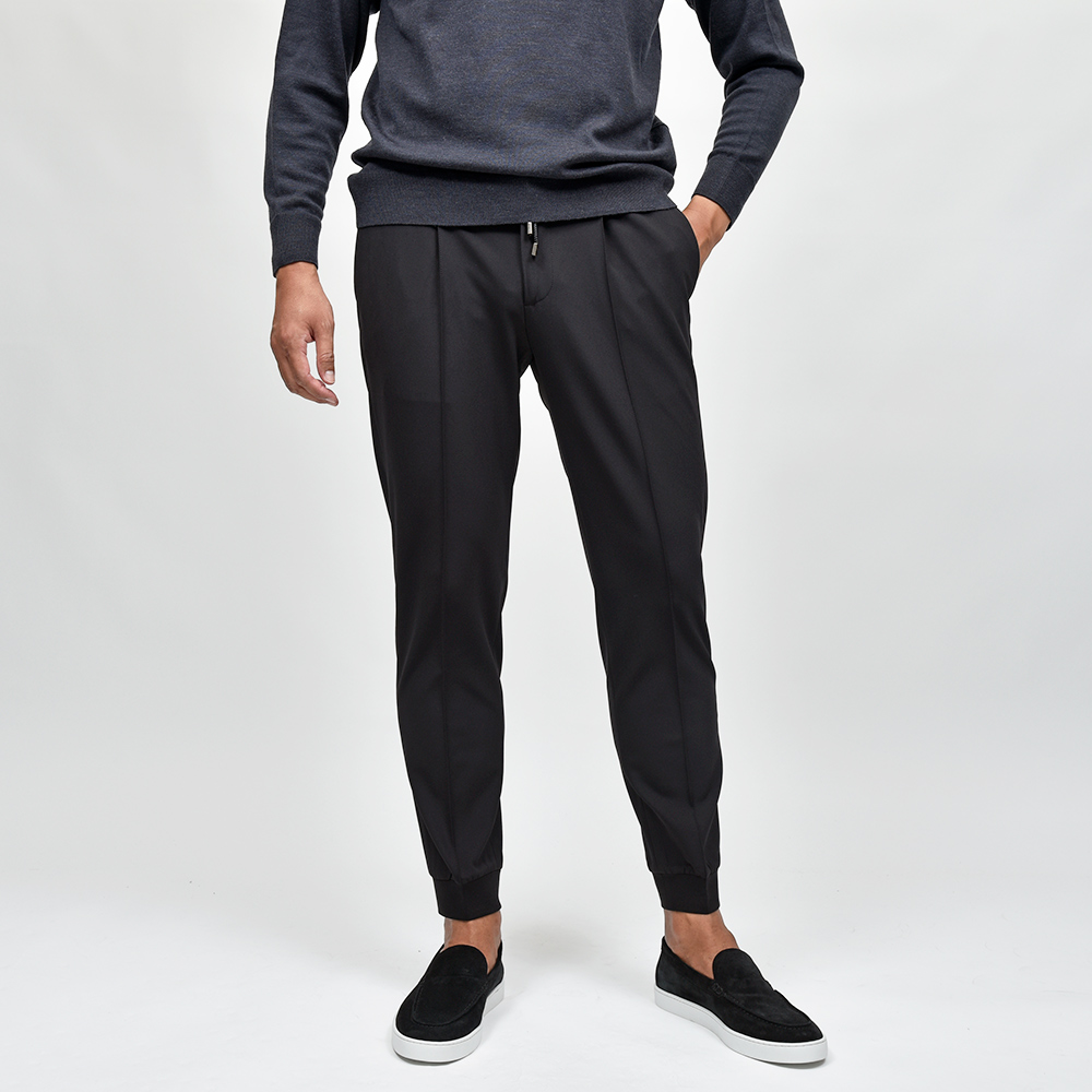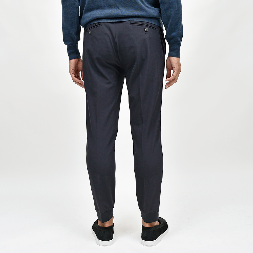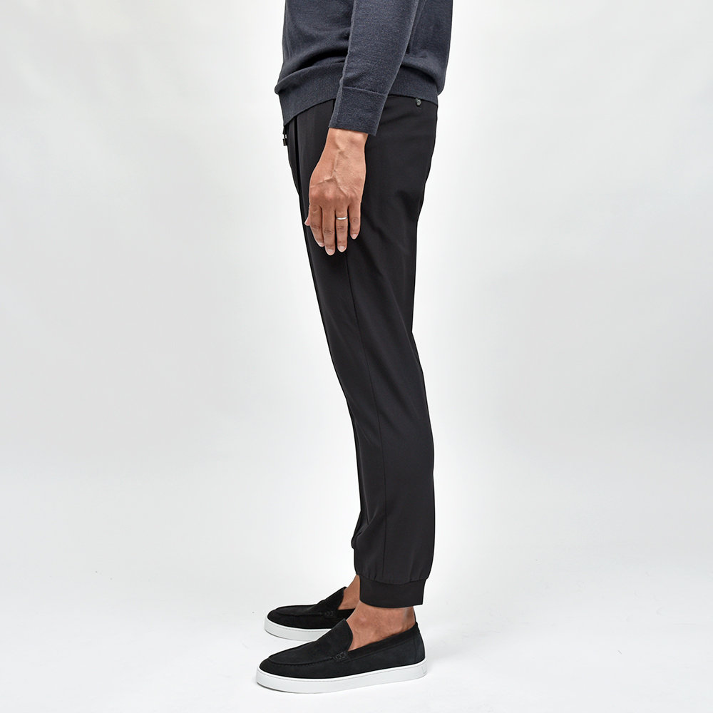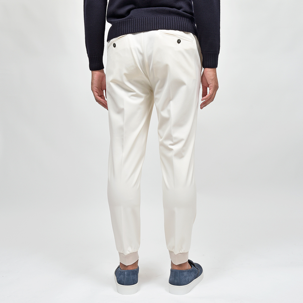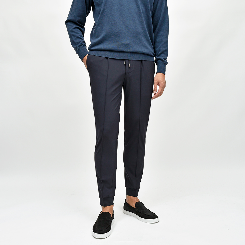 今シーズン登場したニューファブリックの“ナイロンツイルジャージー”。目付け350gの秋から春の3シーズンで着用できる薄すぎず暑すぎない程よいウエイトに、ジャージーらしいもっちりとした触感と、ナイロンらしい光沢感を併せ持った上品な佇まい。伸縮性は言わずもがなで、斜めだけではなく縦にも横にも伸びるためストレスのない穿き心地です。また、ジャージー素材でありながらもウォッシャブル仕様となっており、自宅で洗濯できるという大きなアドバンテージを持っています。