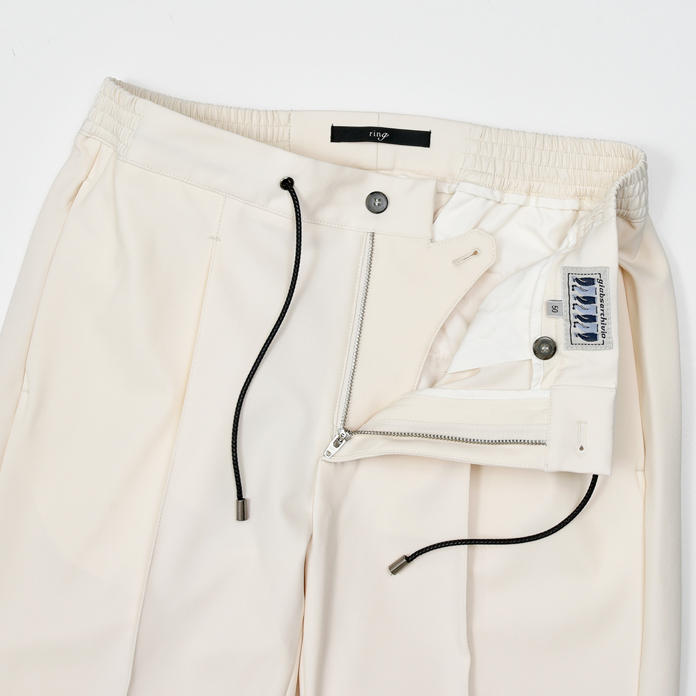 MASACCIO(マサッチョ)をベースに別注を行い、今なおヒットし続けるモンスターアイテム(当社比)、“ring(通称リングッチョ)”。こちらは別注第二弾となる、“RIB ring(リブリング)”になります。“ring(通称リングッチョ)”をベースとしたこちらは、ラグジュアリーな雰囲気が漂うイントレチャートのドローコードや、1プリーツとMASACCIOの代名詞である永久クリースはそのままに、裾をリブ仕様に仕上げました。また、マーベルト部分は“TIZIANO(ティッツィアーノ)”のベルトループなしのシャーリング仕様を採用したハイブリットな一品となっています。