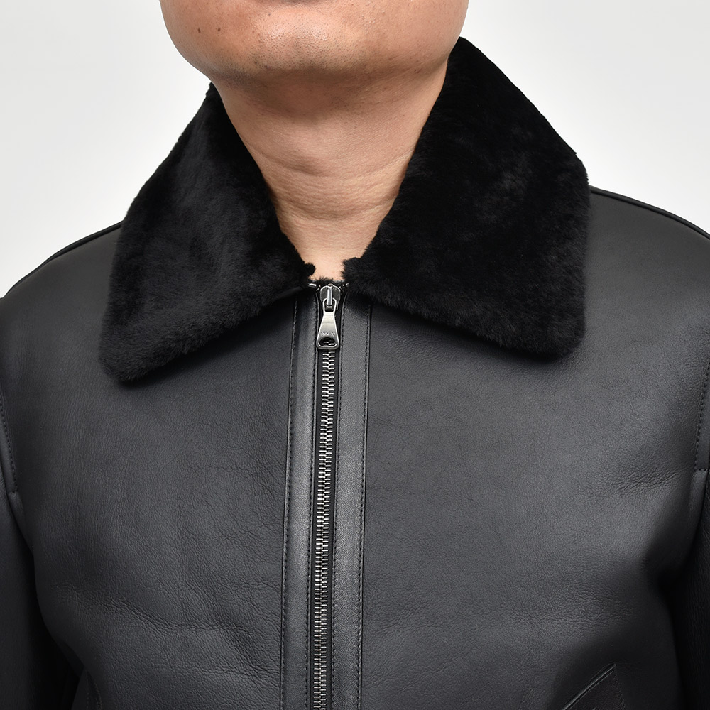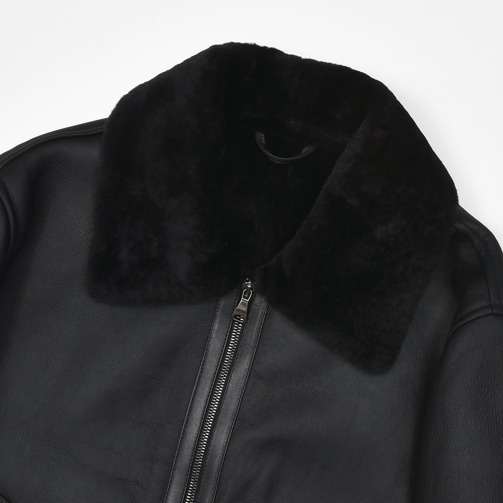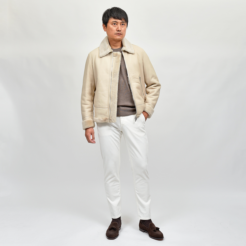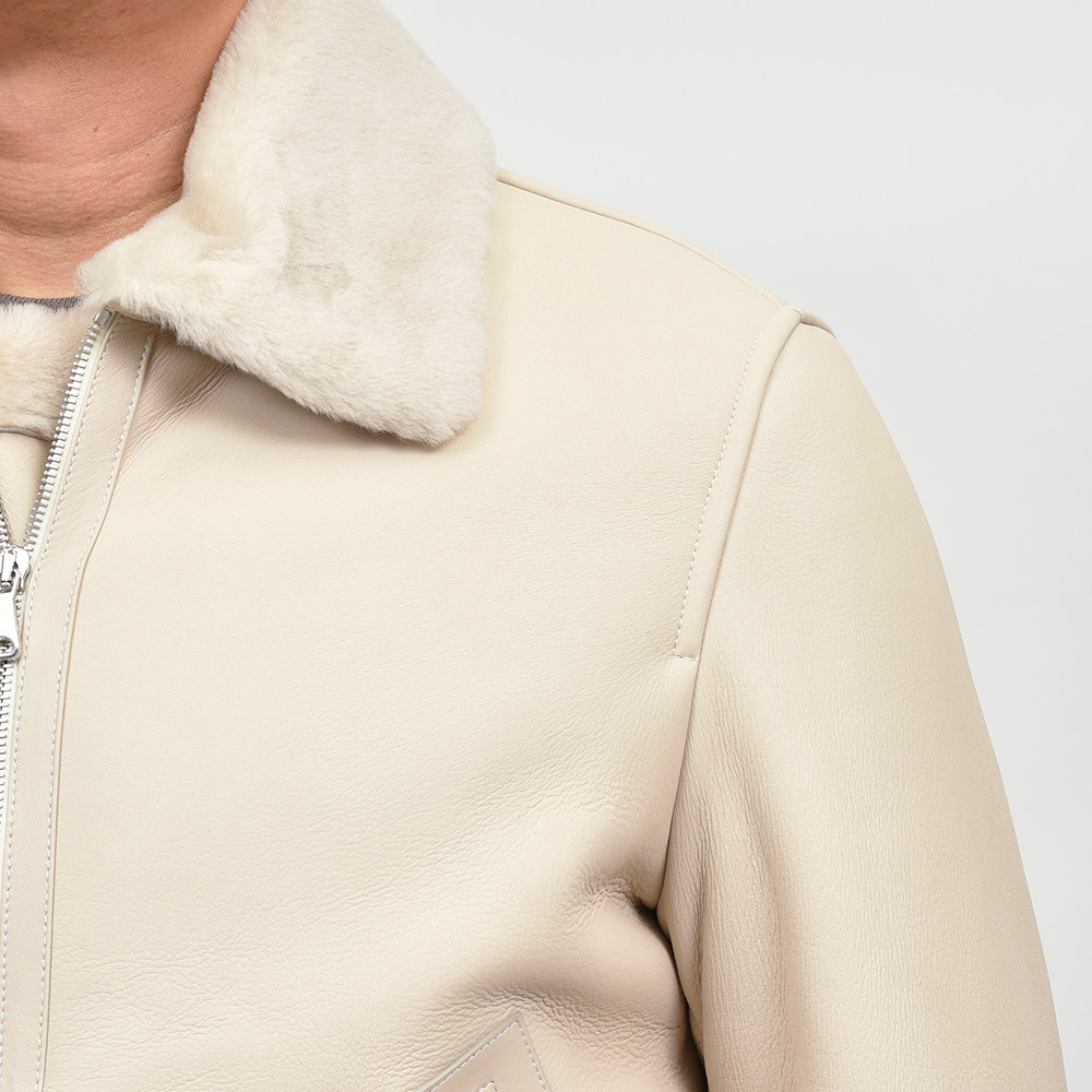 フライトジャケットの名品と呼ばれるB-3をモチーフとしたモデル"ORWELL(オーウェル)"。通常襟についているストラップを取り除き、ムートンの継ぎ部分や腰ポケット周りにナッパレザーを使用することで、統一されたカラーリングですが、程よいアクセントが生まれ味わい深い一着。また、袖口は折り返しているため袖丈をある程度調整できる仕様となっています。アイボリーのジップはシルバーカラー、ブラックのジップはガンメタリックカラーです。