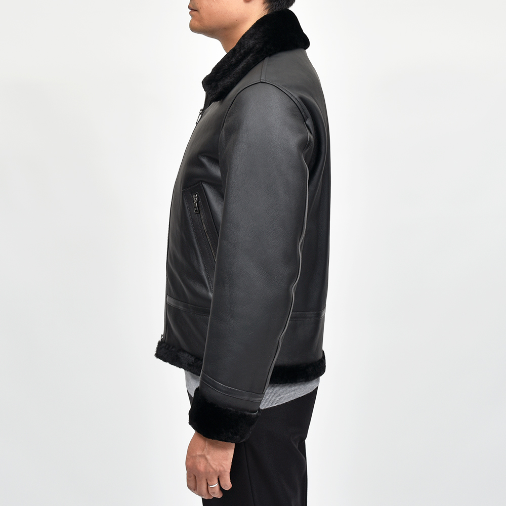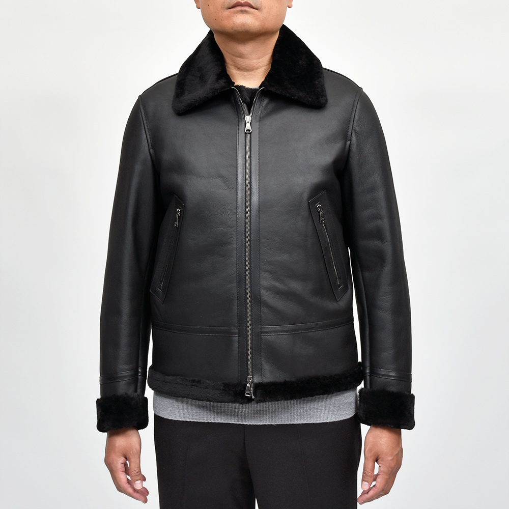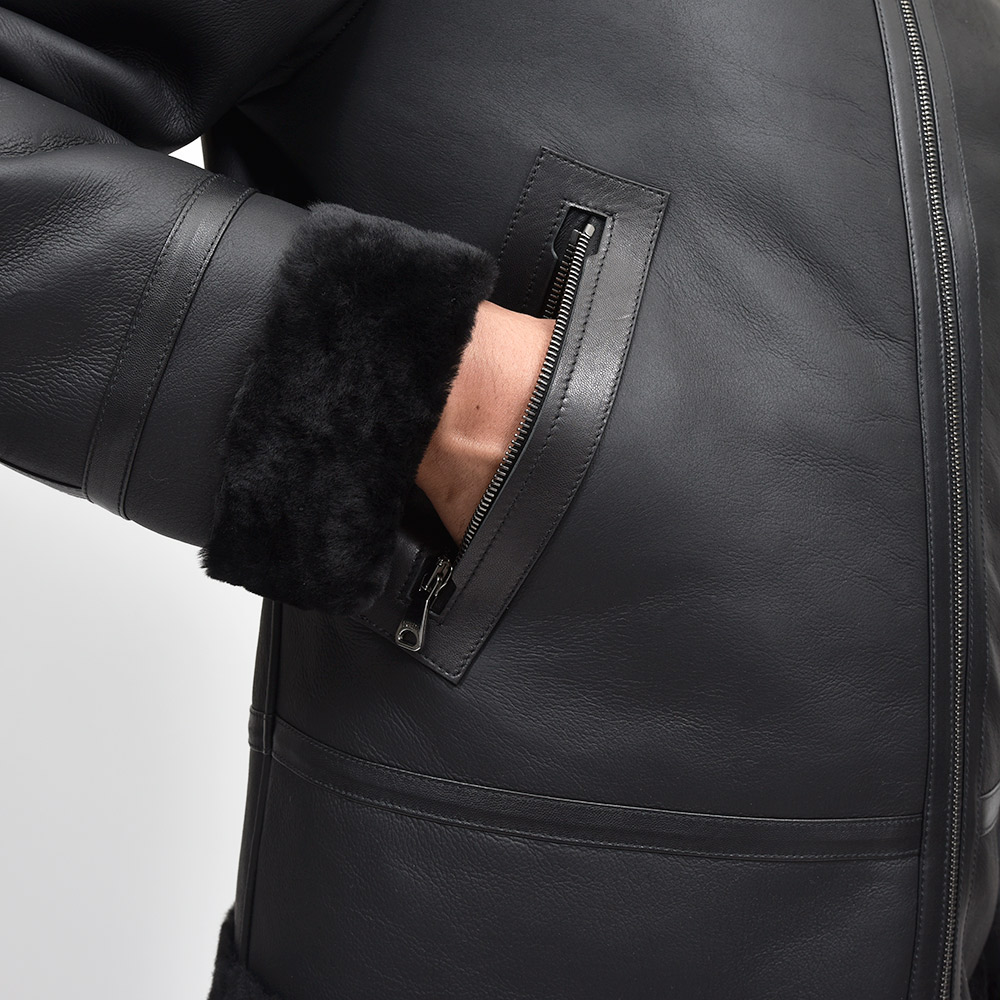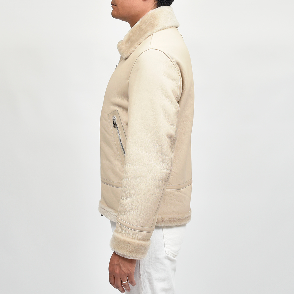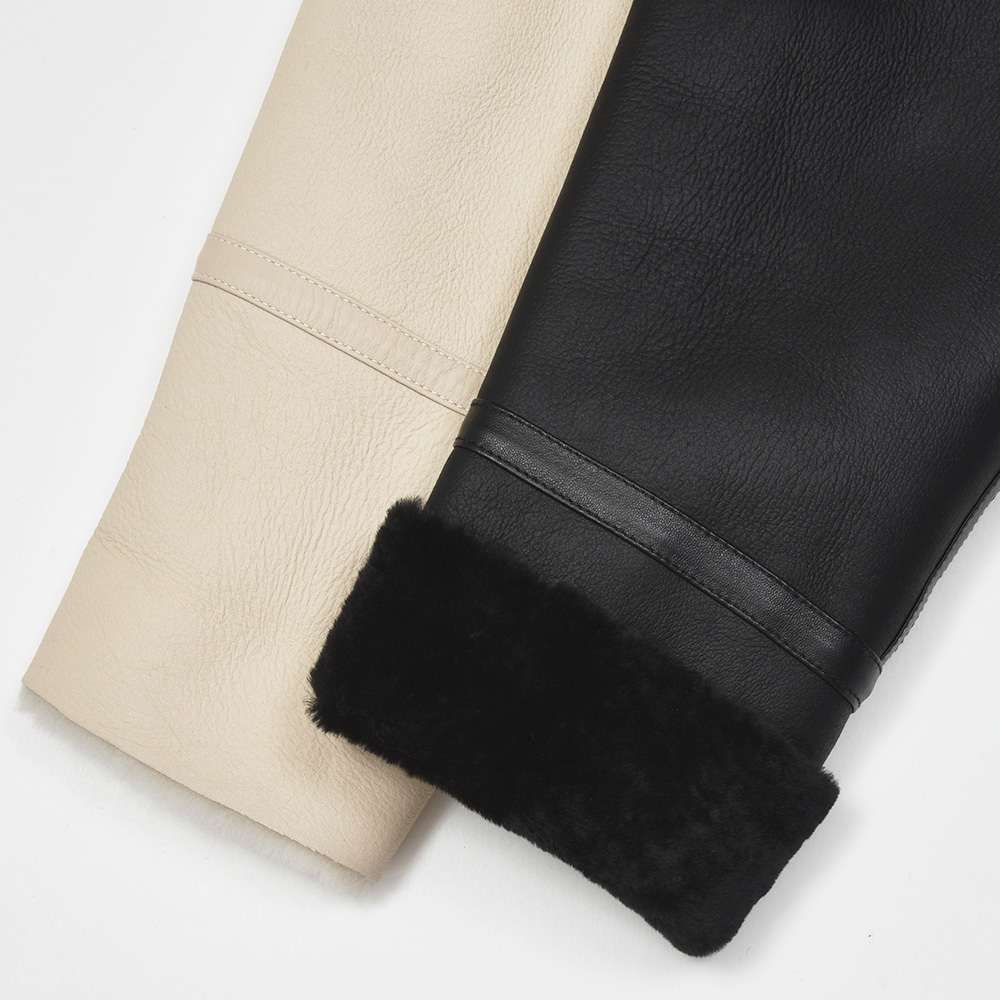 フライトジャケットの名品と呼ばれるB-3をモチーフとしたモデル"ORWELL(オーウェル)"。通常襟についているストラップを取り除き、ムートンの継ぎ部分や腰ポケット周りにナッパレザーを使用することで、統一されたカラーリングですが、程よいアクセントが生まれ味わい深い一着。また、袖口は折り返しているため袖丈をある程度調整できる仕様となっています。アイボリーのジップはシルバーカラー、ブラックのジップはガンメタリックカラーです。