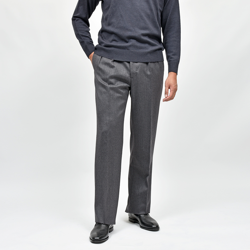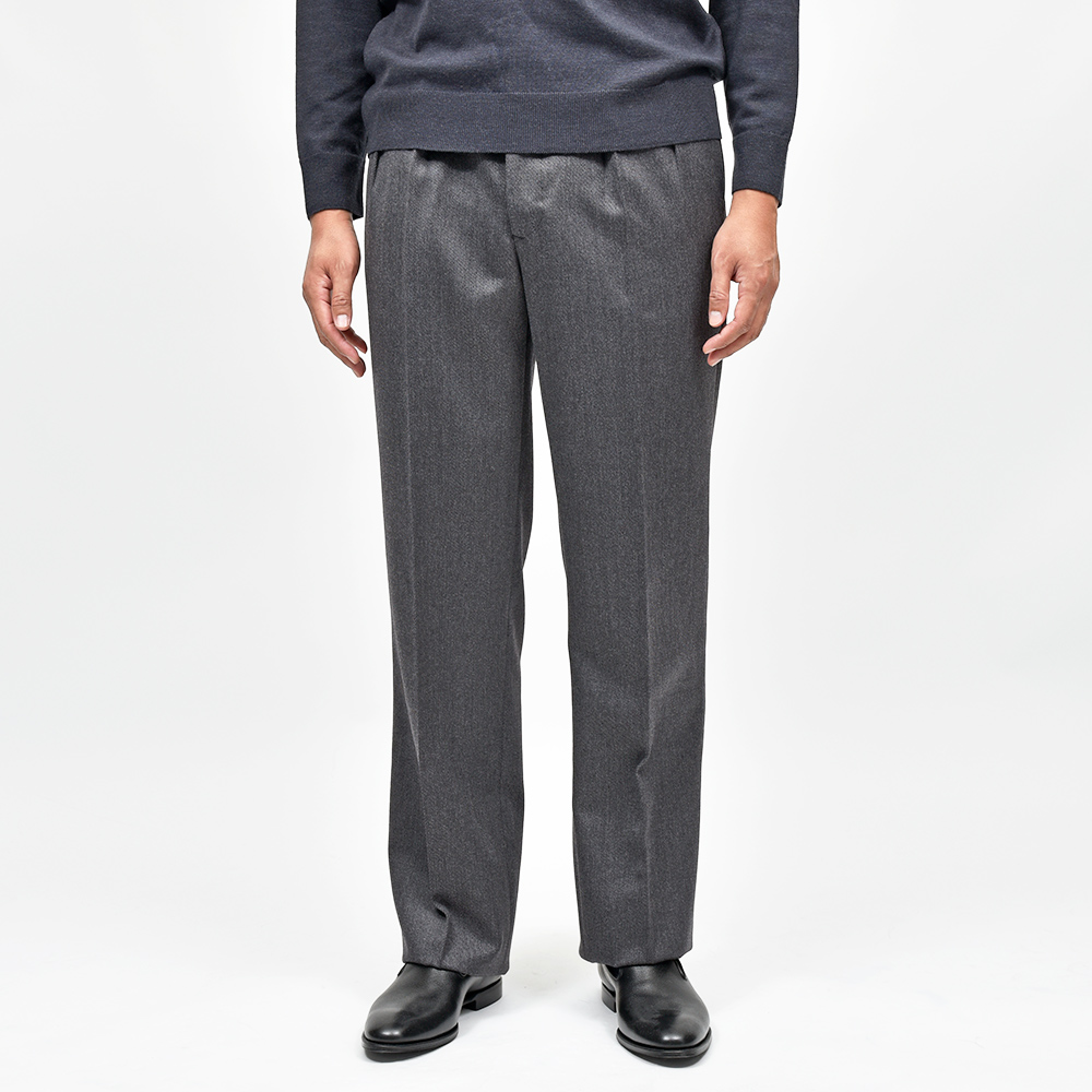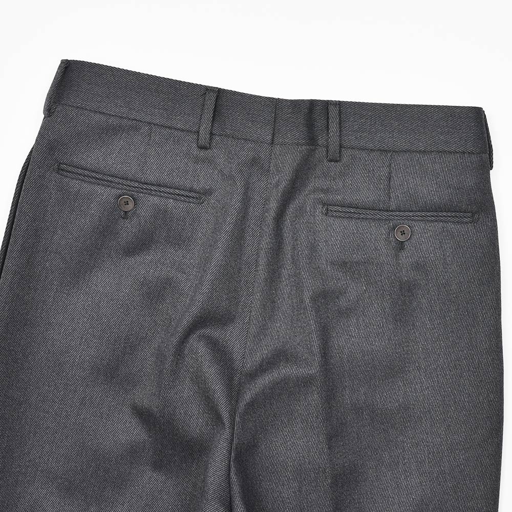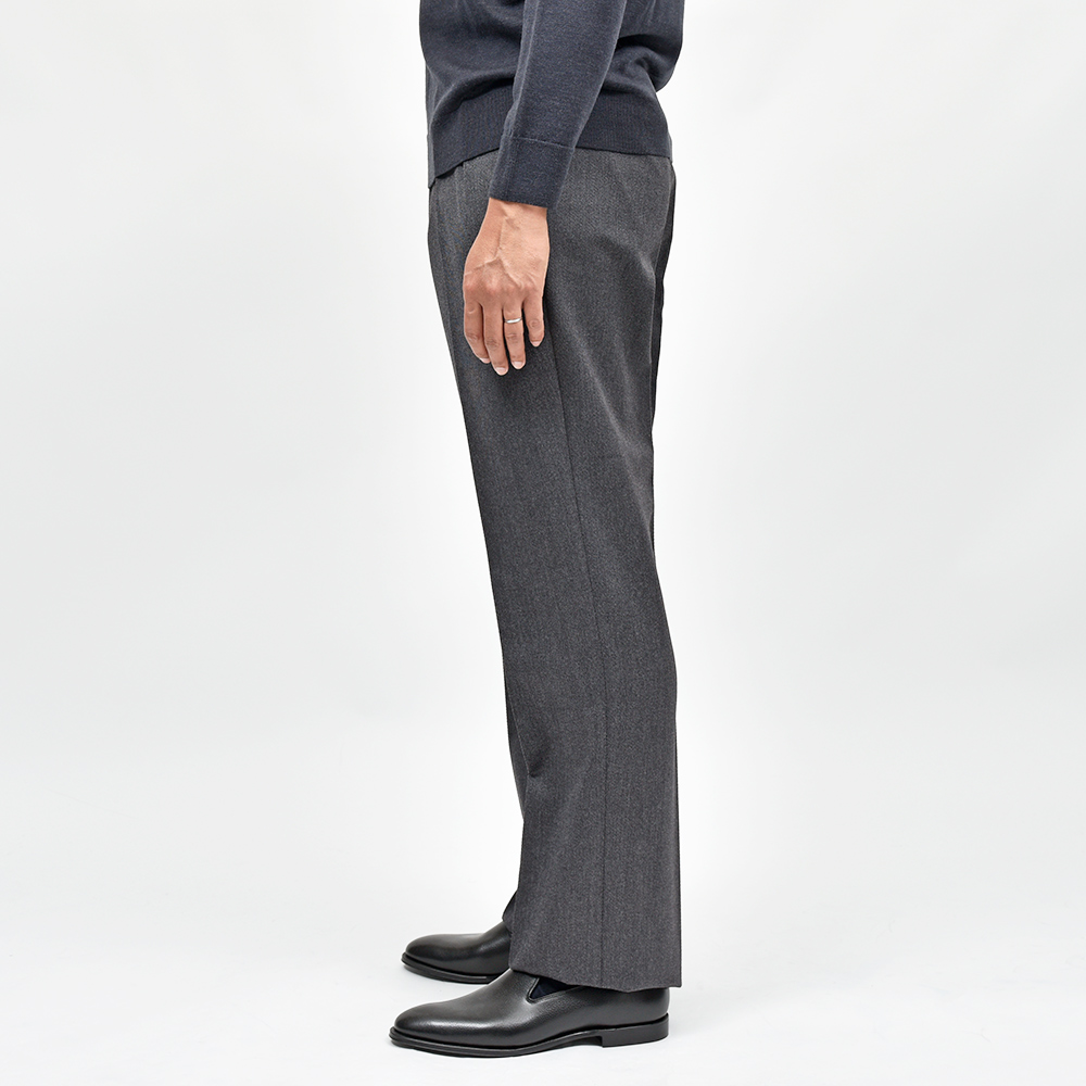目付け400gのカバートクロスを使用したウールパンツ。キャバリーツイルに比べて軽くライトな生地感は、日常使いでリアリティのあるウエイトになります。英国的な佇まいに上品な艶感が確かな存在感。また、起毛感も程よいため春先まで着用することができます。