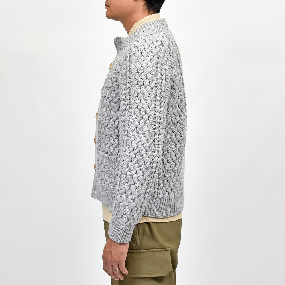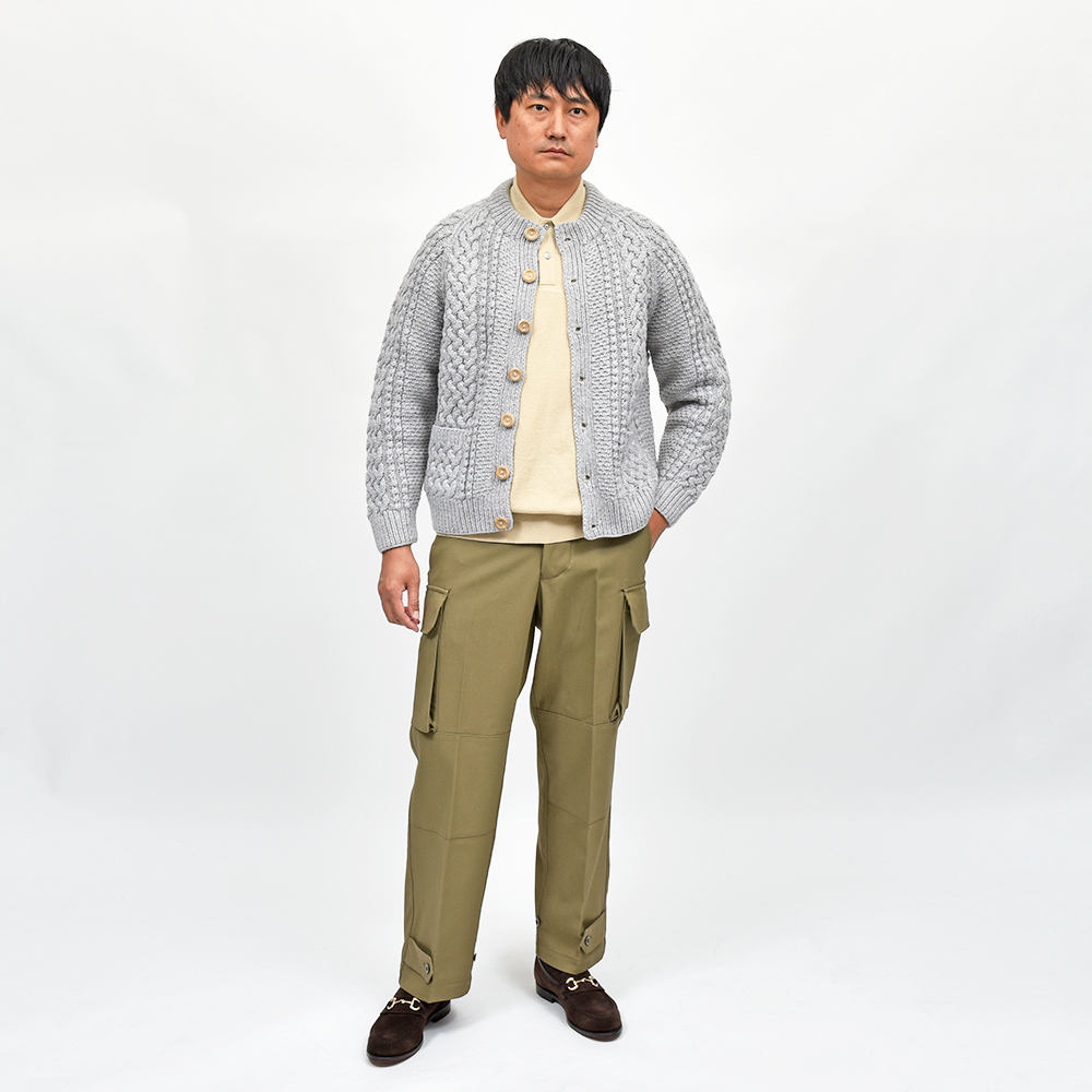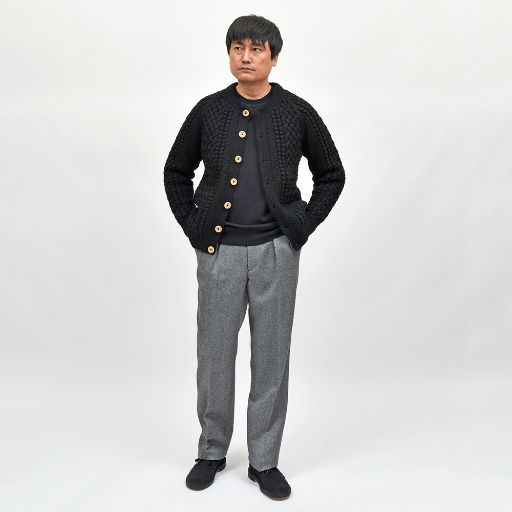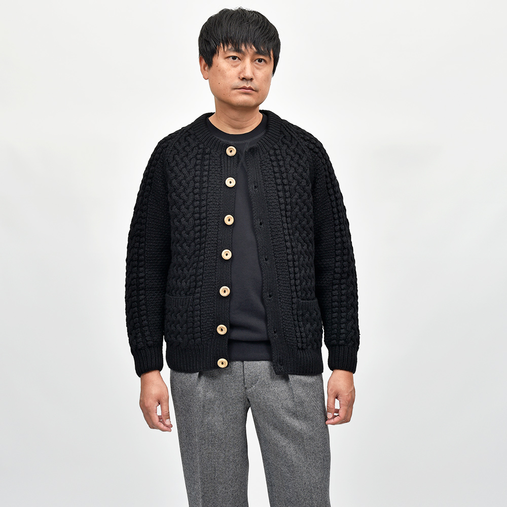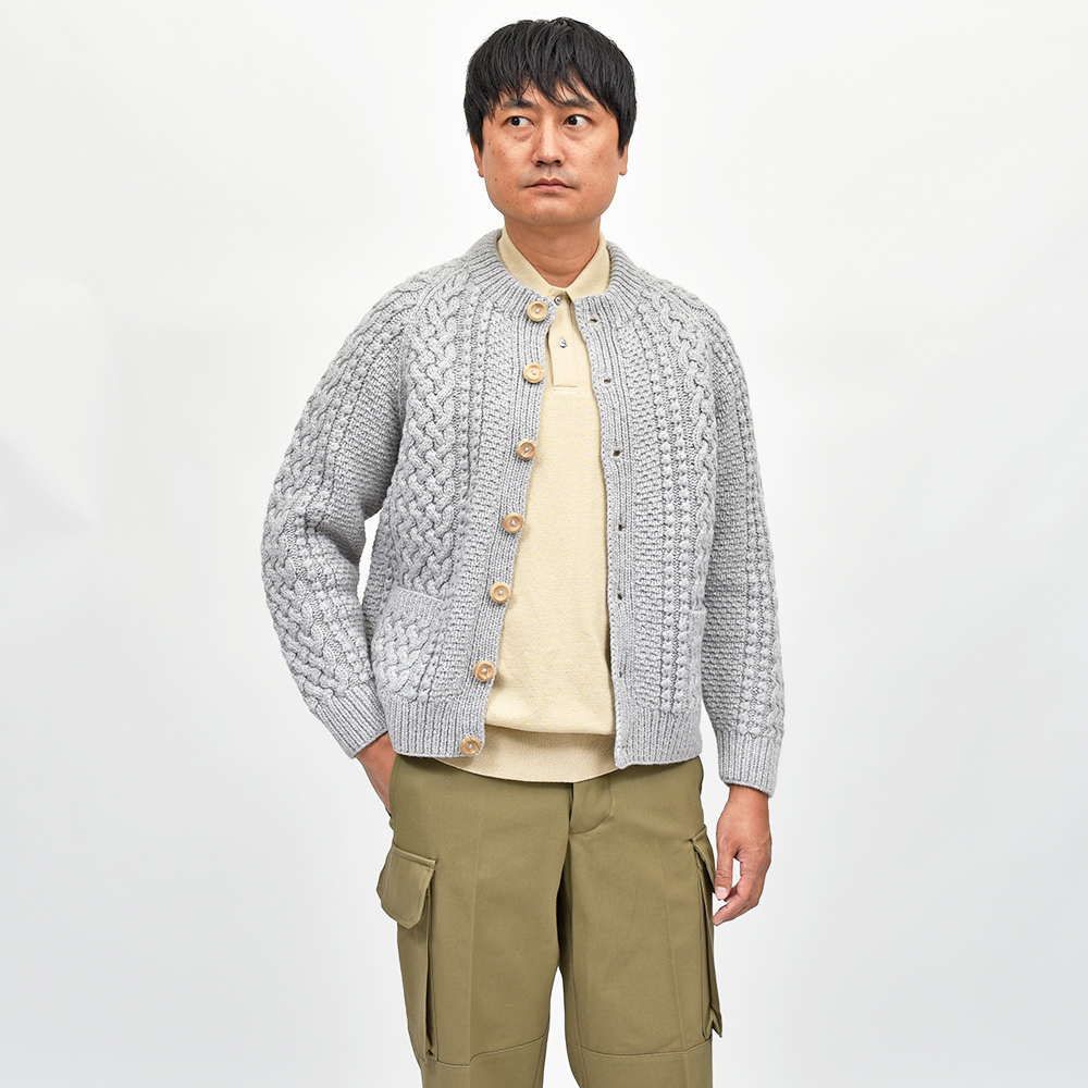 モデルはINVERALLANを代表する定番モデル“4A GOLFER CARDIGAN”。厚手のニットですがラグランスリーブによって着た時に肩周りが馴染みやすく、ノーカラーの首周りは幅広いインナーと重ね着しやすく非常に重宝します。温もりのある木製ボタンがケーブル編みと合わさり、INVERALLANらしい雰囲気をより感じていただけます。