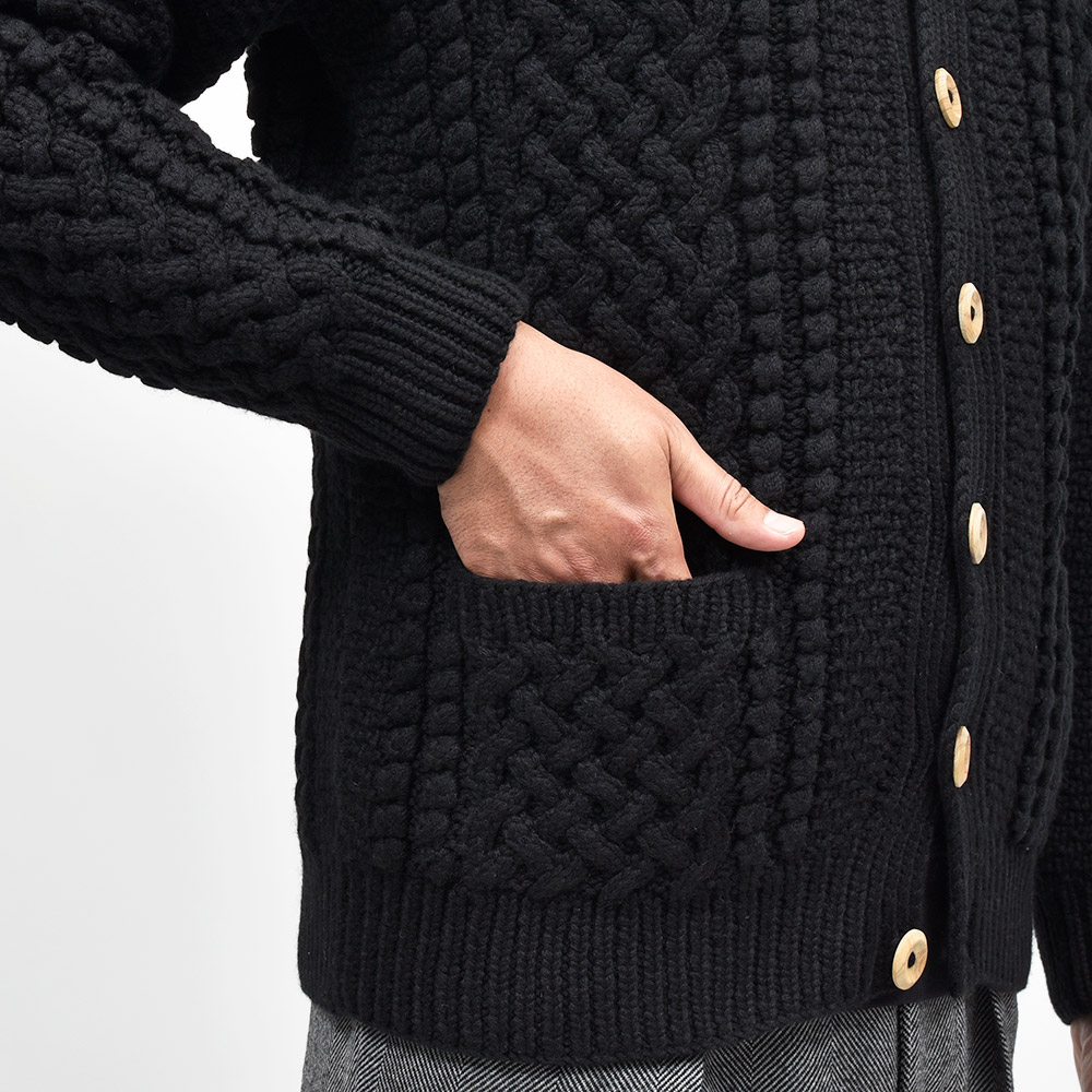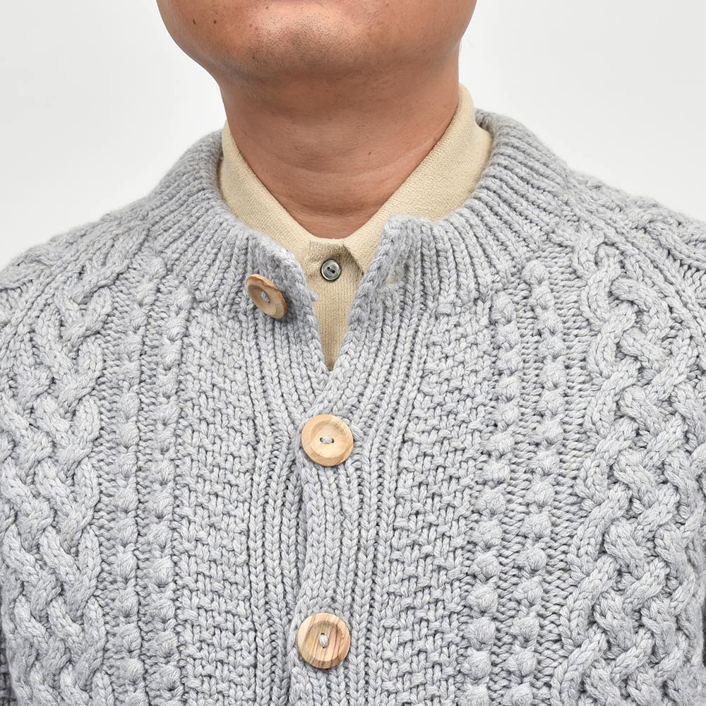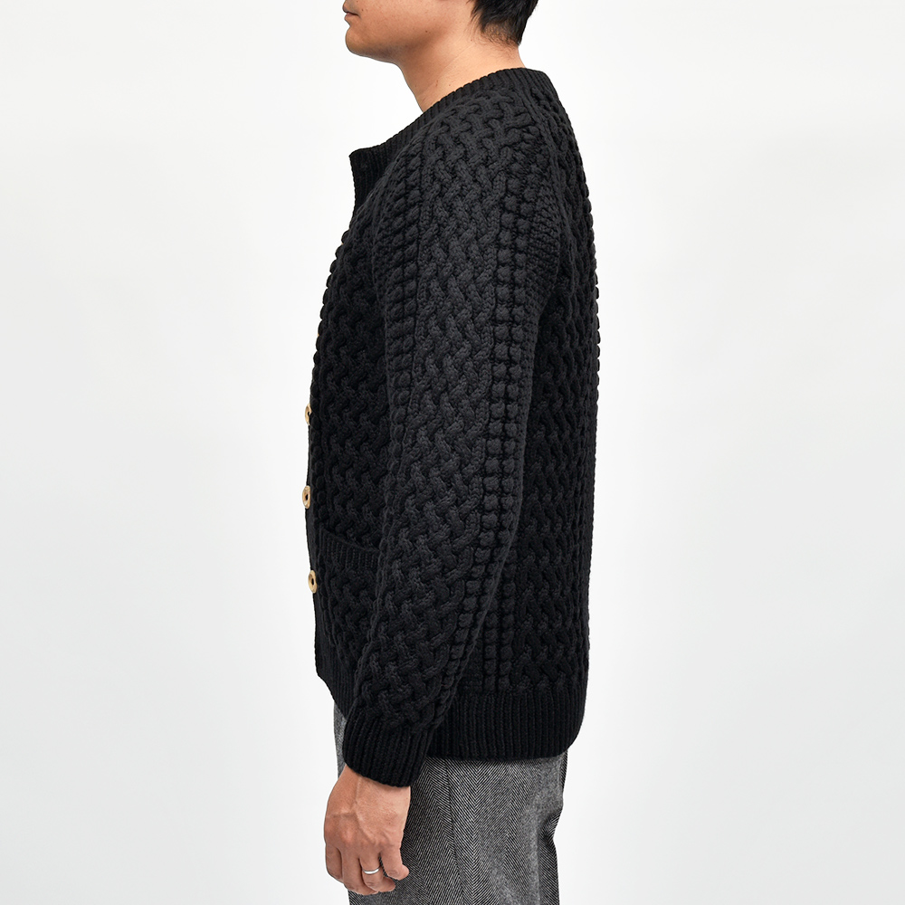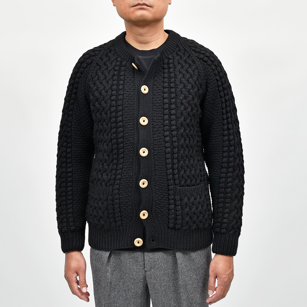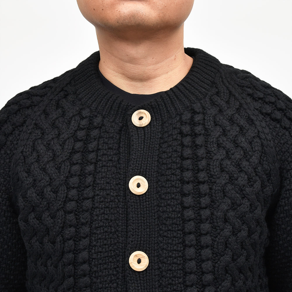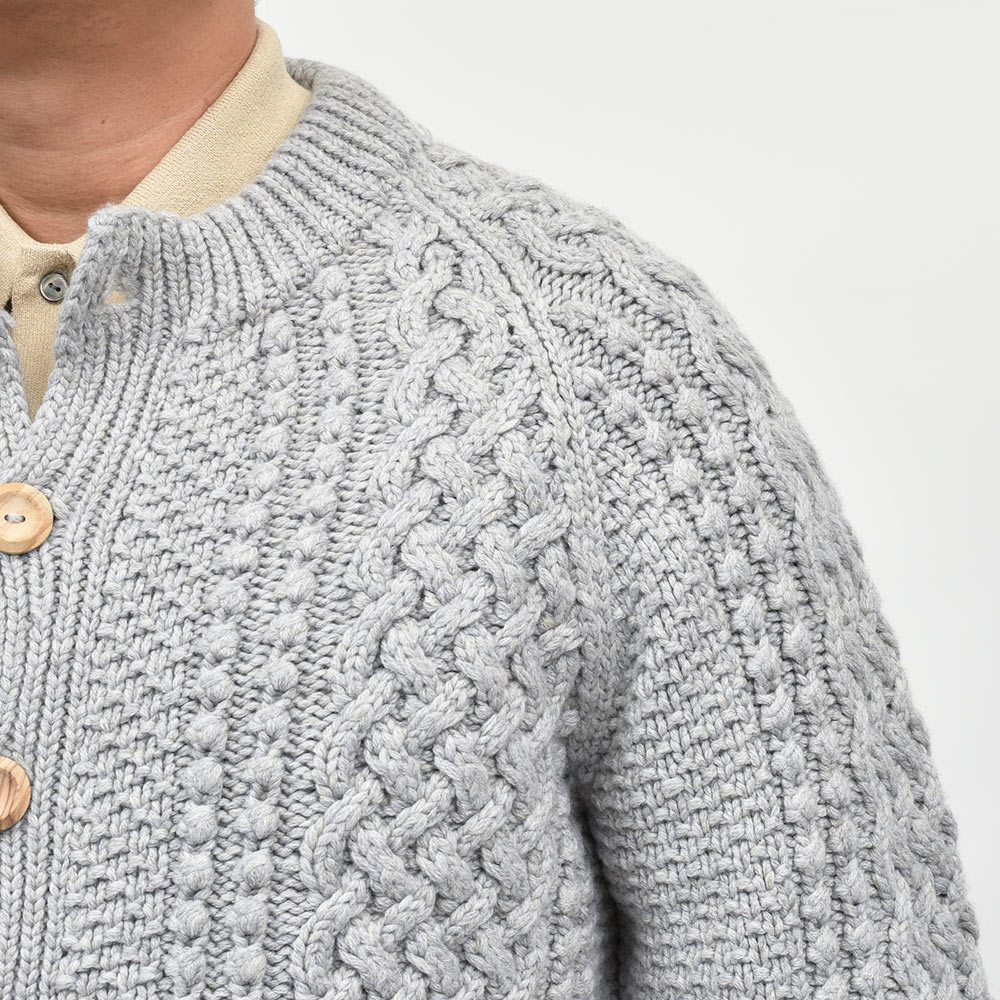 モデルはINVERALLANを代表する定番モデル“4A GOLFER CARDIGAN”。厚手のニットですがラグランスリーブによって着た時に肩周りが馴染みやすく、ノーカラーの首周りは幅広いインナーと重ね着しやすく非常に重宝します。温もりのある木製ボタンがケーブル編みと合わさり、INVERALLANらしい雰囲気をより感じていただけます。