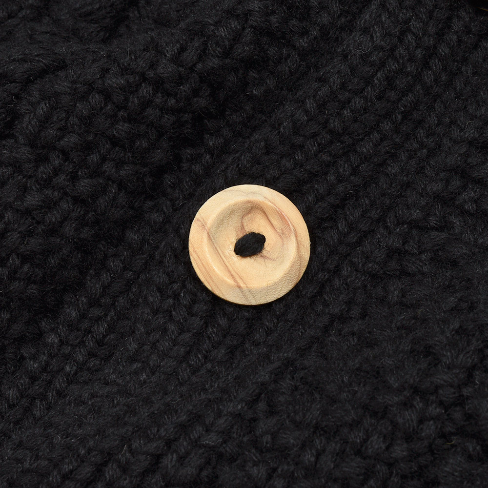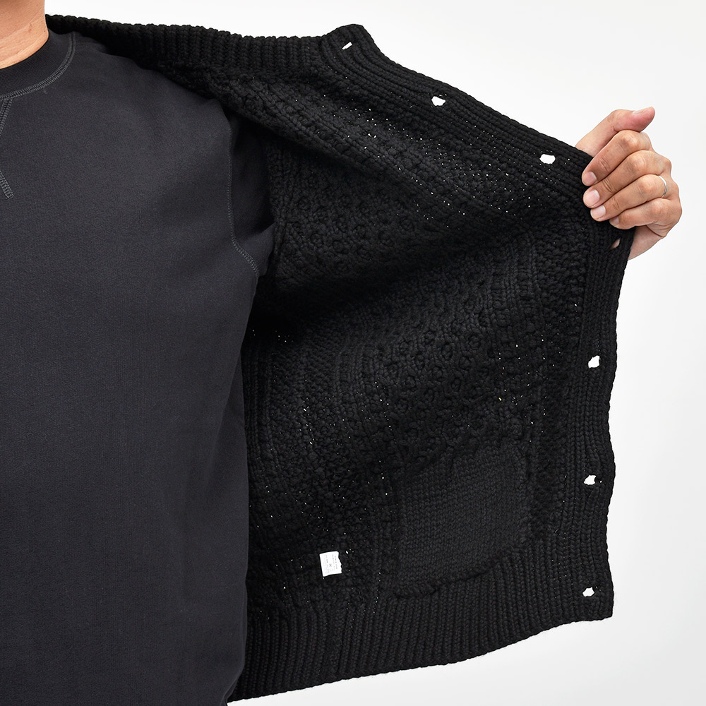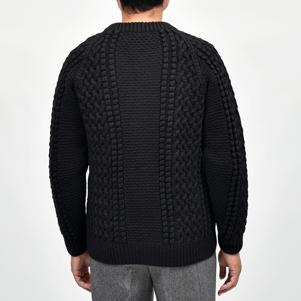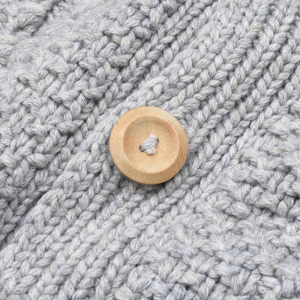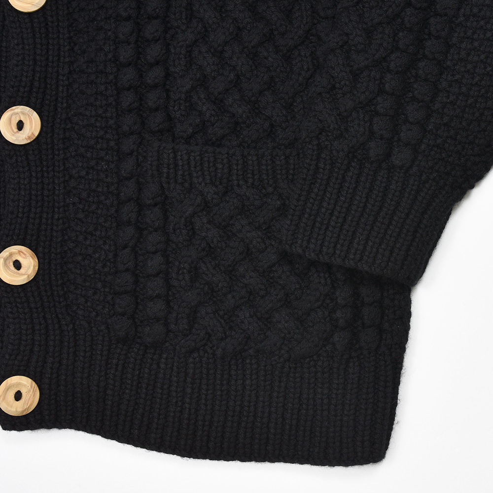 モデルはINVERALLANを代表する定番モデル“4A GOLFER CARDIGAN”。厚手のニットですがラグランスリーブによって着た時に肩周りが馴染みやすく、ノーカラーの首周りは幅広いインナーと重ね着しやすく非常に重宝します。温もりのある木製ボタンがケーブル編みと合わさり、INVERALLANらしい雰囲気をより感じていただけます。