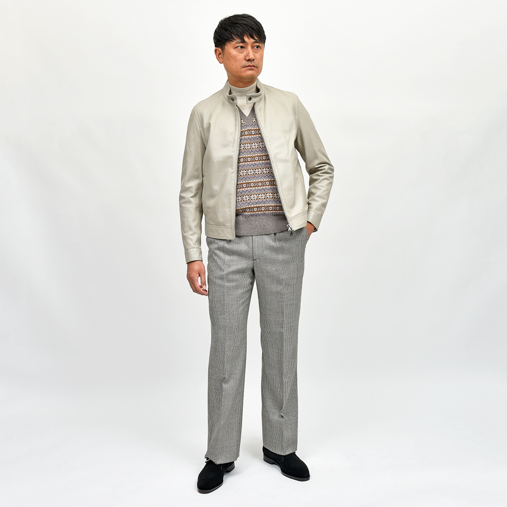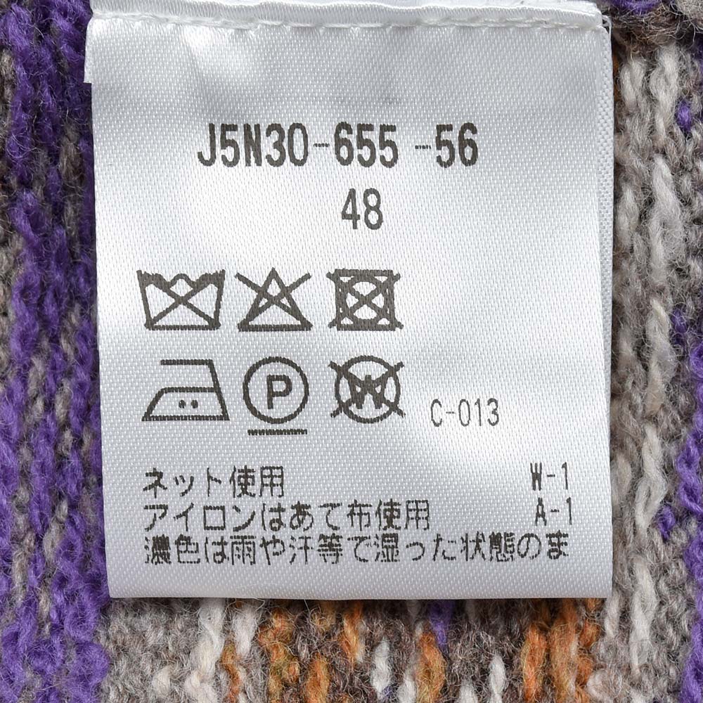 サイズ48でジャストサイズです。スッキリとしたシルエットで適度にボディにゆとりがあって綺麗に着用できます。モノトーンがモダンなフェアアイル柄のベストです!