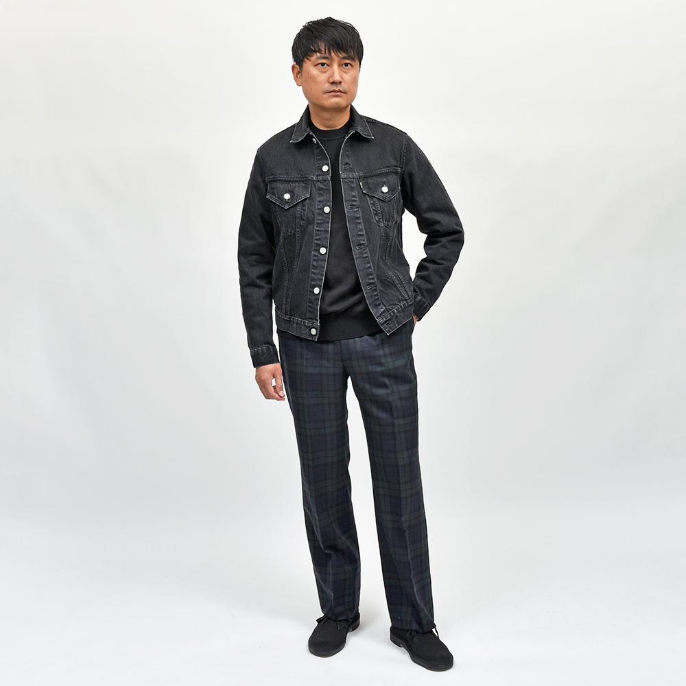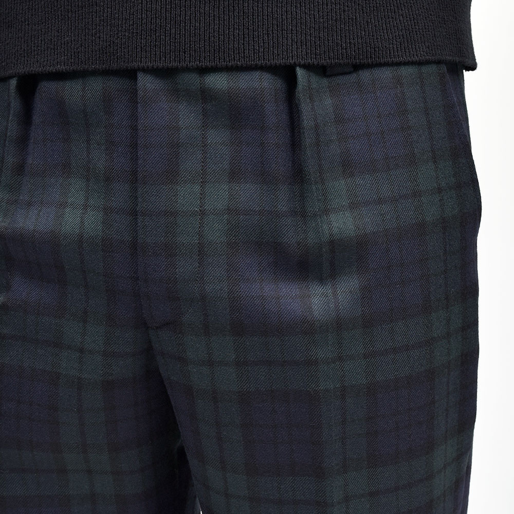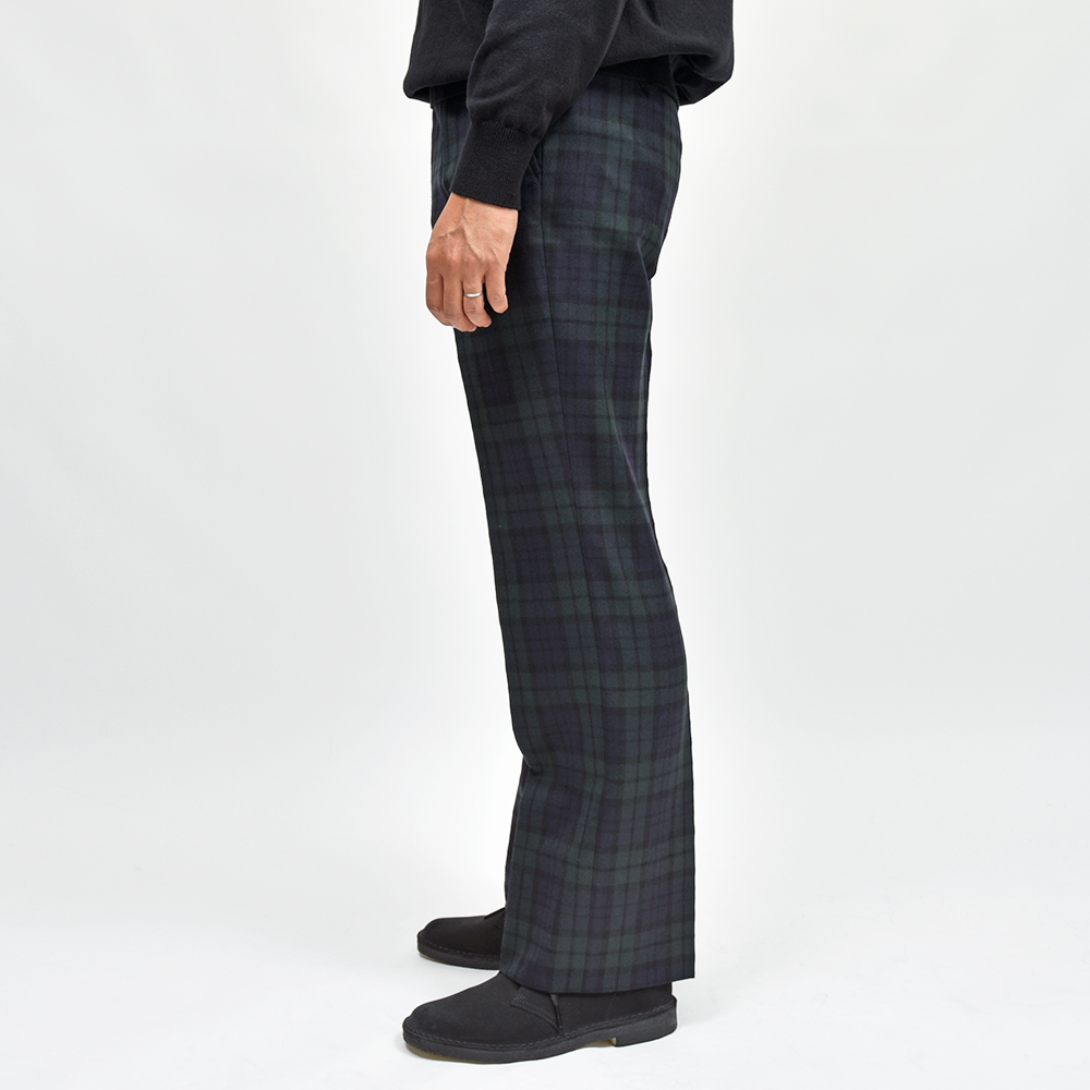 サイズは48がジャストサイズです。股上が深くヒップや腰回りにゆとりがあり、裾に向かって緩やかにテーパードしているワイドシルエットパンツです。スタイリングのポイントになりそうなブラックウォッチがキャッチーな1着!