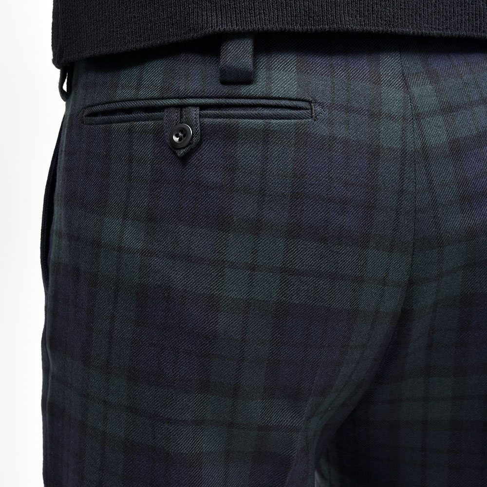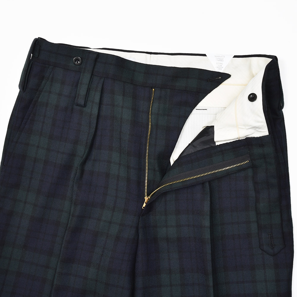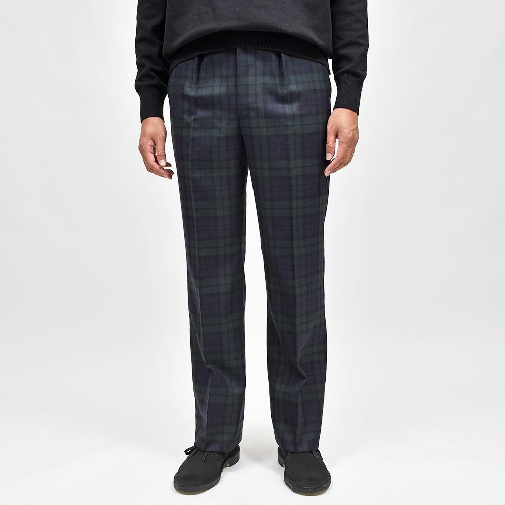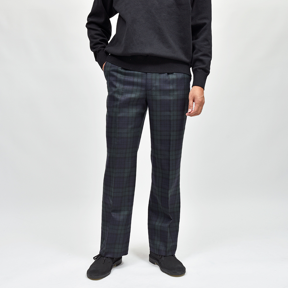 チェック柄の定番であるブラックウォッチを採用したこちらは、厚過ぎず薄過ぎない秋冬ではやや軽い目付けになります。柔らかで滑らかな生地感による上品な光沢感に、仄かな起毛感ですので春先まで着用することができます。