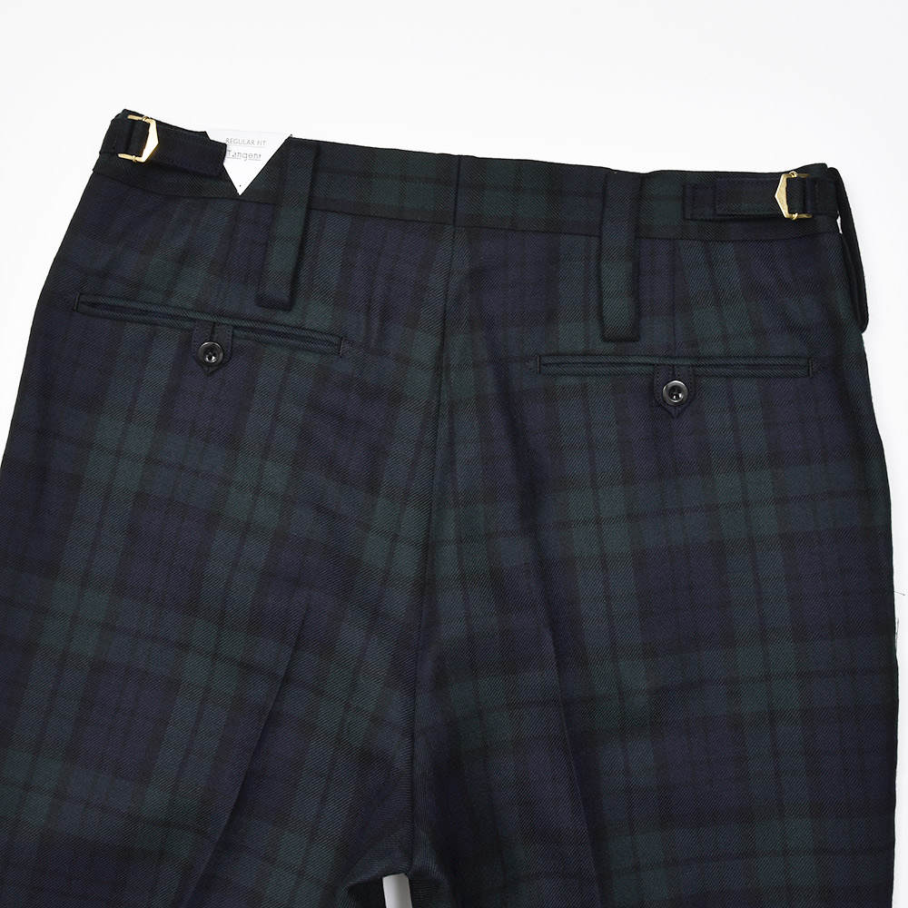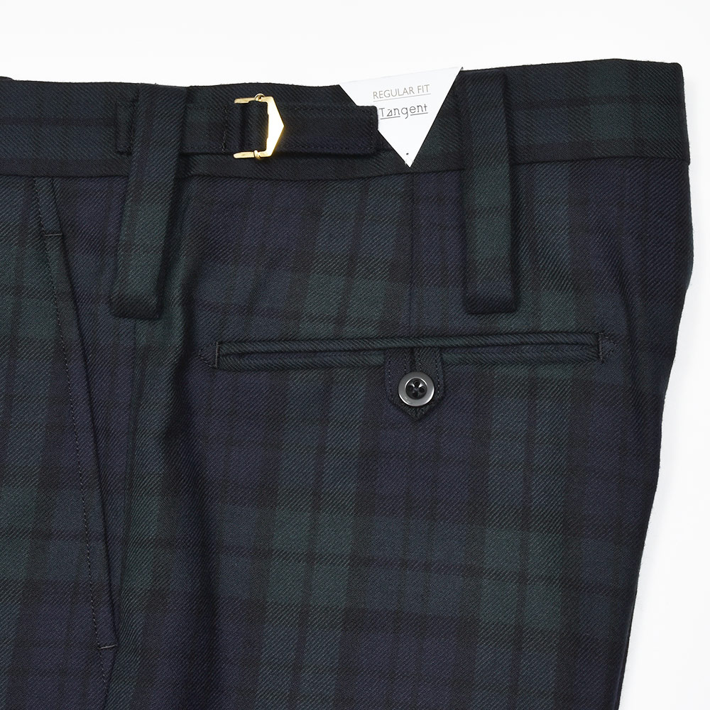 1プリーツのレギュラーシルエットが特徴のストレートパンツ“Patt(パット)”。イギリス陸軍のオフィサーパンツをベースに、渡り・膝幅・裾幅のバランスにこだわった、Tangentらしいバギーパンツのようなストレートシルエットの新しいドレスパンツです。ベルトループは太めのダブルループでサイドアジャスターでのサイズ調整も可能。裾幅は他のワイドモデルと近しく広めですが、ワタリと膝幅をしっかりと削ることで、太すぎないすっきりとしたストレートパンツとなっています。