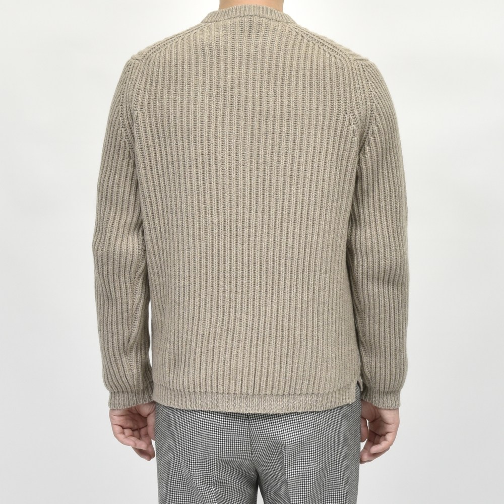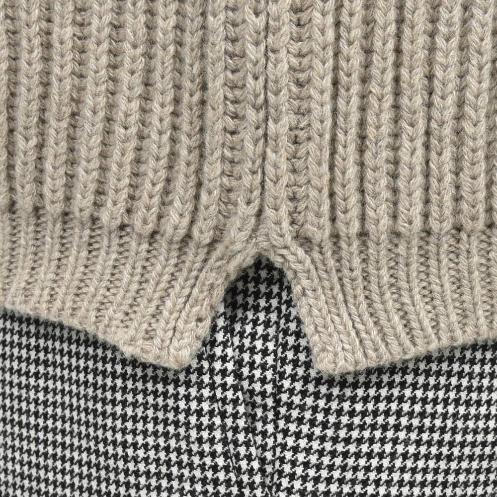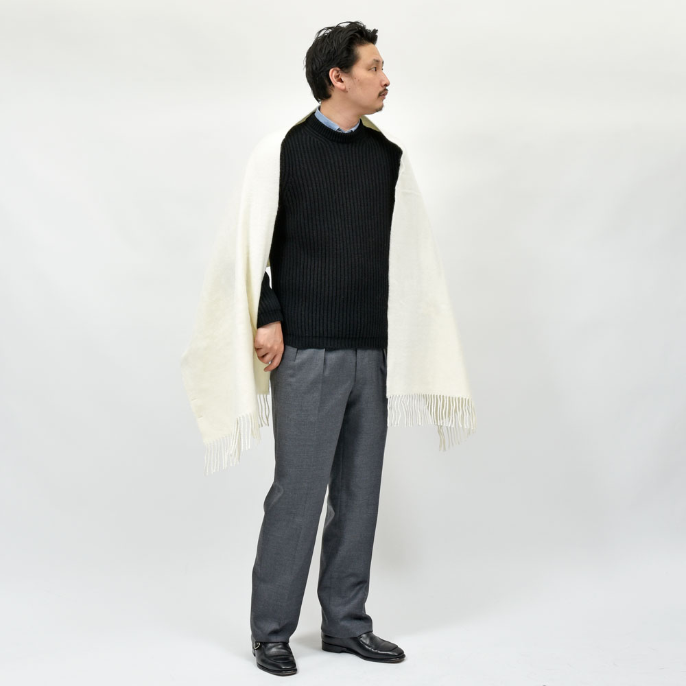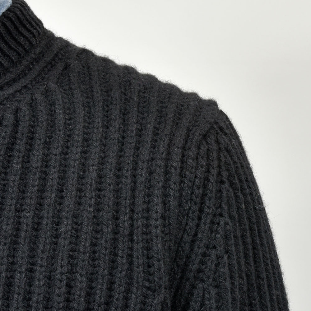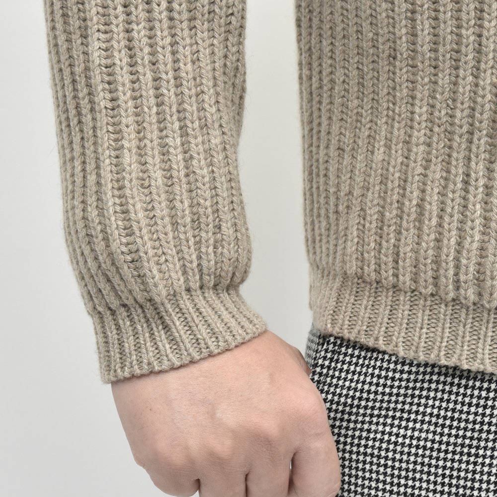 また、ネックのリブはシングルにするとカシミヤの重厚感が安っぽくなる為と、首のたるみが出ないようする為ダブルに設定。そうすることで野暮ったく見えないようにコントロールしています。