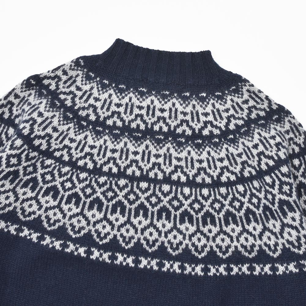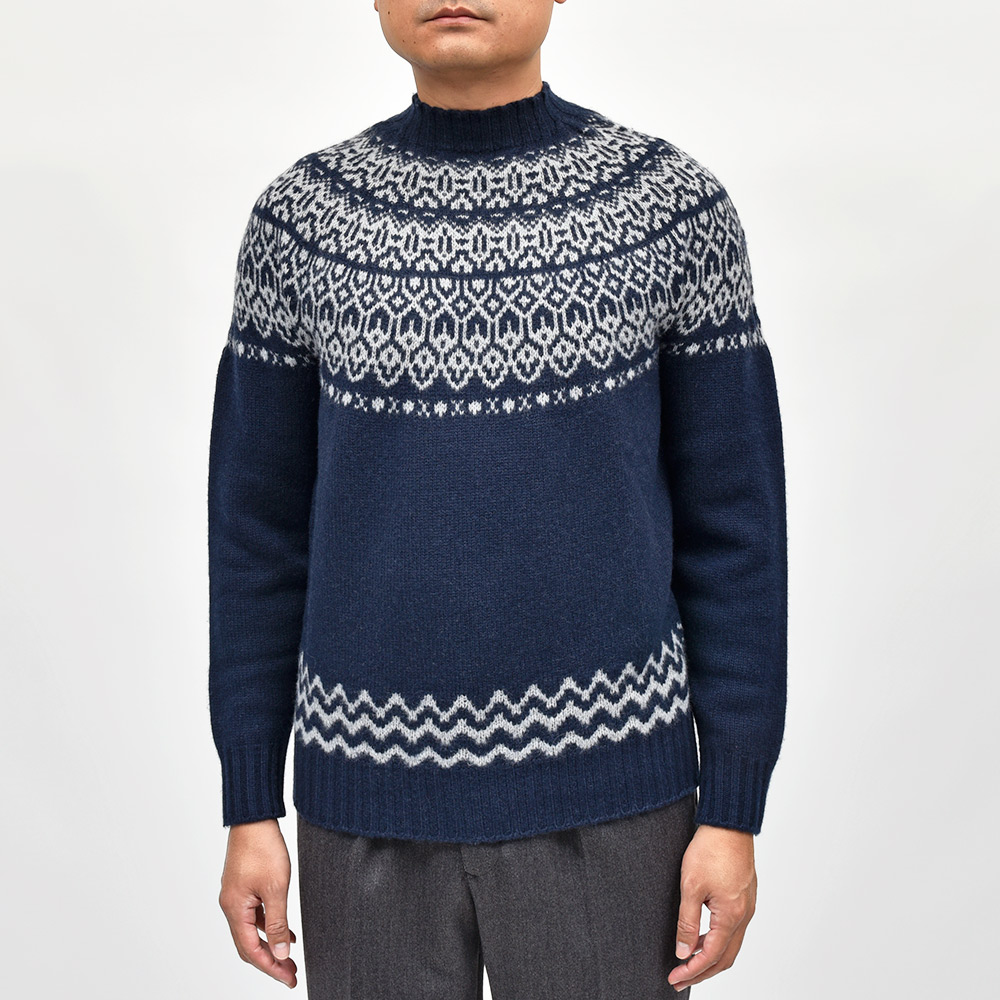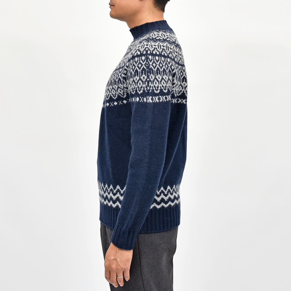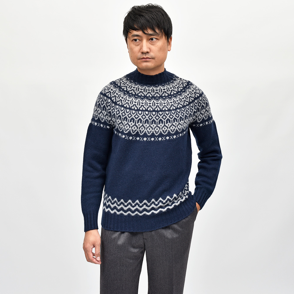 カシミヤを使用したフェアアリル柄のモックネックニット。カシミヤらしいふんわりとしたエアリーな質感に、非常に柔らかなタッチがラグジュアリーな雰囲気です。少しグレイッシュなネイビーをベースに、ライトグレーでフェアアイル柄を表現。ネックはリブ幅のあるモックネックに近い高さとなっており、少しモダンな佇まいを作り上げています。