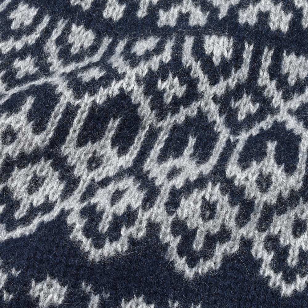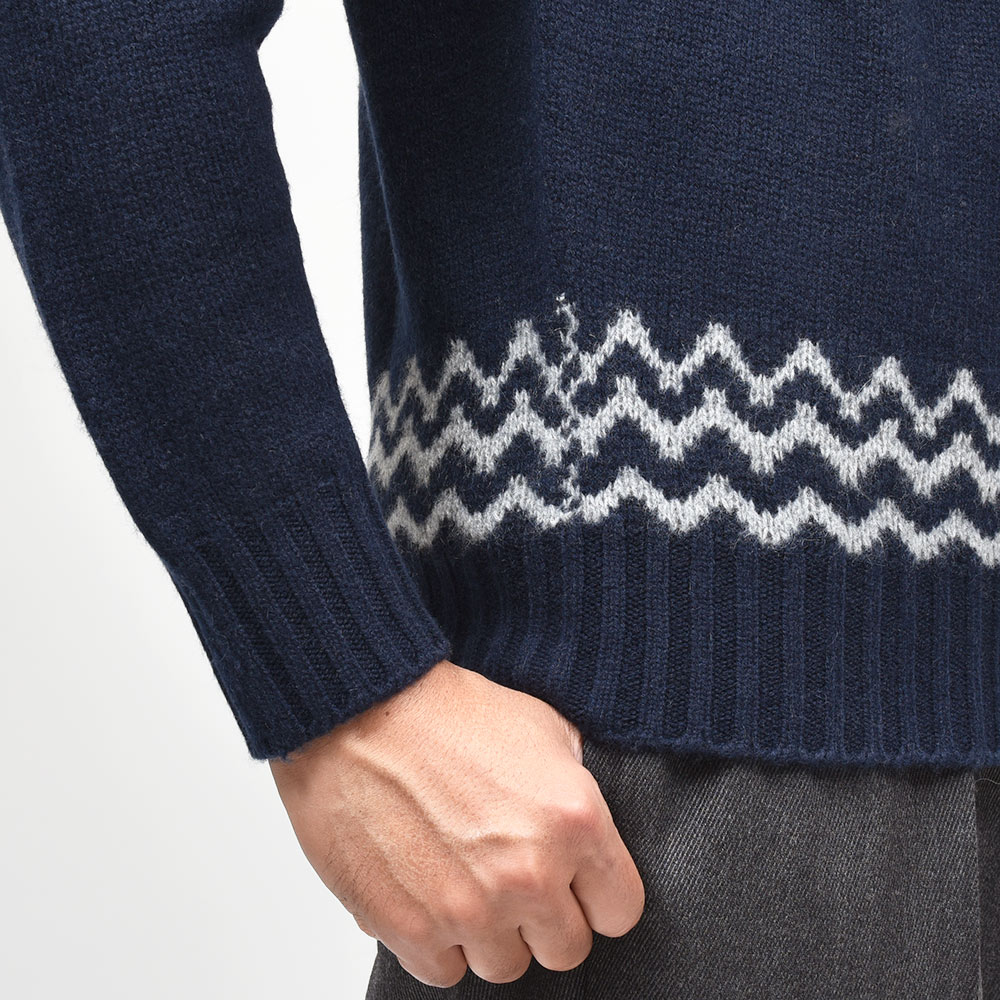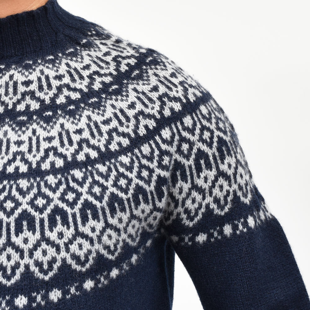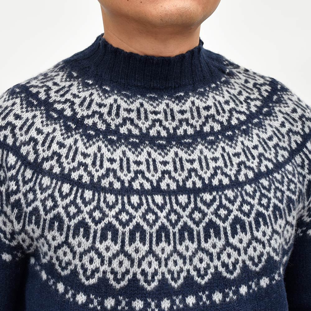 カシミヤを使用したフェアアリル柄のモックネックニット。カシミヤらしいふんわりとしたエアリーな質感に、非常に柔らかなタッチがラグジュアリーな雰囲気です。少しグレイッシュなネイビーをベースに、ライトグレーでフェアアイル柄を表現。ネックはリブ幅のあるモックネックに近い高さとなっており、少しモダンな佇まいを作り上げています。